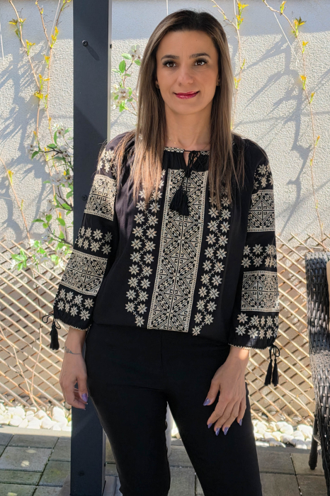 Ie din panza de bumbac 100%, Broderie cusuta la masina. Culoare: alba cu broderie neagra Marimi disponibile: S -100cm circumferinta bustului, 65 cm lungime, M -105cm circumferinta bustului, 65 cm lungime, L , 110cm circumferinta bustului, 66 cm lungime,...