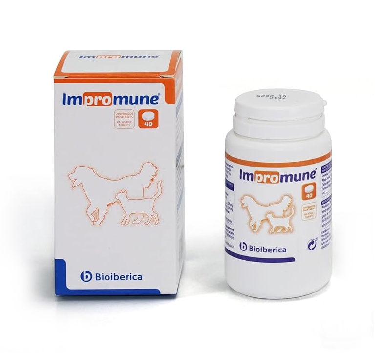 Impromune - Supliment nutritional pentru caini si pisici ce ajuta la optimizarea si cresterea raspunsului imunitar Compozitie: Nucleotide (Nucleoforce), Lentinus edodes, Stearat de magneziu IMPROMUNE este un supliment nutritiv recomandat pentru caini si pisici pentru optimizarea raspunsului imun. Recomandat pentru folosirea la caini si pisici compromisi din punct de vedere imun, in cazuri cum ar fi: afectiuni virale la catei si pisoi, imbunatatirea raspunsului terapeutic in cazuri de leshmanioza si imunodeficienta felina, animale care sunt supuse tratamentului cu citostatice, pentru imbunatatirea raspunsului vaccinal, situatii in care este afectata integritatea mucoasei digestive sau respiratorii, tratamente prelungite cu antibiotice, postoperator. Administrarea Impromune este usoara datorita palatabilitatii excelente. Datorita formei, tabletele pot fi divizate pentru a putea fi usor inghitite de animale de talie mica. Impromune se administreaza oral, o data pe zi, timp de 30 de zile. Perioada de administrare se poate extinde, dependent de fiecare caz in parte, evolutia animalului si decizia medicului veterinar. Greutatea animalului / Nr de tablete pe zi: 26 kg - 2. Impromune nu produce efecte secundare.