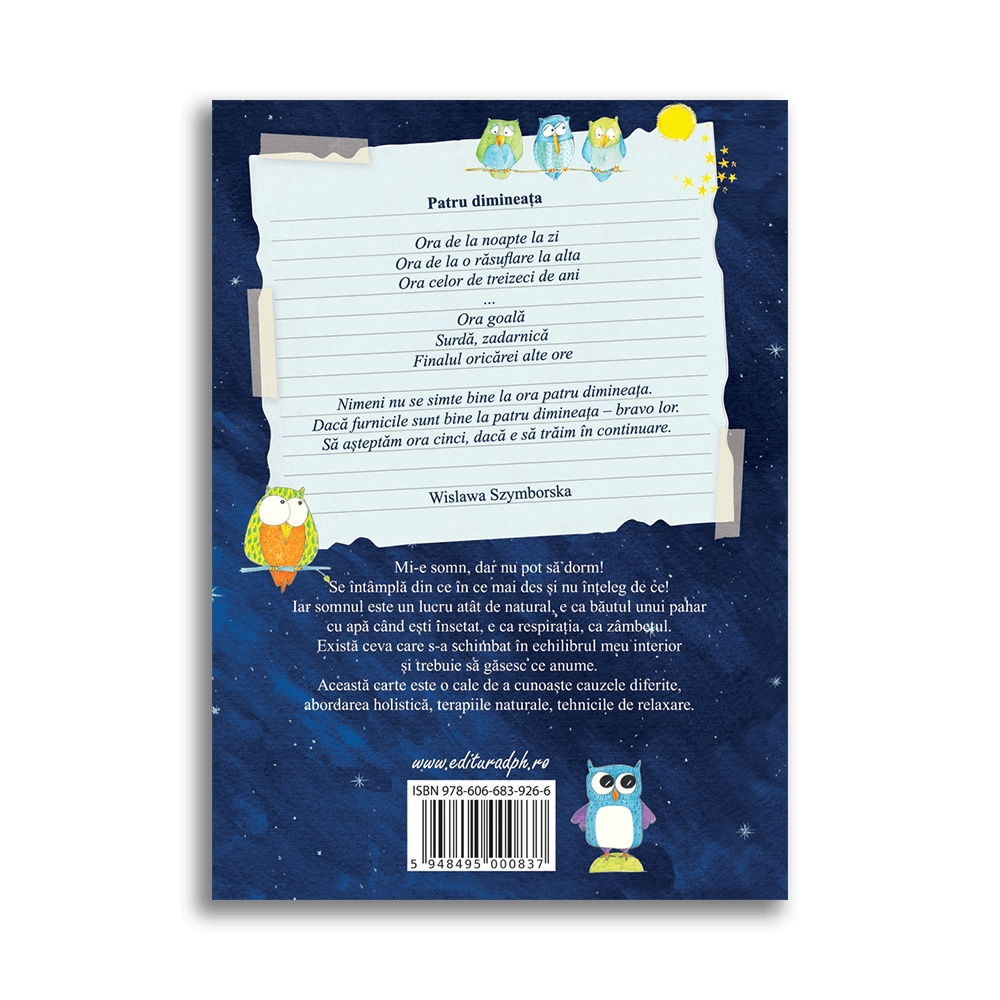 Mi-e somn, dar nu pot să dorm! Se întâmplă din ce în ce mai des și nu înțeleg de ce! Iar somnul este un lucru atât de natural, e ca băutul unui pahar cu apă când ești însetat, e ca respirația, ca zâmbetul. Există ceva care s-a schimbat în echilibrul meu interior și trebuie să găsesc ce anume. Această carte este o cale de a cunoaște cauzele diferite, abordarea holistică, terapiile naturale și tehnicile de relaxare. Specificații Pagini: 100 Mărimi: 15 x 21 cm Copertă: Necartonată