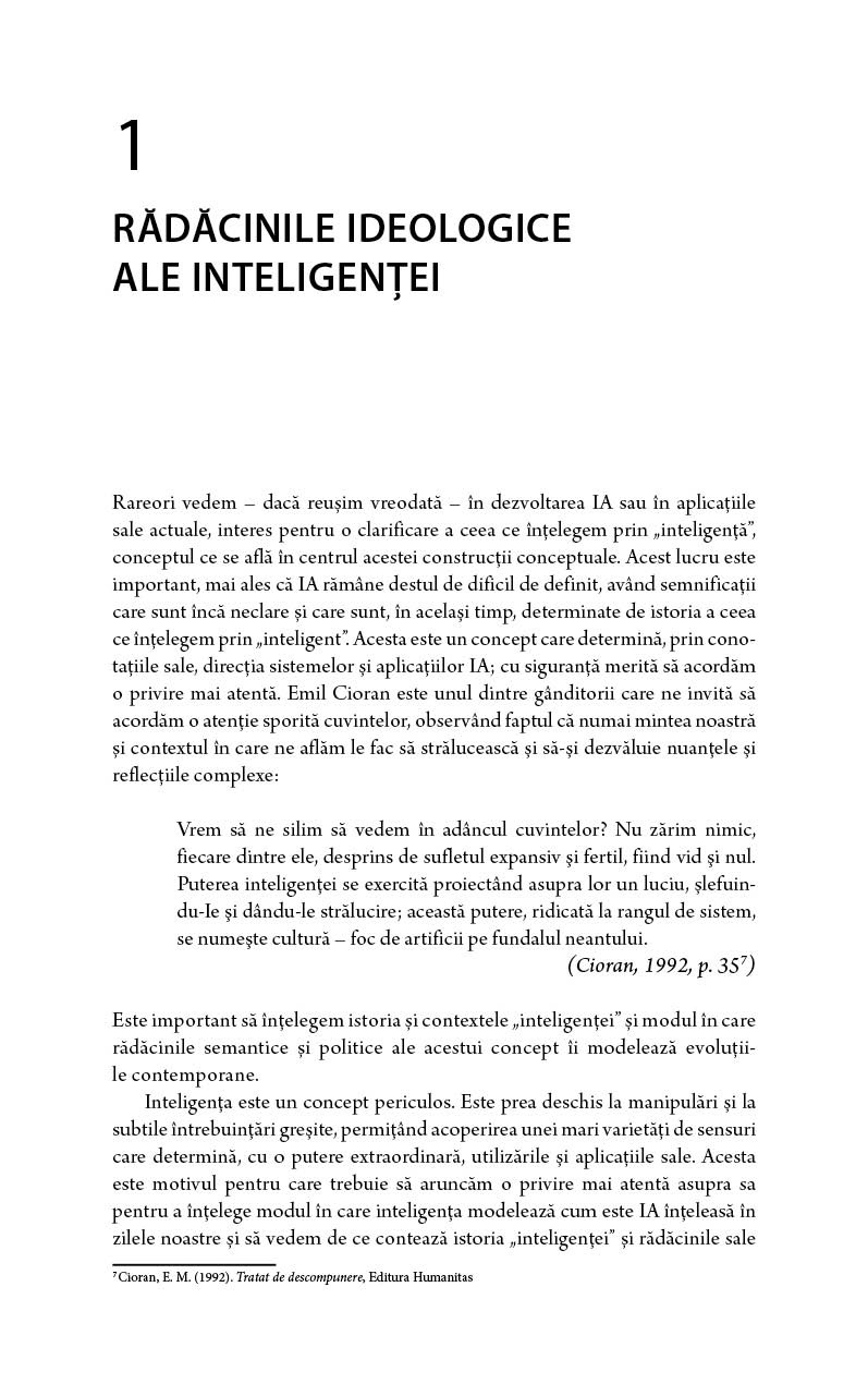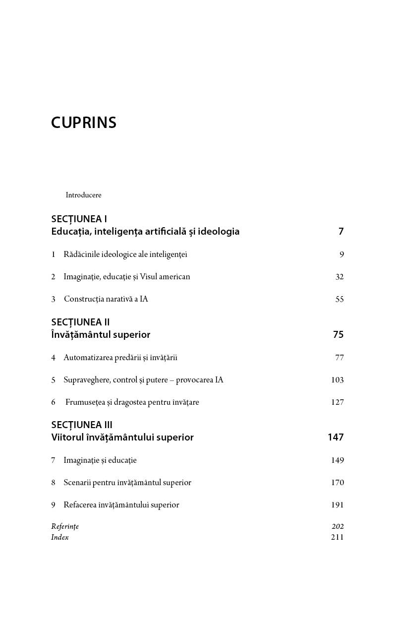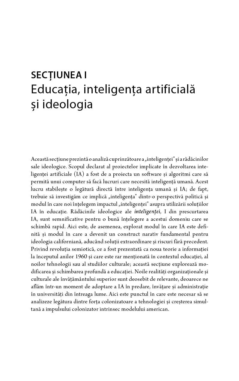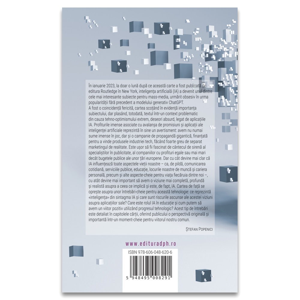 Cu cât devine mai clar că IA influențează toate aspectele vieții noastre – ca, de pildă, comunicarea cotidiană, serviciile publice, educație, locurile noastre de muncă și cariera personală, precum și alte aspecte-cheie pentru viața fiecăruia dintre noi – cu atât devine mai important să avem o viziune mai completă, profundă și realistă asupra unor întrebări-cheie pentru această tehnologie: ce reprezintă “inteligența” din sintagma IA și care sunt riscurile ascunse ale acestei viziuni asupra aplicațiilor sale? Care este rolul IA în educație și cum putem să avem un viitor pozitiv utilizând procesul tehnologic? Acest tip de întrebări este detaliat în capitolele cărții, oferind publicului o perspectivă originală și importantă într-un moment-cheie pentru viitorul nostru comun. În ianuarie 2023, la doar o lună după ce această carte a fost publicată de editura Routledge în New York, inteligența artificială (IA) a devenit unul dintre cele mai interesante subiecte pentru mass-media, urmărit obsesiv în urma popularității fără precedent a modelului generativ ChatGPT. A fost o coincidență fericită, cartea scoțând în evidență importanța subiectului. Despre autor: Ștefan Popenici este conducător academic pentru Inițiative în asigurarea calității la Universitatea Charles Darwin, Australia. Caracteristici: Pagini: 224 Mărimi: 13,5*21,5 Autori: Ștefan Popenici Copertă: Necartonată Grupa de vârstă: 18 ani +