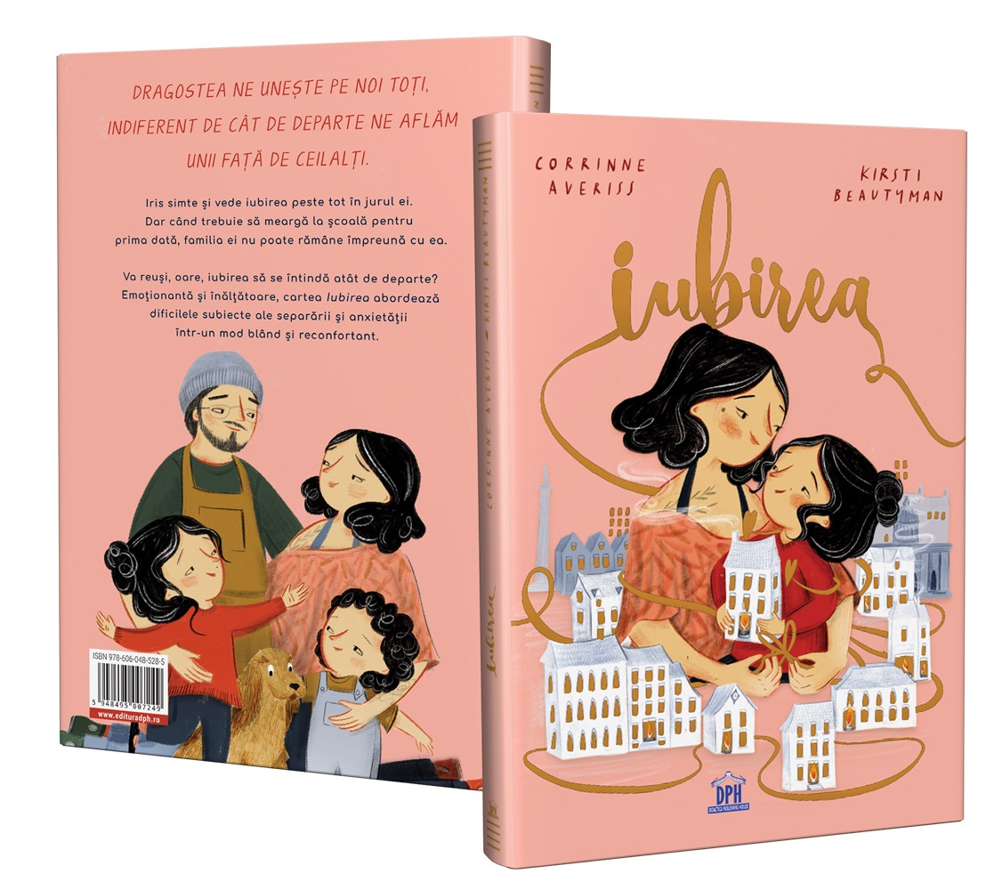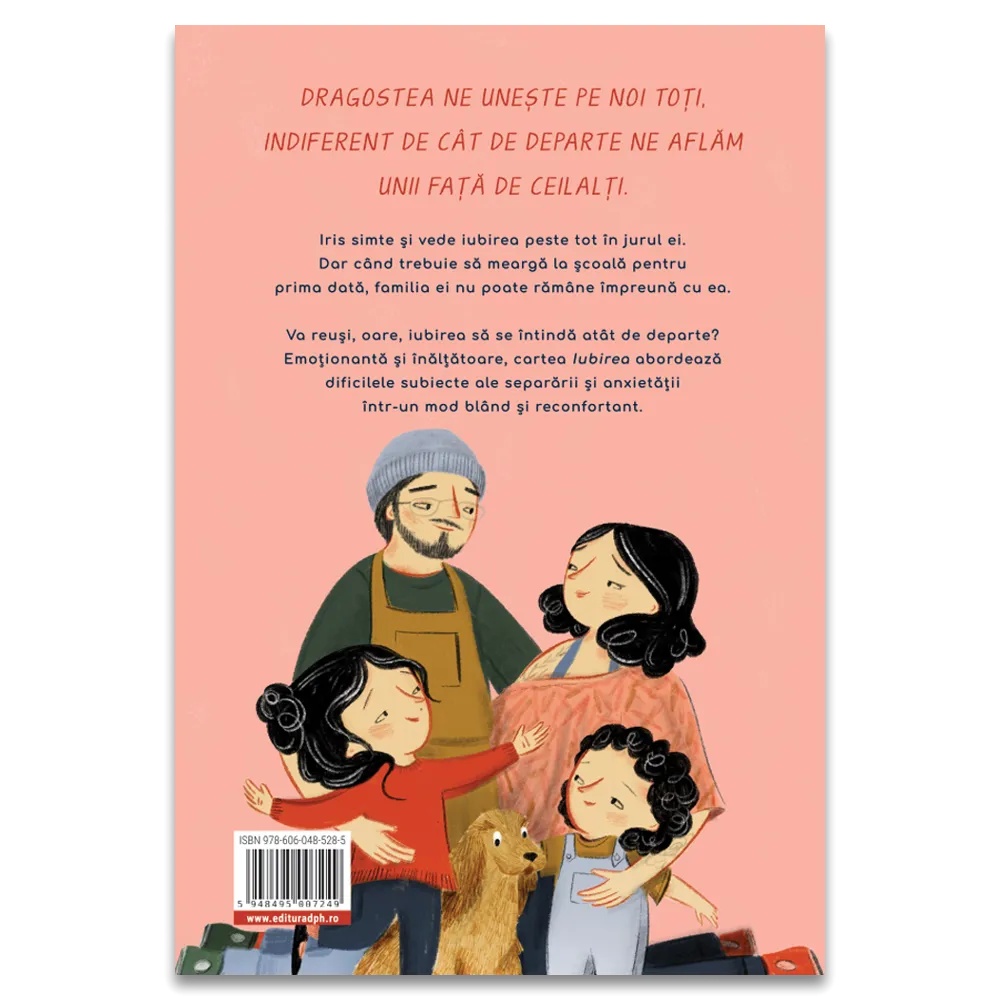 Dragostea ne unește pe noi toți, indiferent de cât de departe ne aflăm unii față de ceilalți. Iris simte și vede iubirea peste tot în jurul ei. Dar când trebuie să meargă la școală pentru prima dată, familia ei nu poate rămâne împreună cu ea. Va reuși, oare, iubirea să se întindă atât de departe? Emoționantă și înălțătoare, cartea Iubirea abordează dificilele subiecte ale separării și anxietății într-un mod blând și reconfortant. Despre autor: Corrinne Averiss a crescut în Midlands, a studiat literatura engleză în St. Andrews și s-a stabilit într-un orășel între Manchester și Peak District împreună cu soțul, fiica și pisica ei. Corrinne este scriitoare și producător de televiziune pentru copii. O competiție creată de ea pentru CiTV, numită Share a Story (Împărtășește o poveste!), a primit patru premii BAFTA pentru copii. Are zece titluri publicate pentru Andersen Press, Egmont, Oxford University Press, Quarto, Stripes și Hachette, iar cărțile ei au câștigat, de-a lungul timpului, premii importante. Caracteristici: Pagini: 32 Mărimi: 23.5 x 29 Autor: Corrinne Averiss Copertă: Cartonată