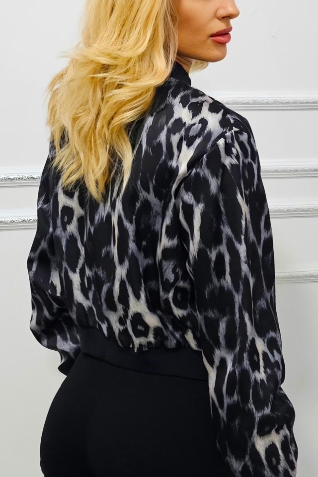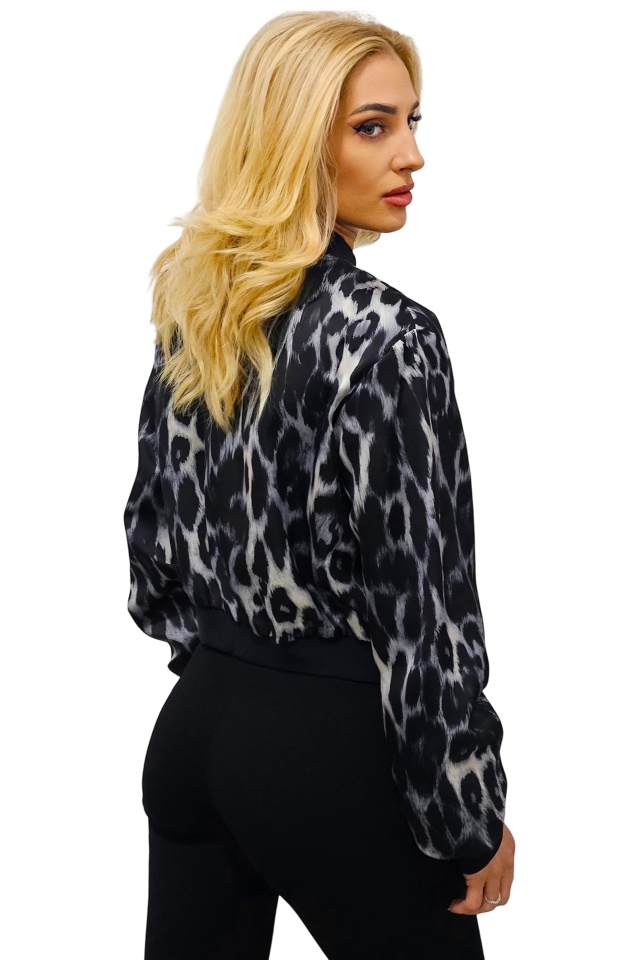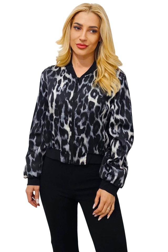 Jacheta bomber leopard print Shayen, cu inchidere de tip fermoar, Negru, Marime S/M Caracteristici: - jacheta lejera cu fermoar - croiala scurta bomber - captuseala satinata subtire - imprimeu divers cromatic animal print - mansete contrastante, elastice la extremitati Compozitie material: 100% poliester Marimea universala S/M compatibila cu masurile S sau M! Eticheta produsului conține informații esențiale referitoare la întreținerea și spălarea corectă a articolelor vestimentare. Imaginile Fashionforyou au caracter informativ, iar nuanta, tonul si intensitatea culorii pot varia in functie de monitor/ecran telefon.