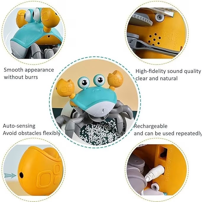 Jucăria interactivă în formă de crab este concepută pentru a stimula curiozitatea și dezvoltarea copilului prin joacă activă. Datorită mișcării automate crabulețul se deplasează singur, ceea ce îi menține pe cei mici captivați și încurajează urmărirea și mișcarea. Este realizată din materiale sigure, cu margini rotunjite, fiind potrivită pentru copiii cu vârsta de peste 18 luni. Ideală atât pentru joaca individuală, cât și pentru activități interactive alături de părinți, această jucărie transformă fiecare moment de joacă într-o experiență educativă și distractivă.