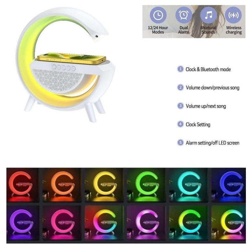 Statie incarcare wireless multifunctionala cu Lampa LED RGB, Boxa Bluetooth, Ceas, 3 functii in 1 cu lampa RGB si boxa bluetooth, Hands-Free, Control si prin Aplicatie, Alb Lampa inteligentă 3 în 1 RGB este un dispozitiv multifuncțional care combină iluminatul ambiental, încărcarea rapidă fără fir și divertismentul audio într-un singur produs. Cu o serie de caracteristici inovatoare, este un companion versatil pentru orice spațiu, de la dormitor până la birou sau living. Caracteristici:Încărcare rapidă fără fir 15W: Această lampă inteligentă dispune de tehnologie de încărcare rapidă fără fir, oferind o soluție comodă și eficientă pentru încărcarea dispozitivelor compatibile cu Qi.Boxă integrată cu conectivitate Bluetooth/FM/Card, Stick: Cu o boxă integrată, această lampă permite redarea muzicii prin Bluetooth, radio FM sau direct de pe cardul de memorie sau un stick USB, oferind multiple opțiuni de divertisment audio.Două difuzoare: Dispune de două difuzoare pentru un sunet stereo clar și puternic, oferind o experiență auditivă de înaltă calitate.Ceas digital cu alarmă: Funcția de ceas digital cu alarmă îți permite să te trezești în fiecare dimineață la timp și într-un mod plăcut.Luminozitate reglabilă: Poți ajusta luminozitatea lămpii conform preferințelor tale, de la o lumină moale pentru relaxare la o lumină mai intensă pentru activități de lucru.16 milioane culori RGB: Cu posibilitatea de a alege dintr-o paletă impresionantă de 16 milioane de culori, poți personaliza iluminatul în funcție de starea ta de spirit sau de atmosfera dorită.360° SURROUND SOUND: Dispune de tehnologie audio avansată pentru a oferi un sunet surround captivant din toate direcțiile.Iluminare pe ritmul muzicii: Lampa poate sincroniza lumina cu ritmul muzicii, creând un efect vizual impresionant și captivant în timpul audiției.Lumină de trezire ce simulează răsăritul natural: Funcția de lumină de trezire îți permite să te trezești treptat, simțindu-te revigorat și pregătit pentru ziua care începe.Control de pe telefon prin aplicație: Prin intermediul unei aplicații dedicate, poți controla toate funcțiile lămpii direct de pe telefonul tău inteligent, oferindu-ți o experiență de utilizare mai comodă și personalizată.Acumulator 1500mAh: Cu un acumulator puternic, lampa poate fi utilizată fără fir pentru o mobilitate sporită și pentru a fi plasată în orice loc dorit fără a fi legată de o sursă de alimentare.În concluzie, lampa inteligentă 3 în 1 RGB este un dispozitiv multifuncțional care aduce împreună iluminatul, încărcarea fără fir și divertismentul audio într-un singur și elegant produs. Cu funcții inovatoare și un design atrăgător, este un accesoriu perfect pentru a completa orice spațiu și a adăuga o notă de confort și tehnologie în viața ta de zi cu zi.Beneficii:Atmosferă Personalizată: Prin combinarea iluminării LED ajustabile și a opțiunilor de culoare RGB, lampa vă permite să creați o atmosferă personalizată și captivantă în orice încăpere.Divertisment și Utilitate: Cu difuzorul Bluetooth și funcția de încărcare wireless, lampa oferă atât divertisment audio, cât și utilitate practică pentru încărcarea dispozitivelor dvs. mobile.Economie de Spațiu: Designul multifuncțional al lamei elimină necesitatea utilizării mai multor dispozitive separate, economisind spațiu și reducând dezordinea în încăpere.Confort și Relaxare: Funcția de lumină ambientală de noapte creează un mediu relaxant și reconfortant, perfect pentru relaxare și odihnă după o zi lungă.Tehnologie Avansată: Echipată cu tehnologie modernă, lampa vă oferă o experiență de utilizare simplă și intuitivă, satisfăcând nevoile dvs. de iluminare și divertisment.