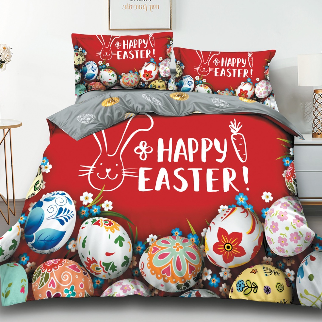 Lenjerie de Pat Dublu, Finet, Imprimeu Digital cu Oua, IDENTIC CU POZA, 4 Piese, Rosu