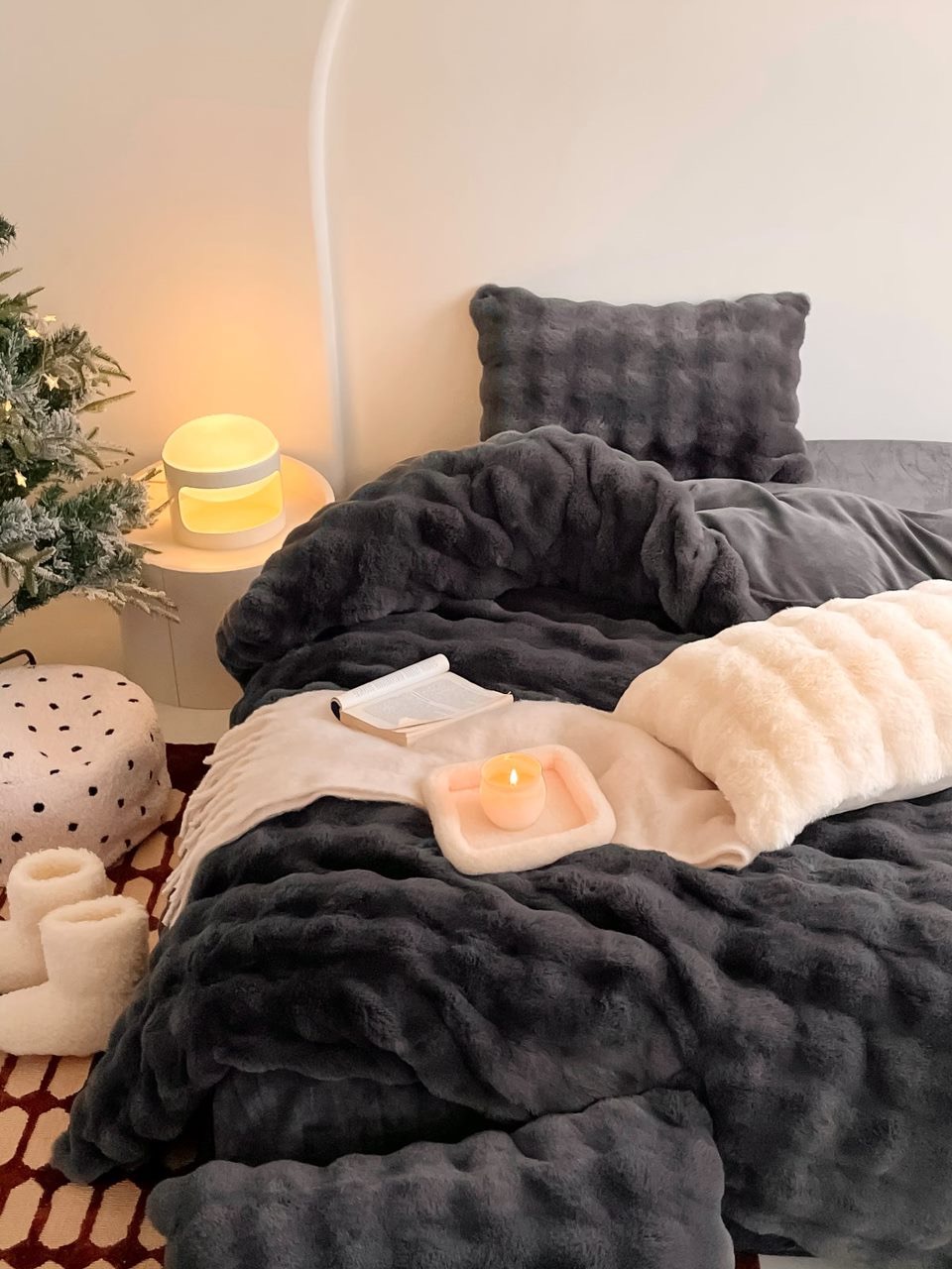 Lenjerie de Pat Dublu, ExtraPufoasa din Blanita Artificiala de Iepure, 4 piese, Gri Antracit – Confort Premium si Eleganta Absoluta