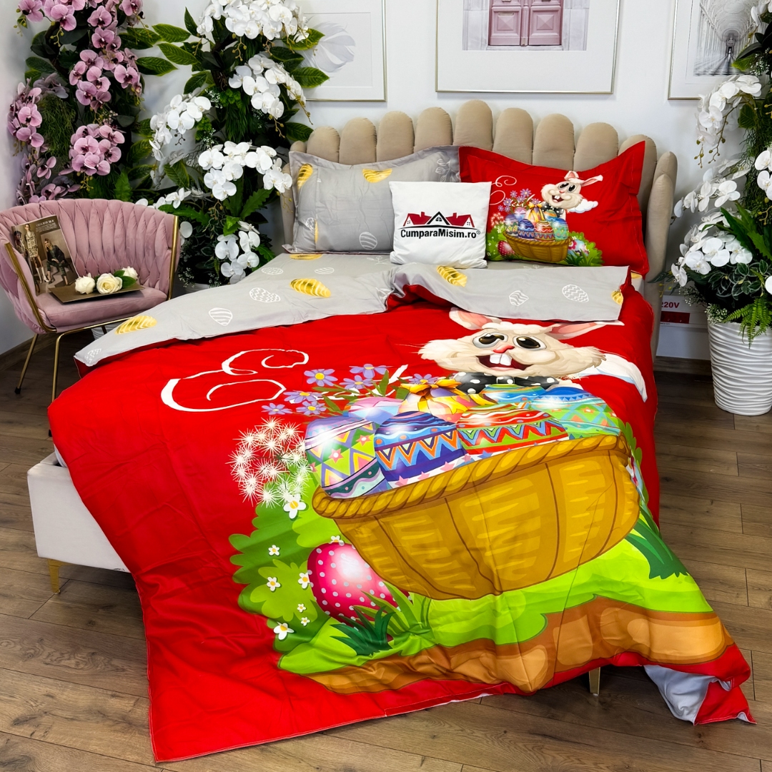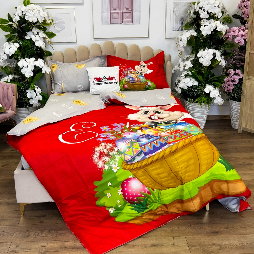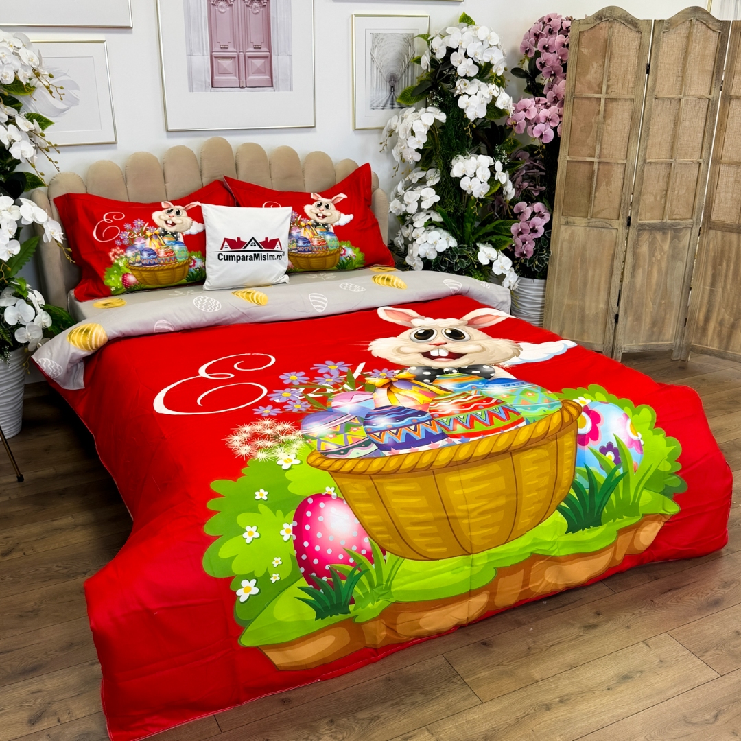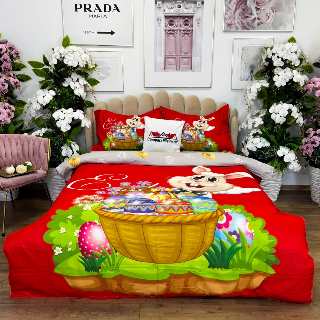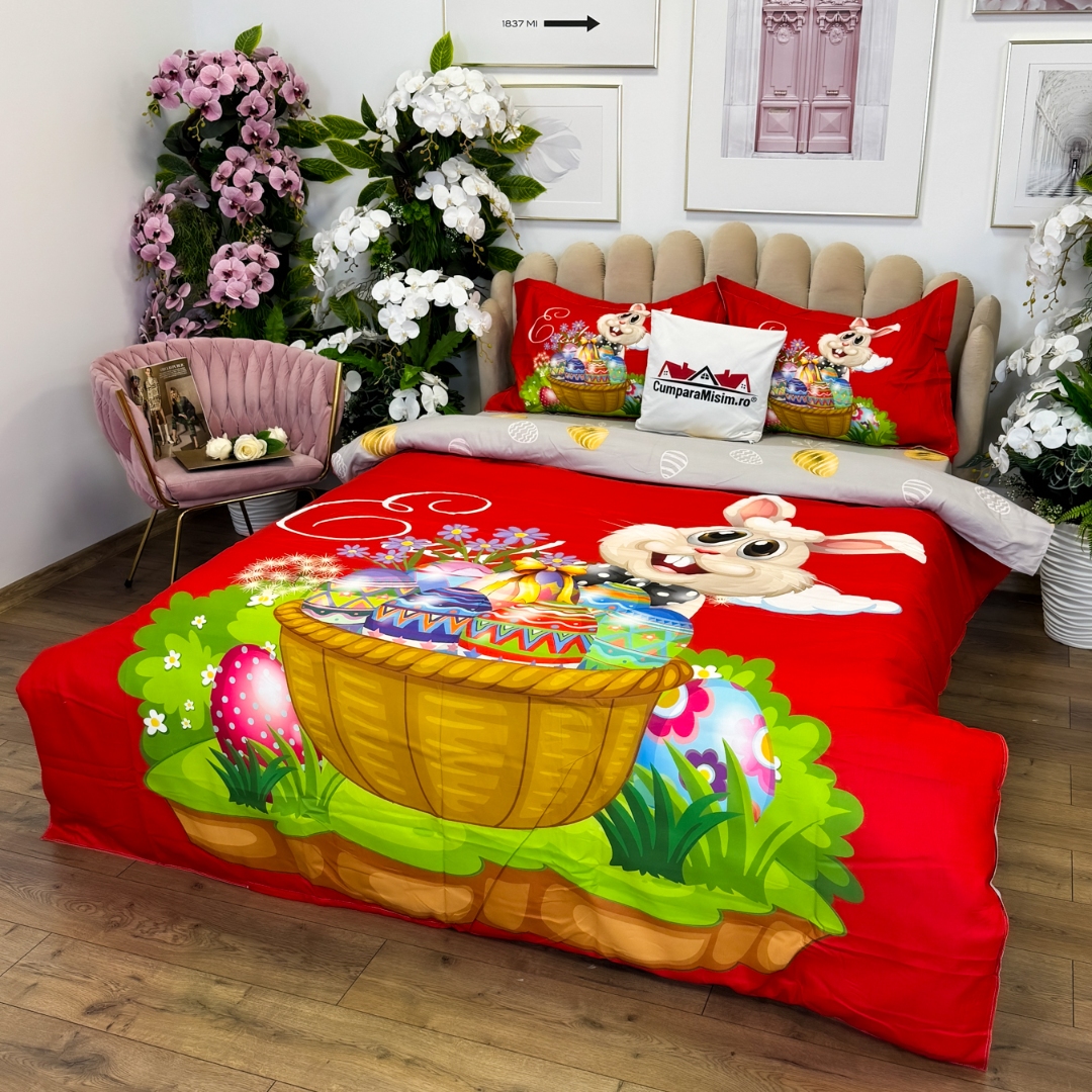 Lenjerie de Pat Dublu, Finet, Imprimeu Digital cu Iepuras si Oua, IDENTIC CU POZA, 4 Piese, Rosu
