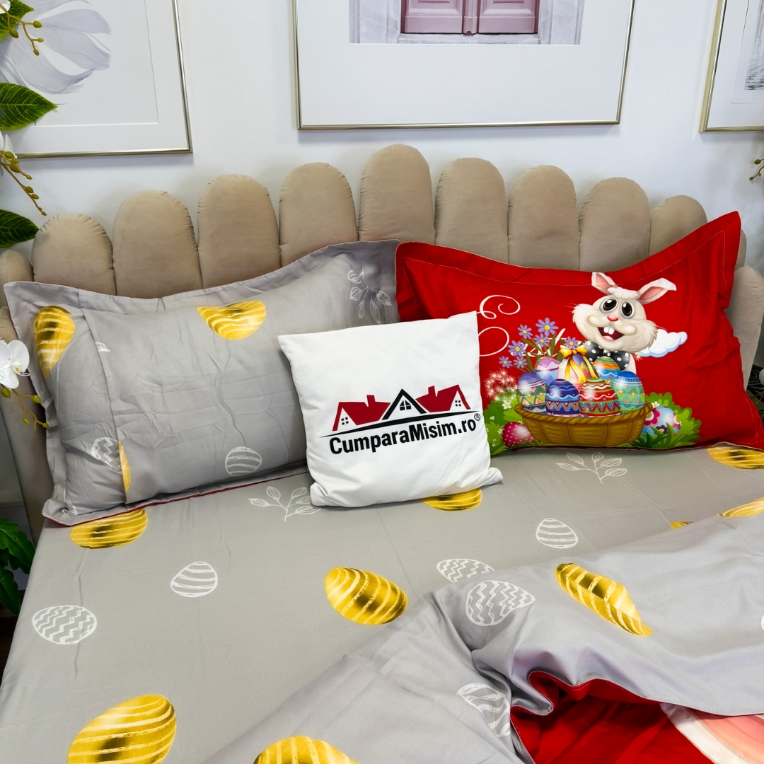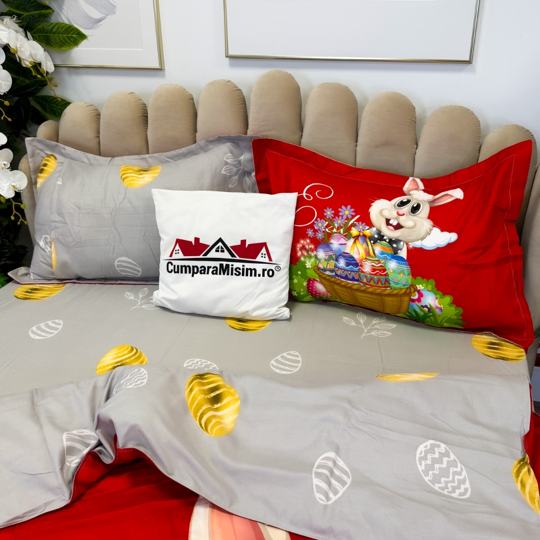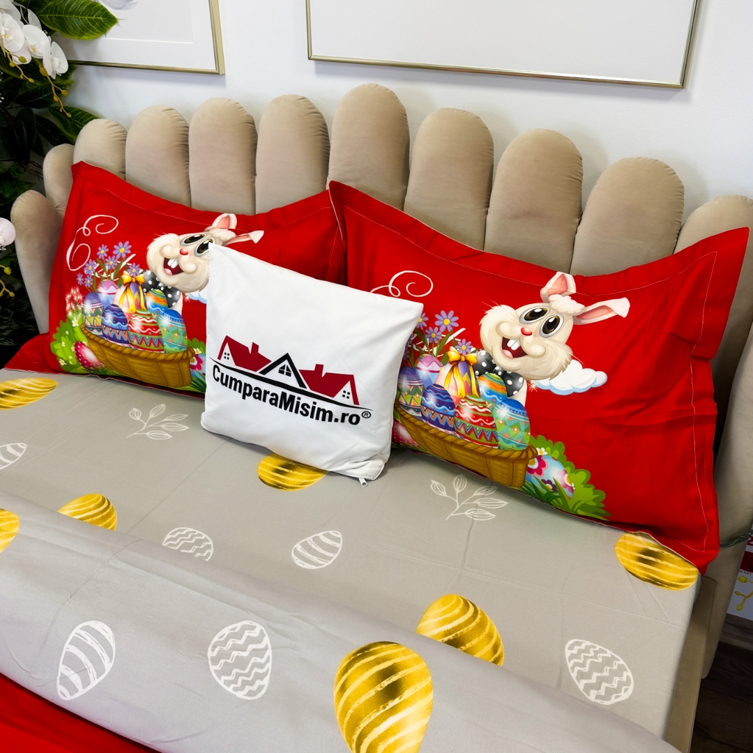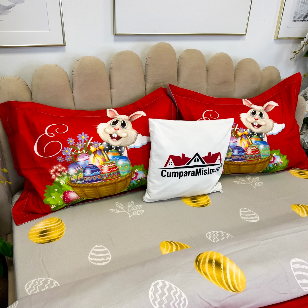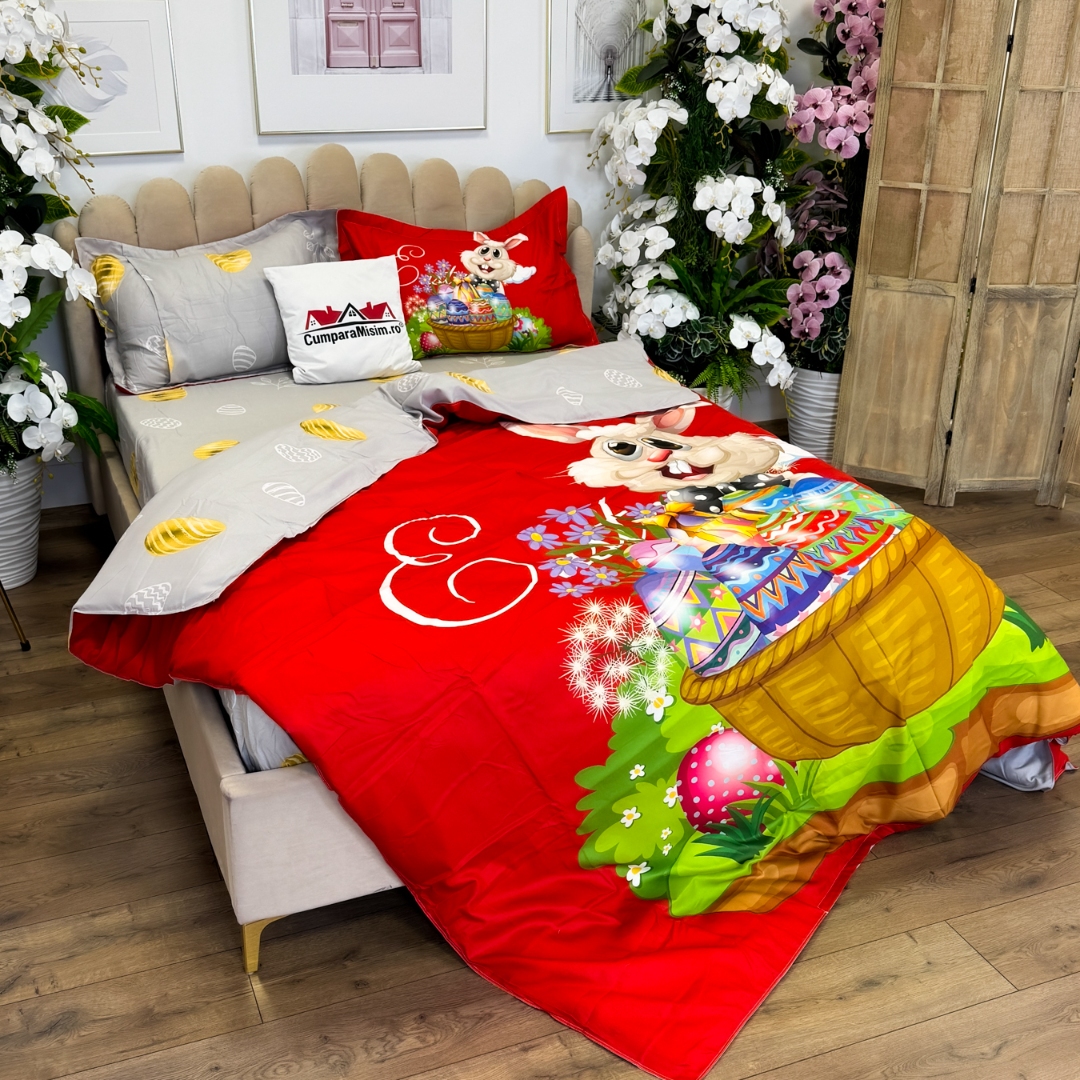 Lenjerie de Pat Dublu, Finet, Imprimeu Digital cu Iepuras si Oua, IDENTIC CU POZA, 4 Piese, Rosu