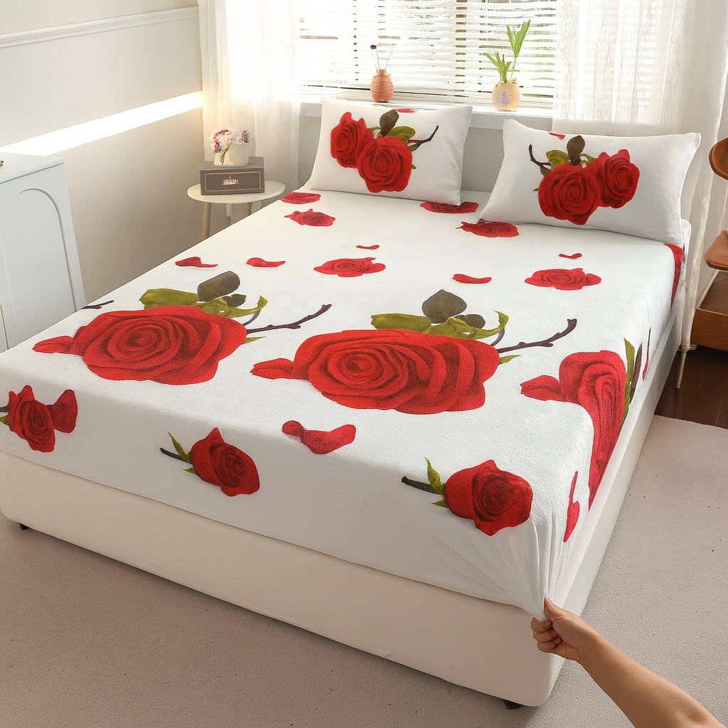 Lenjerie de Pat Dublu, Policoton Ranforsat, 4 piese, Atelier Cumparamisim, Alb, Rosu, buburuze