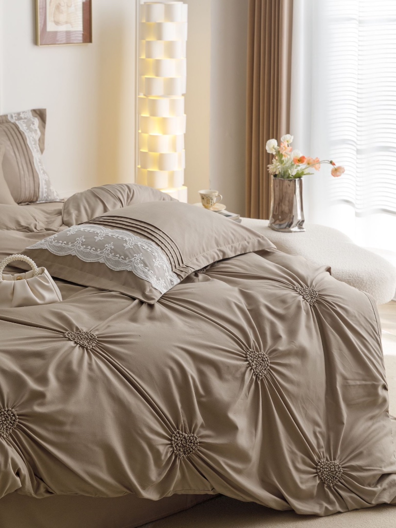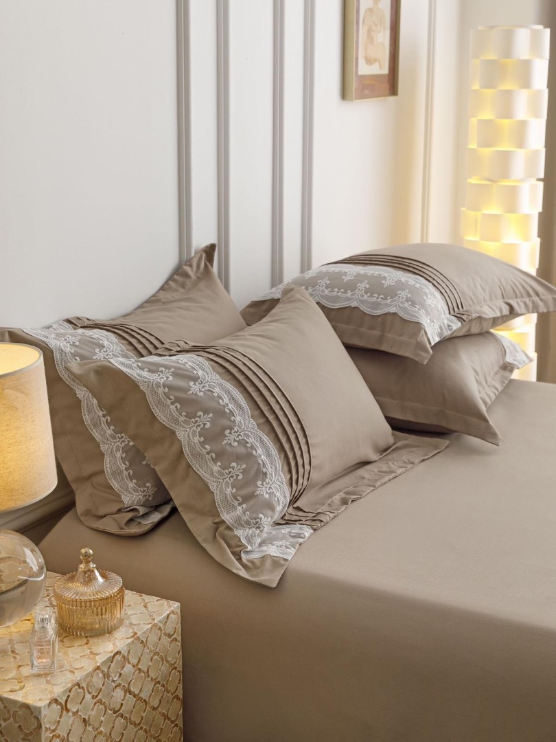 Lenjerie de Pat 6 Piese – Finet Soft Touch cu Pliuri Brodate in forma de Inimioara si Dantela Delicata O lenjerie de pat care imbina eleganta detaliilor brodate cu rasfatul unui material ultra-moale – Finet Soft Touch, acum si mai fin la atingere. Designul cu inimioare brodate si pliuri fine, lucrate atent, este completat de dantela rafinata aplicata pe o latura a fetelor de perna, pentru un efect vizual deosebit si un plus de rafinament in orice dormitor. Material premium: Finet