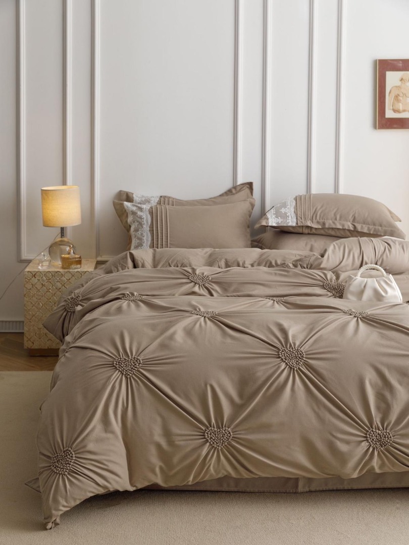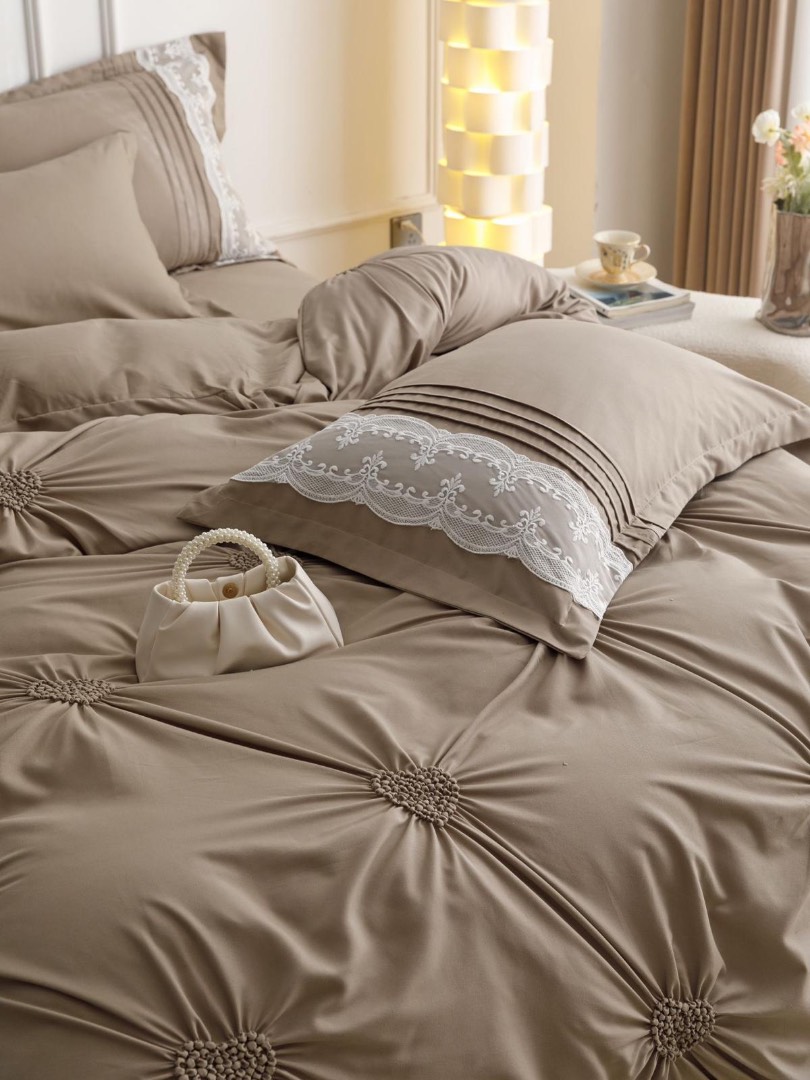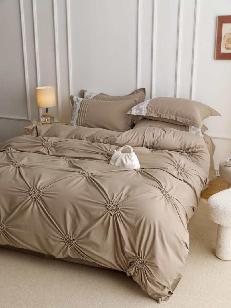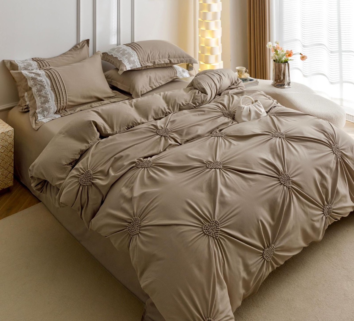 Lenjerie de Pat 6 Piese – Finet Soft Touch cu Pliuri Brodate in forma de Inimioara si Dantela Delicata O lenjerie de pat care imbina eleganta detaliilor brodate cu rasfatul unui material ultra-moale – Finet Soft Touch, acum si mai fin la atingere. Designul cu inimioare brodate si pliuri fine, lucrate atent, este completat de dantela rafinata aplicata pe o latura a fetelor de perna, pentru un efect vizual deosebit si un plus de rafinament in orice dormitor. Material premium: Finet
