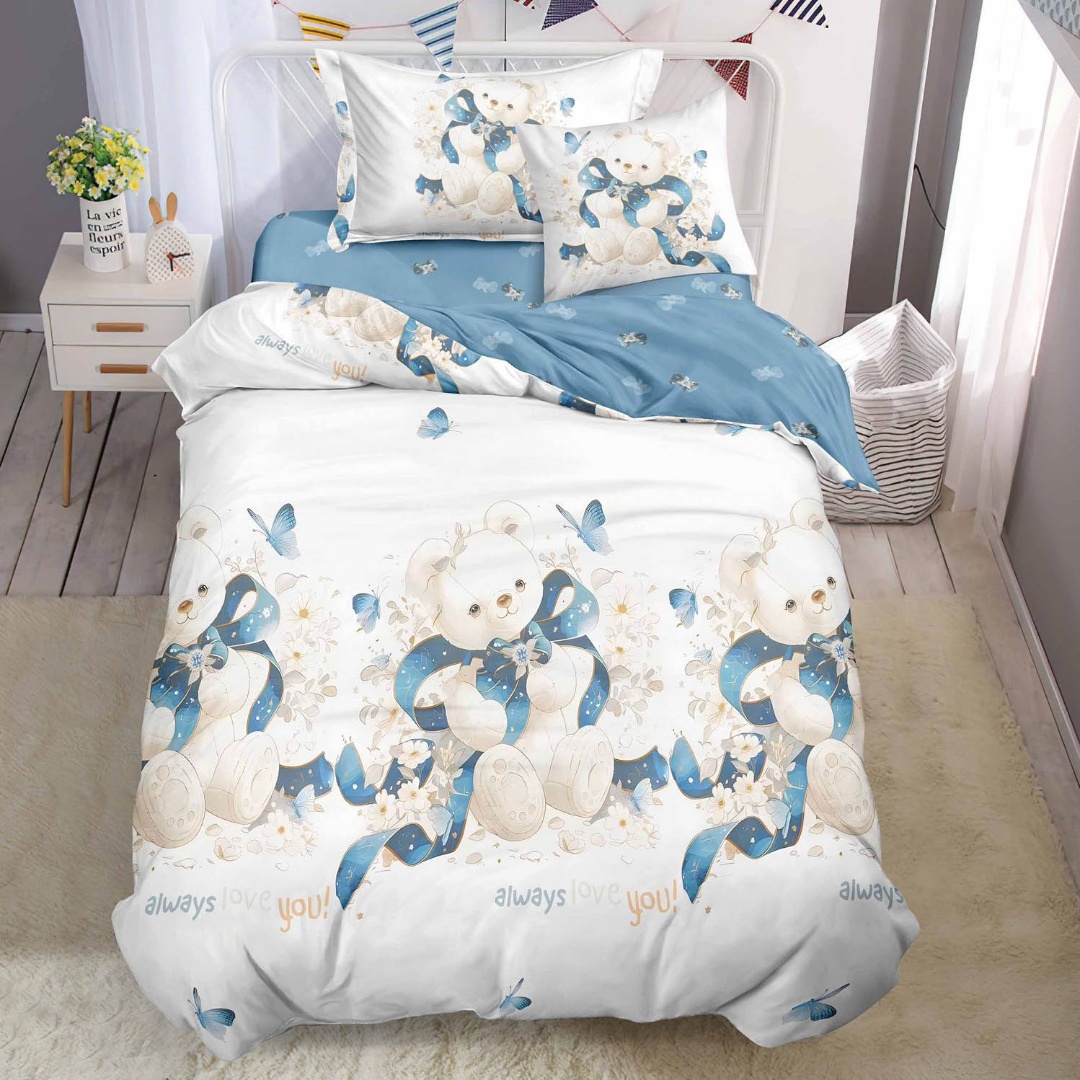 (OFERTA TRIO) Lenjerie pat 1 PERSOANA, FINET, 4 piese, cu ELASTIC, Bleu, ursuleti