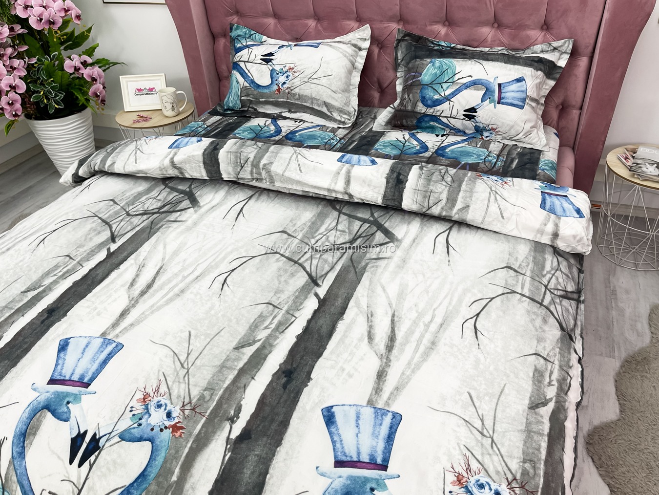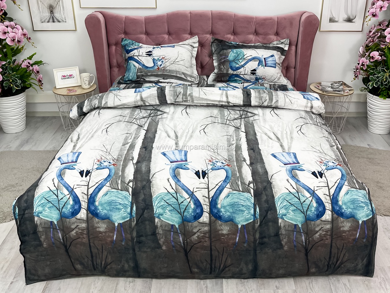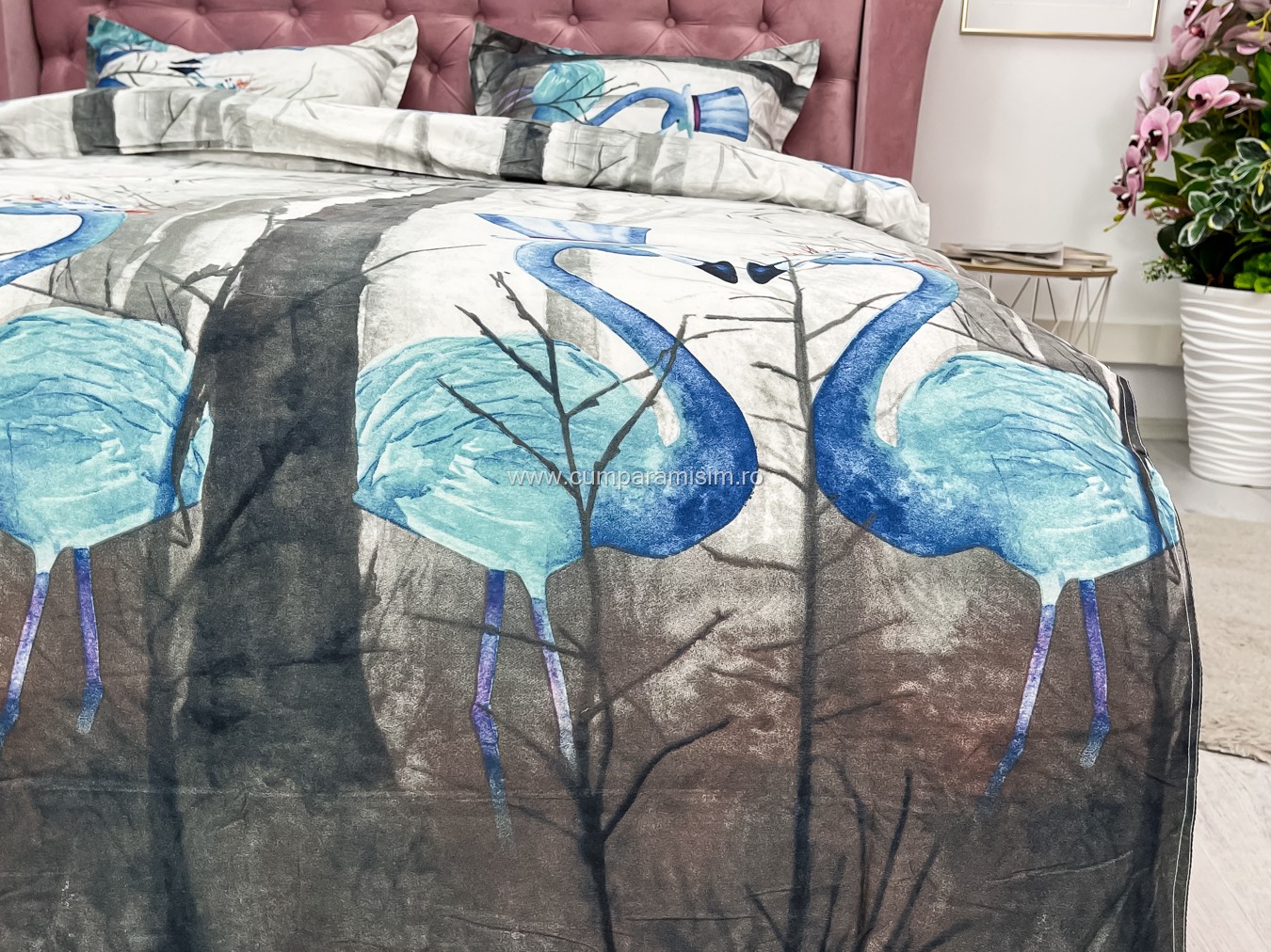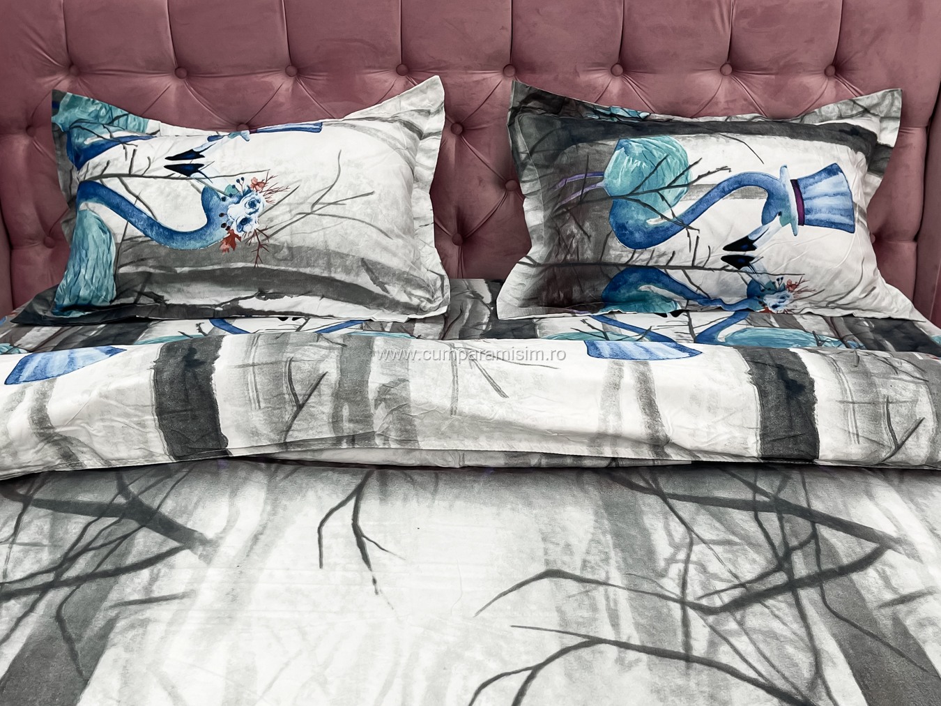 Lenjerie pat dublu, 4 piese, IMPRIMEU 3D Multiplicat, Microfibra, Gri, flamingo