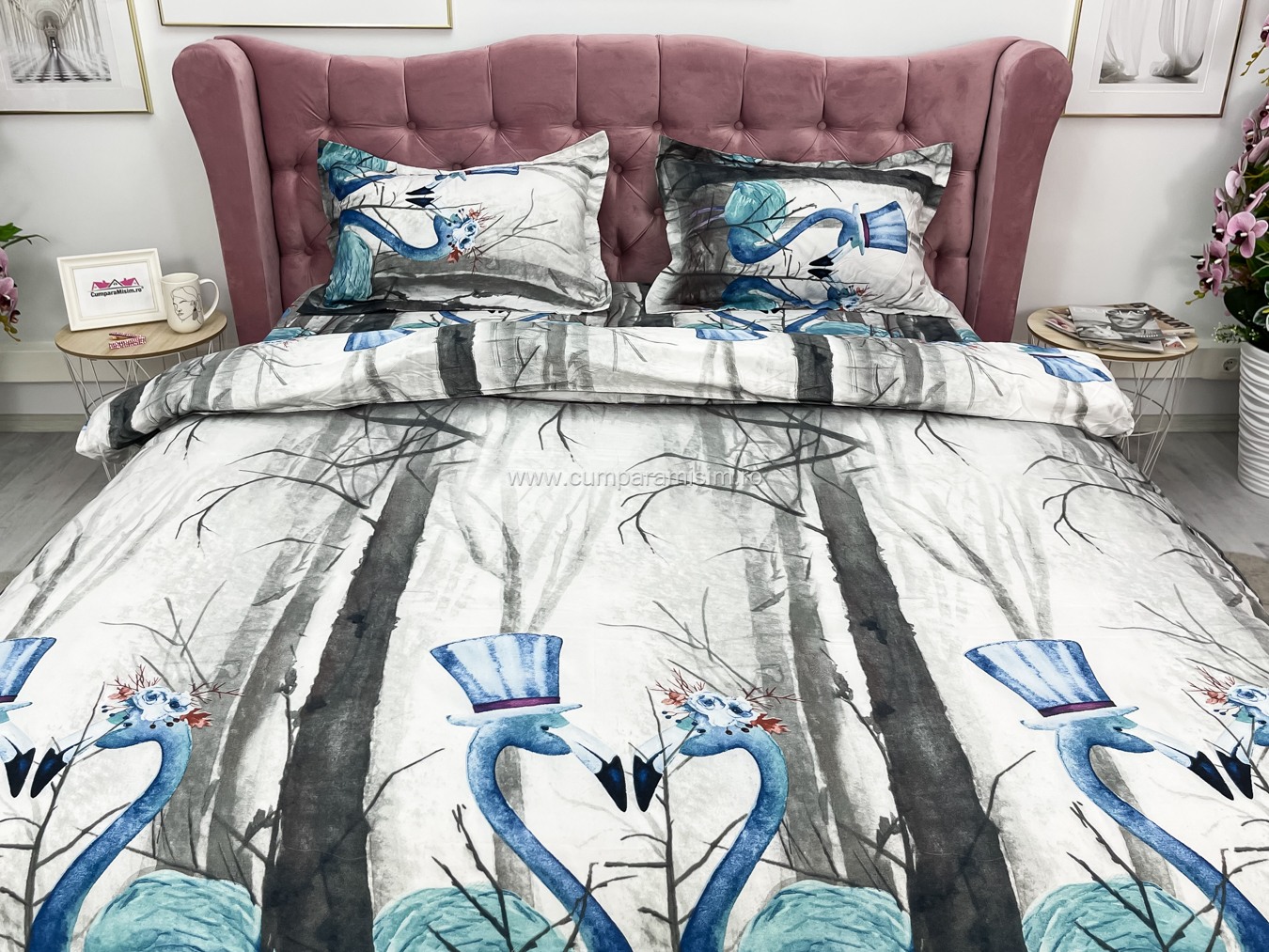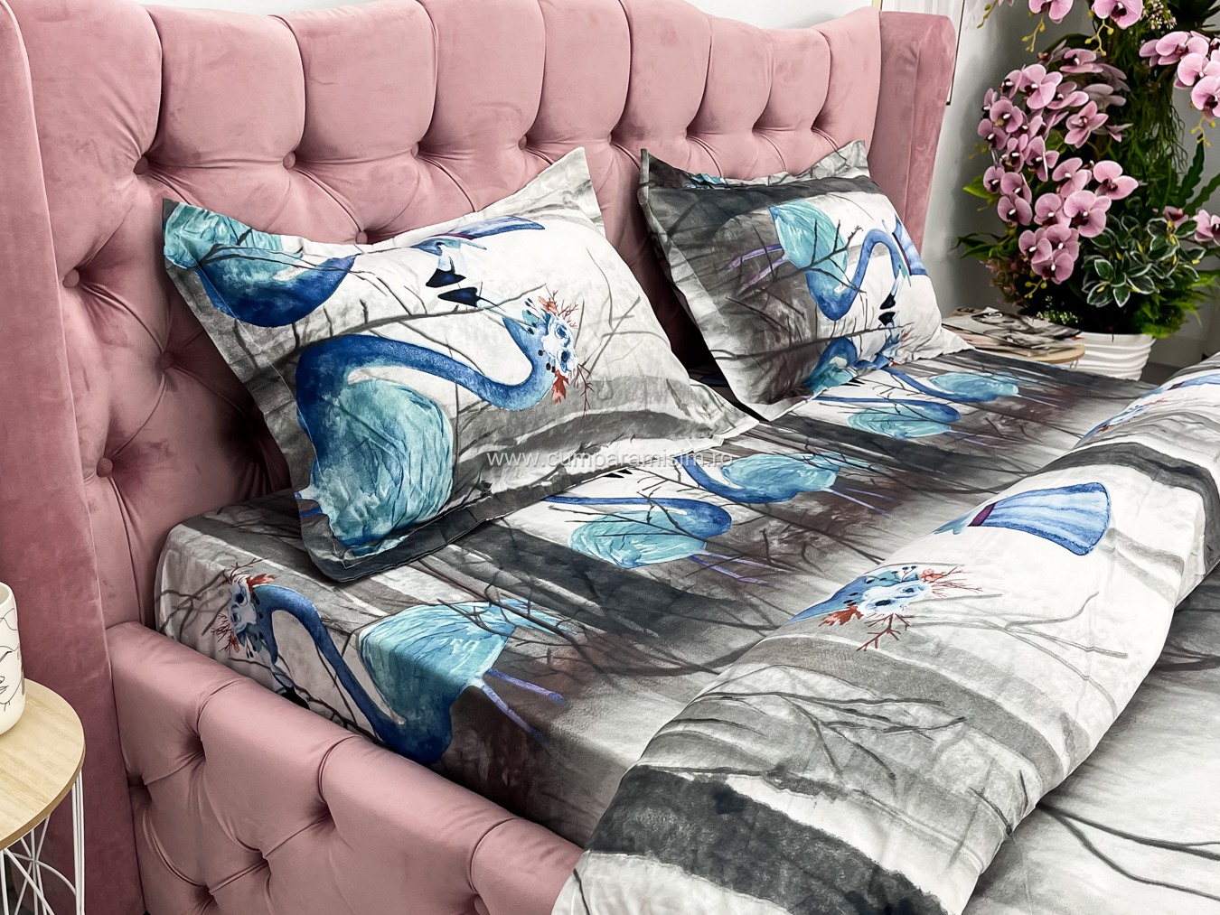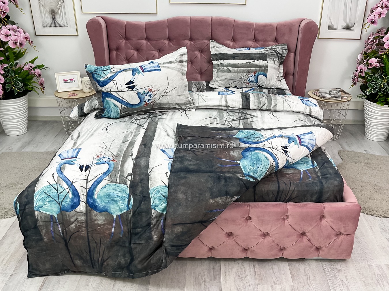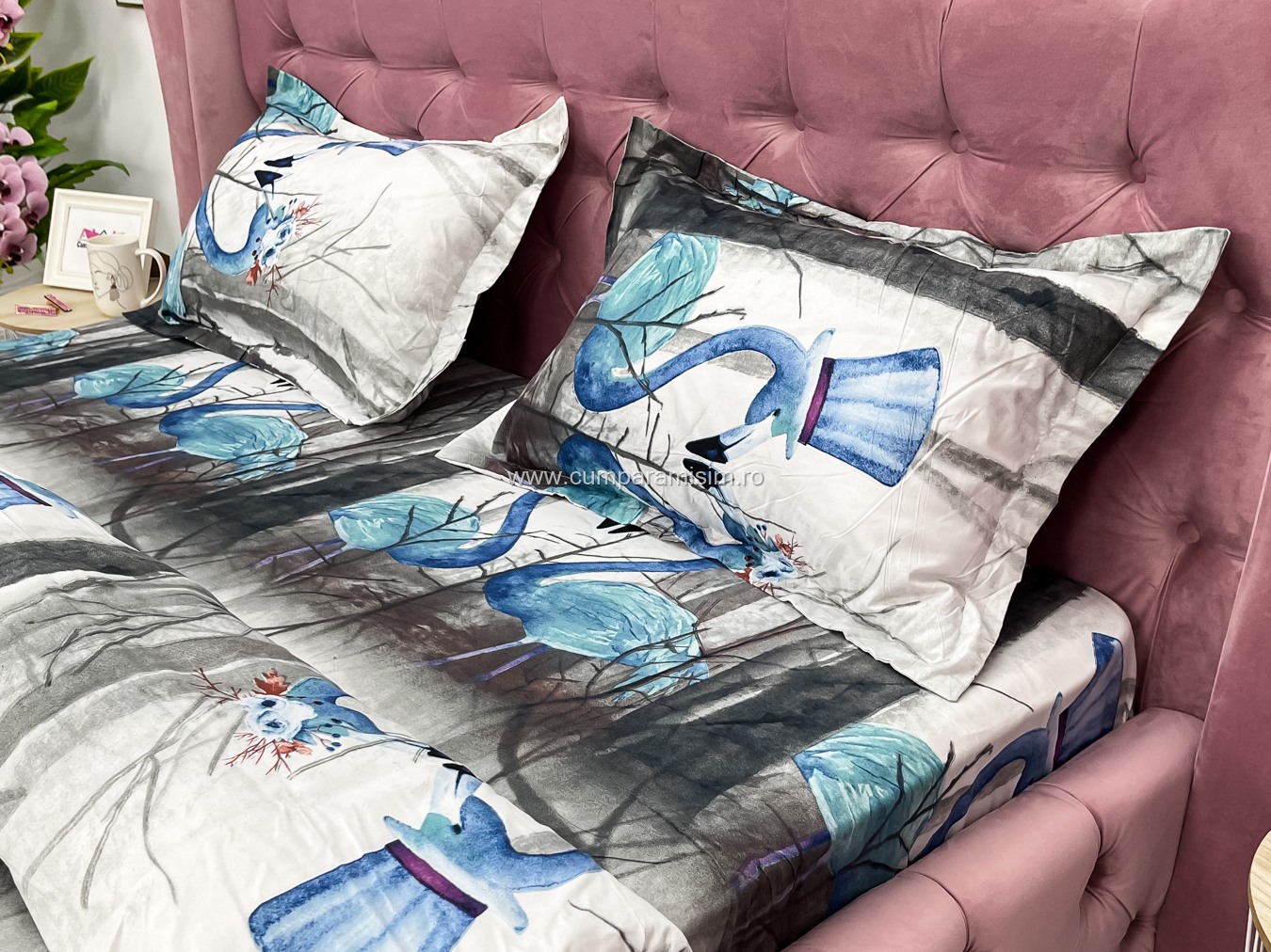 Lenjerie pat dublu, 4 piese, IMPRIMEU 3D Multiplicat, Microfibra, Gri, flamingo