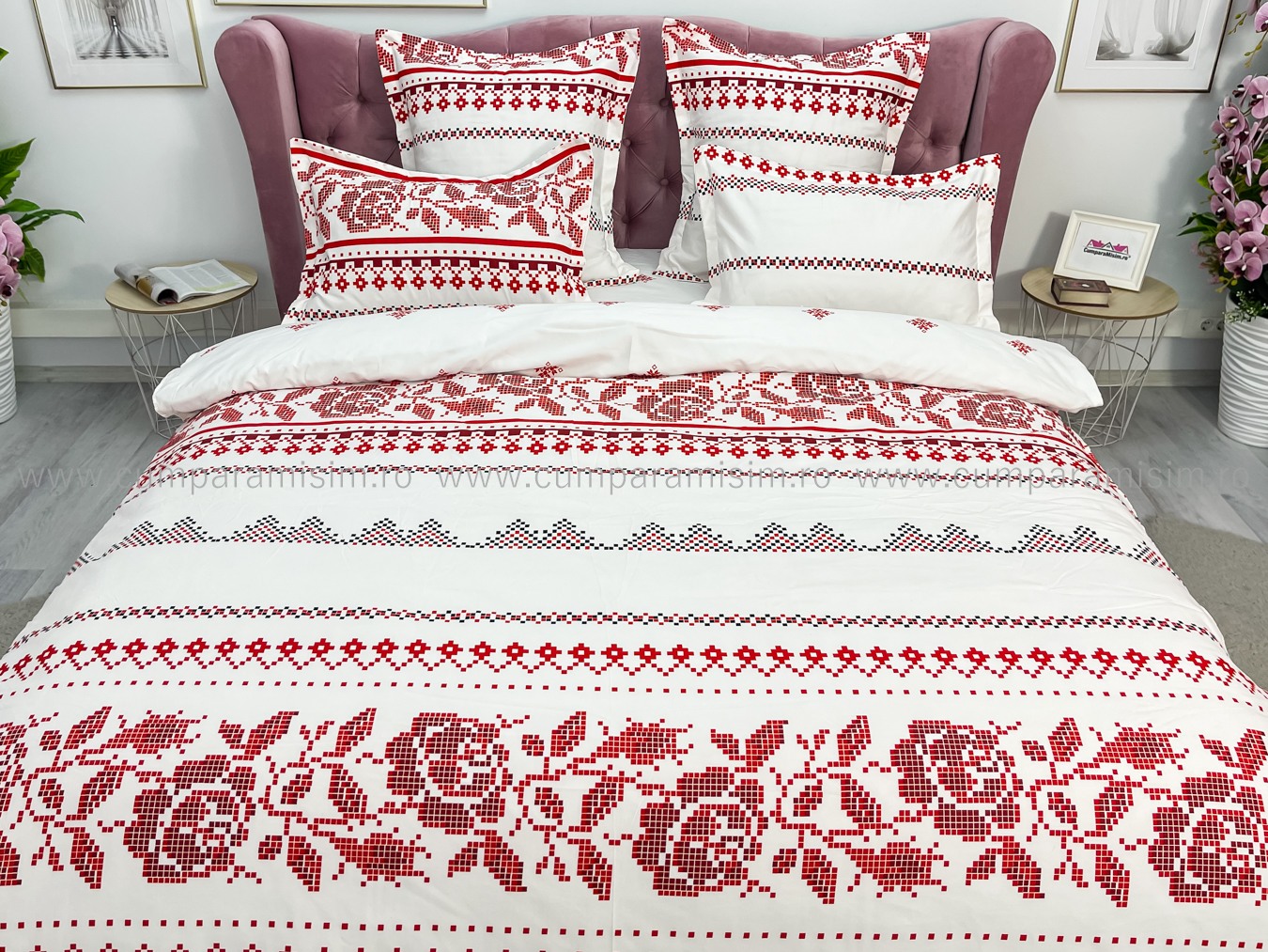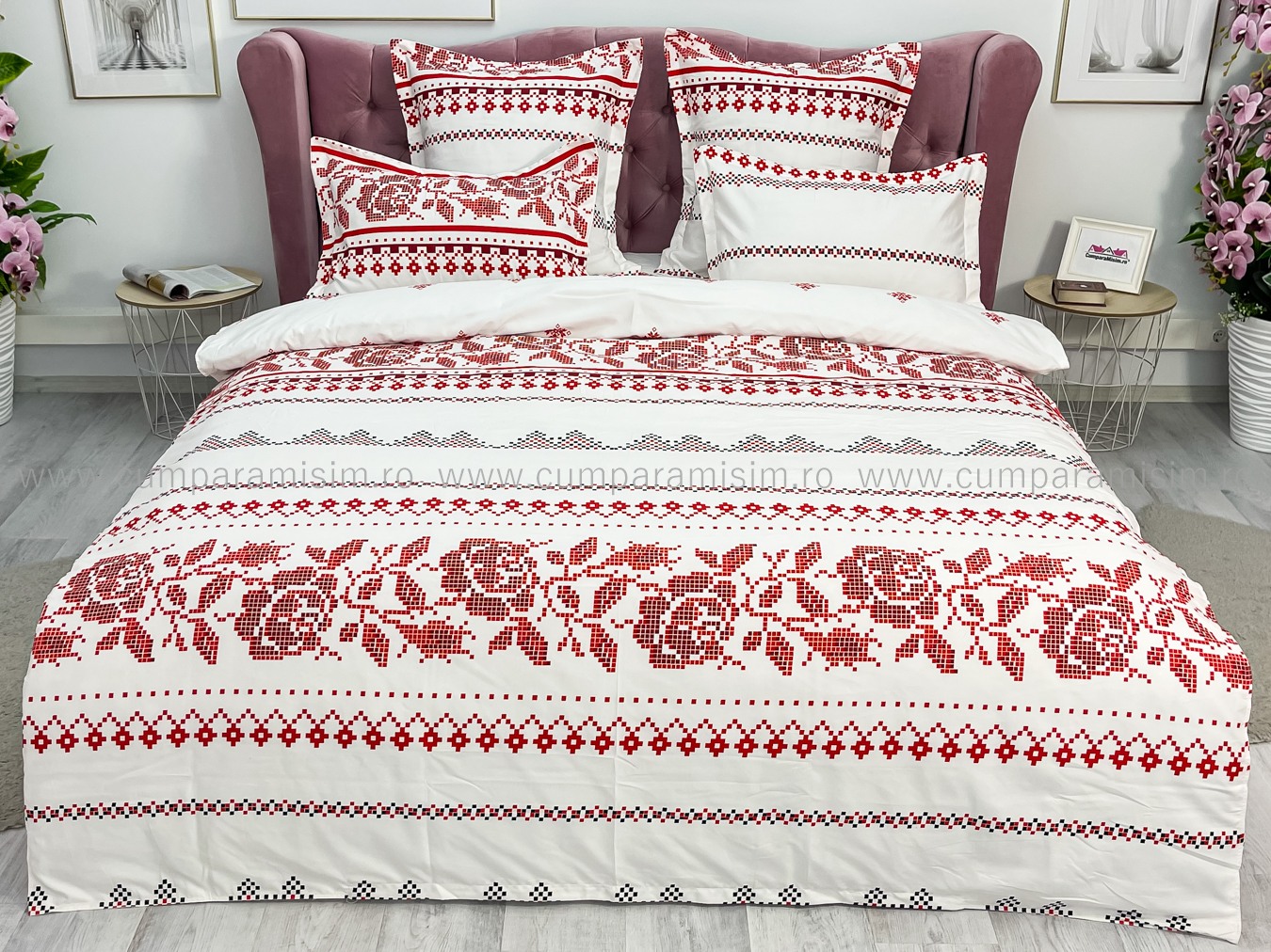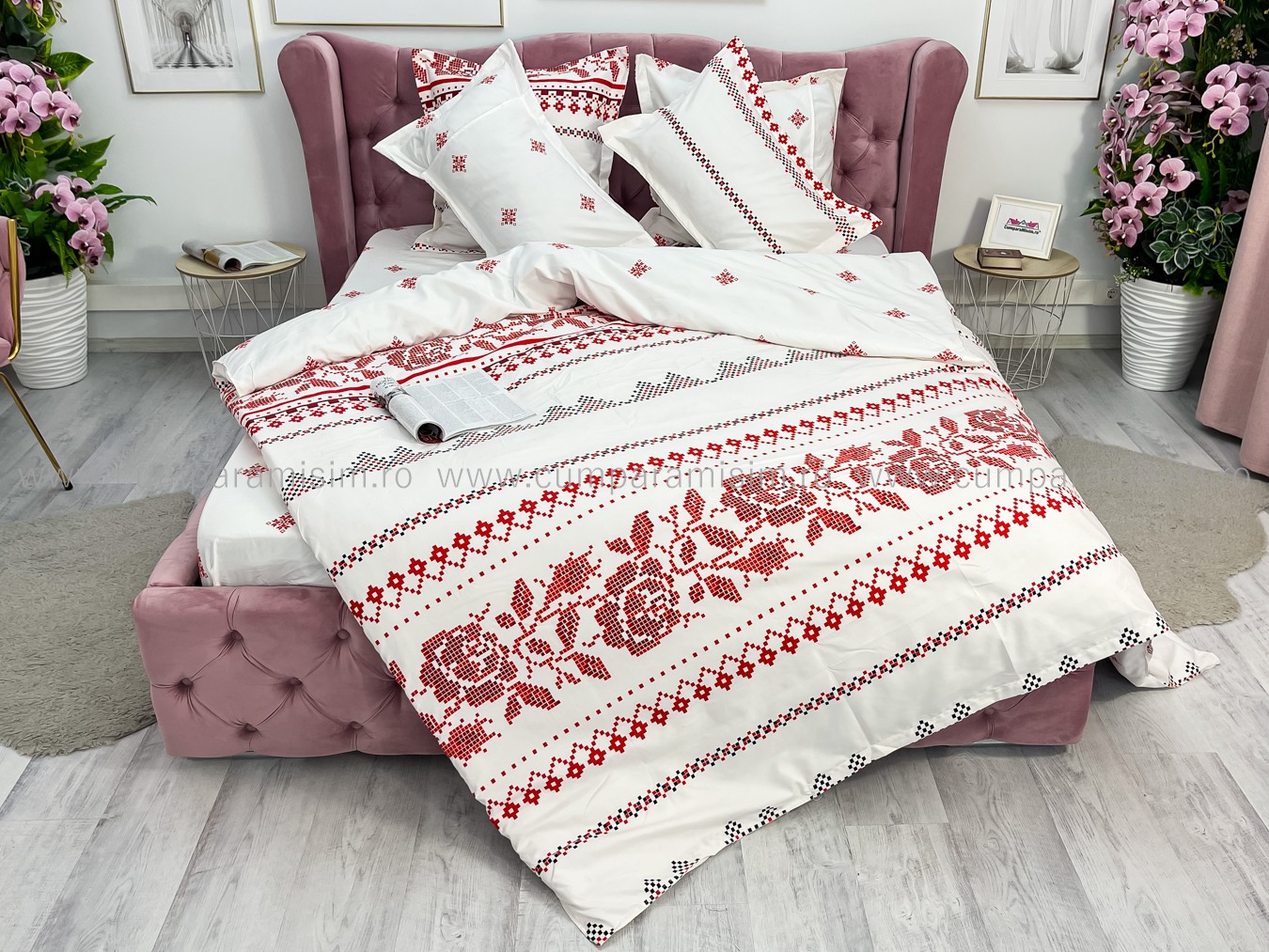Lenjerie pat dublu cu ELASTIC, Finet, 6 piese, Alb-Rosu, model traditional