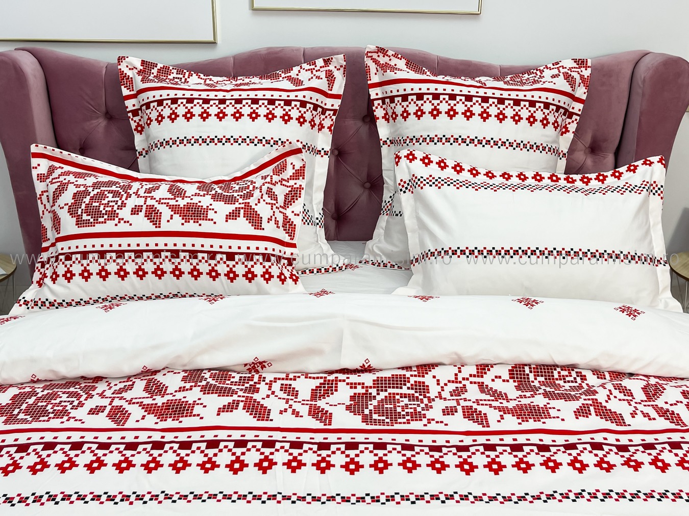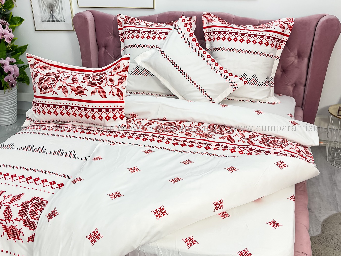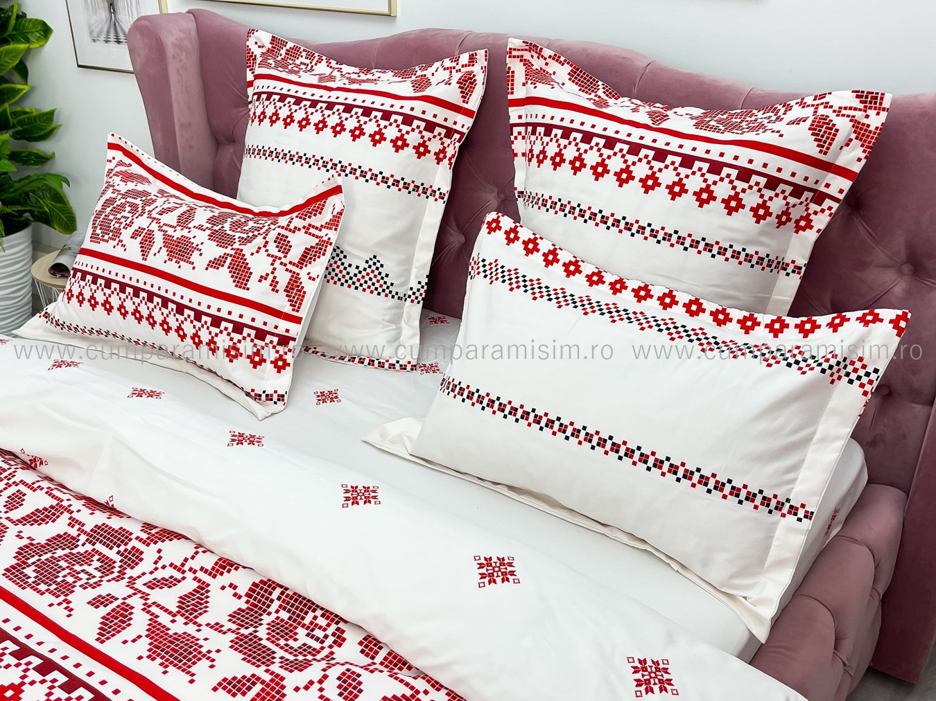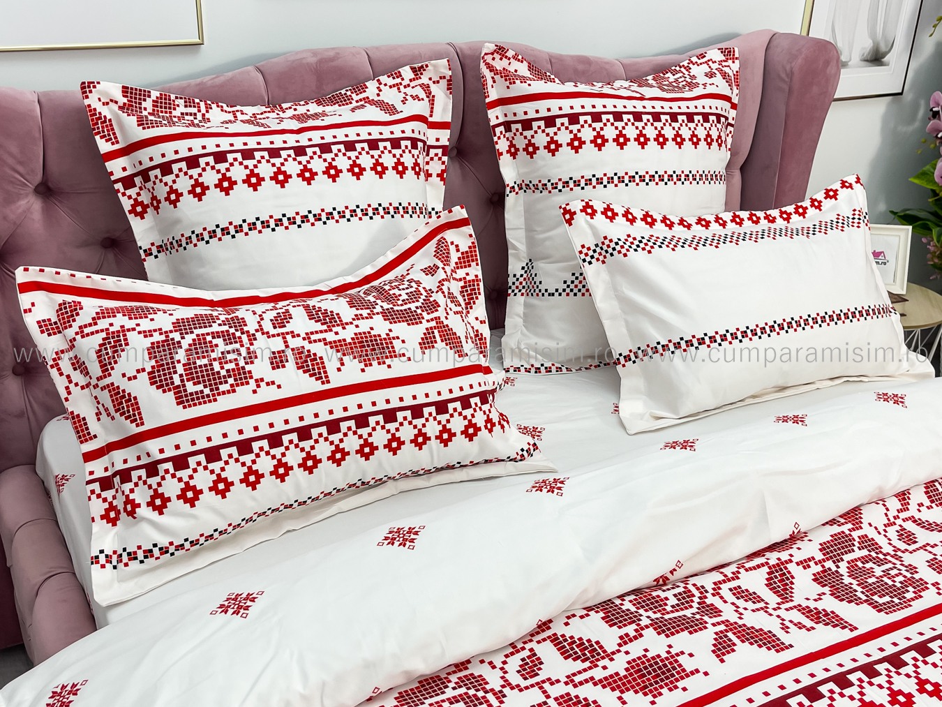 Lenjerie pat dublu cu ELASTIC, Finet, 6 piese, Alb-Rosu, model traditional