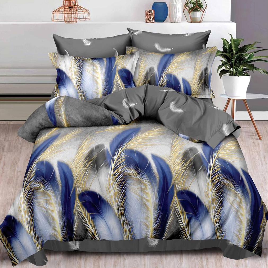 Lenjerie pat dublu cu ELASTIC, Finet, 6 piese, Albastru, pene