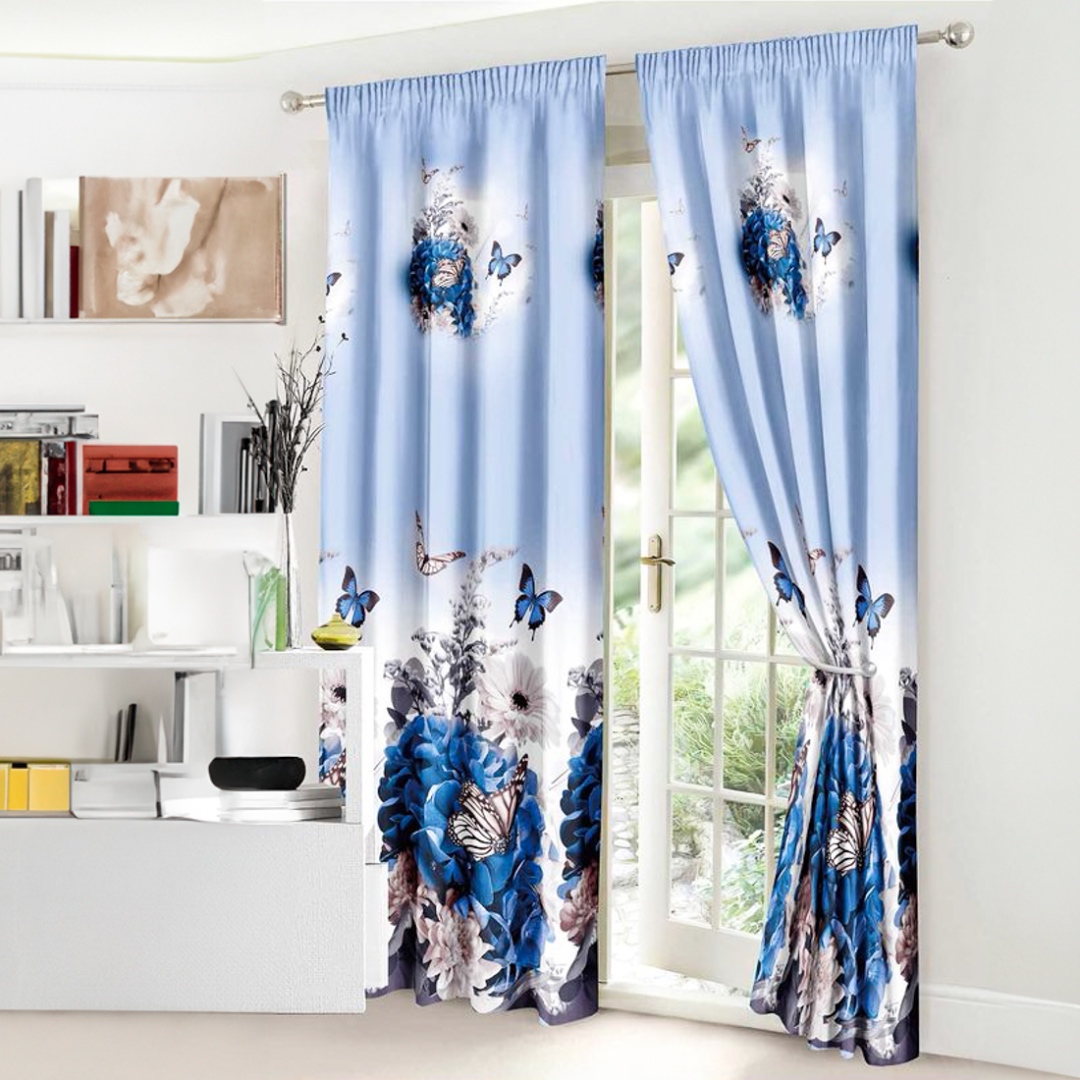 Set Lenjerie pat dublu cu Elastic (160x200cm, 180x200cm) + 2 draperii, finet, 8 piese, Alb, Albastru, Flori, Fluturi