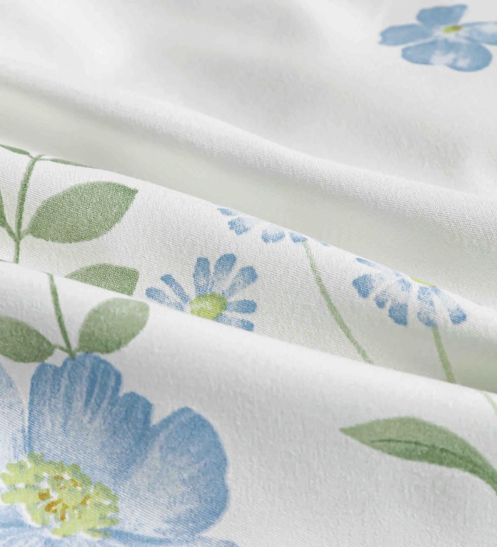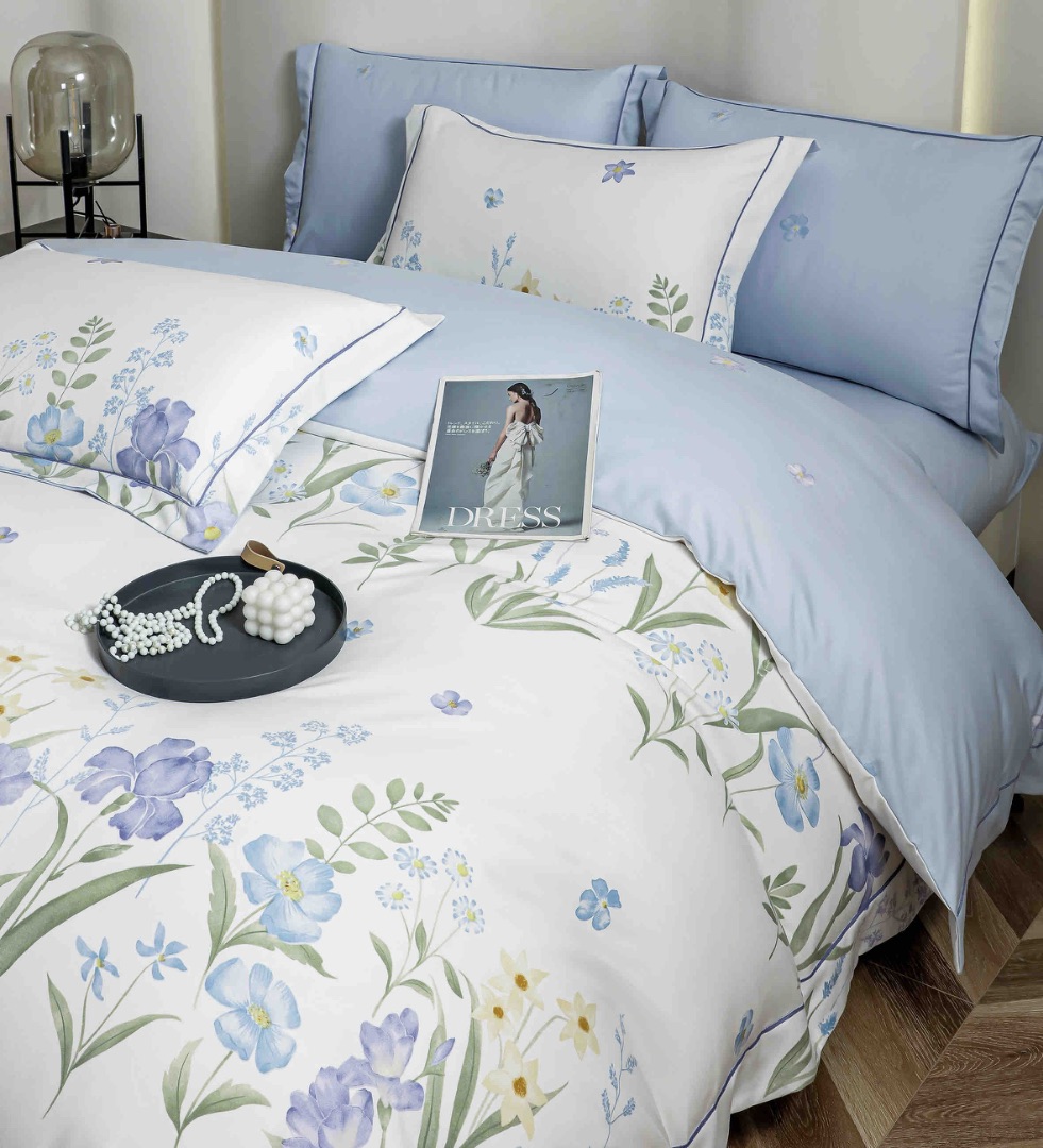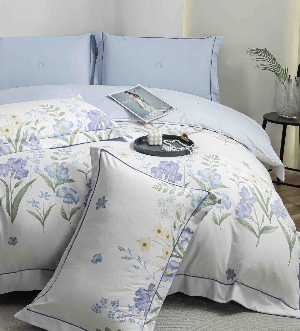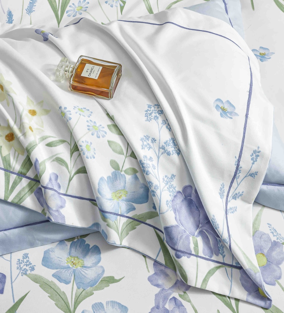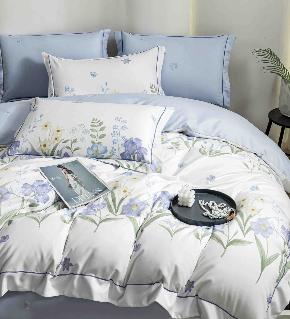 Lenjerie pat dublu, FINET DeLuxe, 6 piese, cu ELASTIC, Jojo Home, Cutie Eleganta, Alb, Bleu, Flori de Lavanda