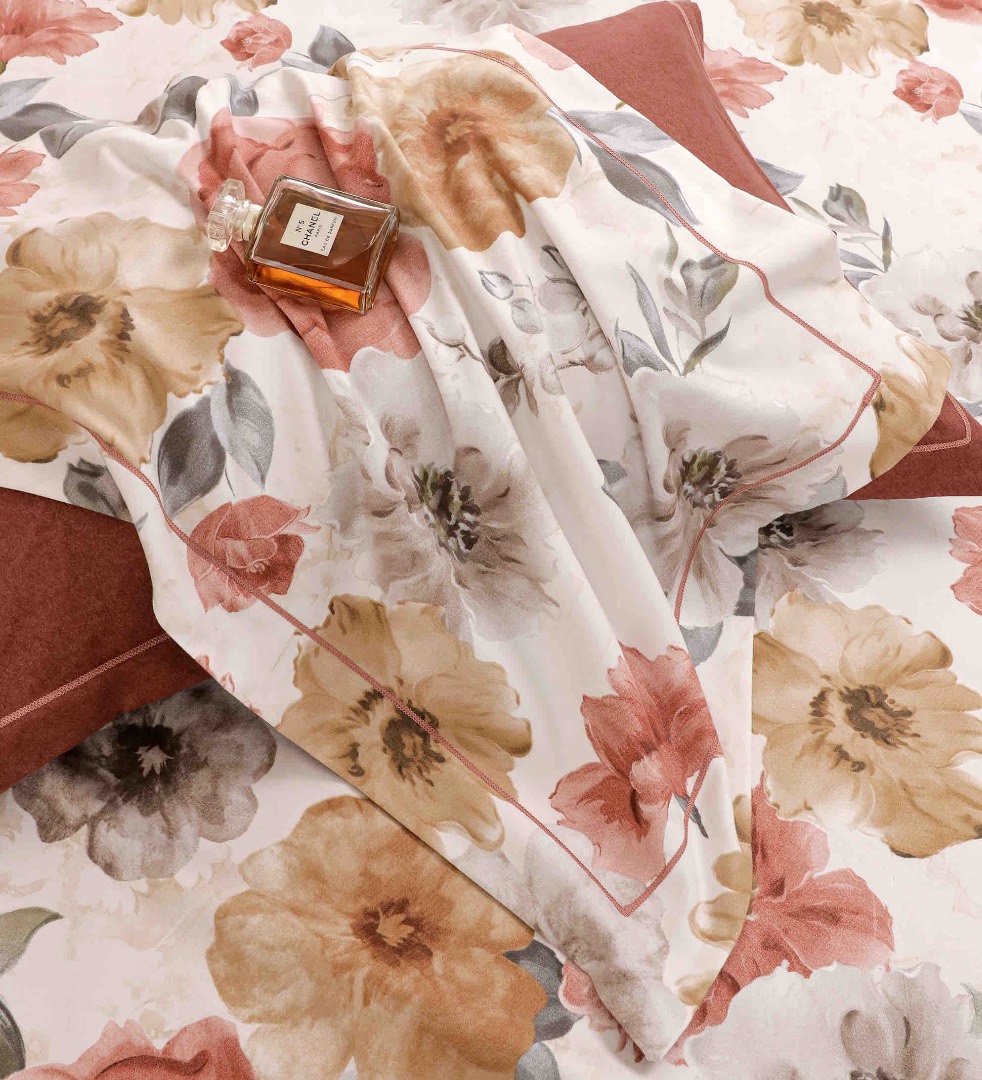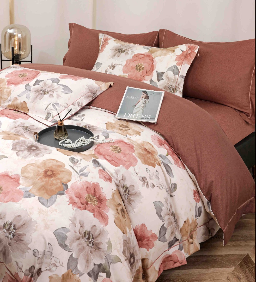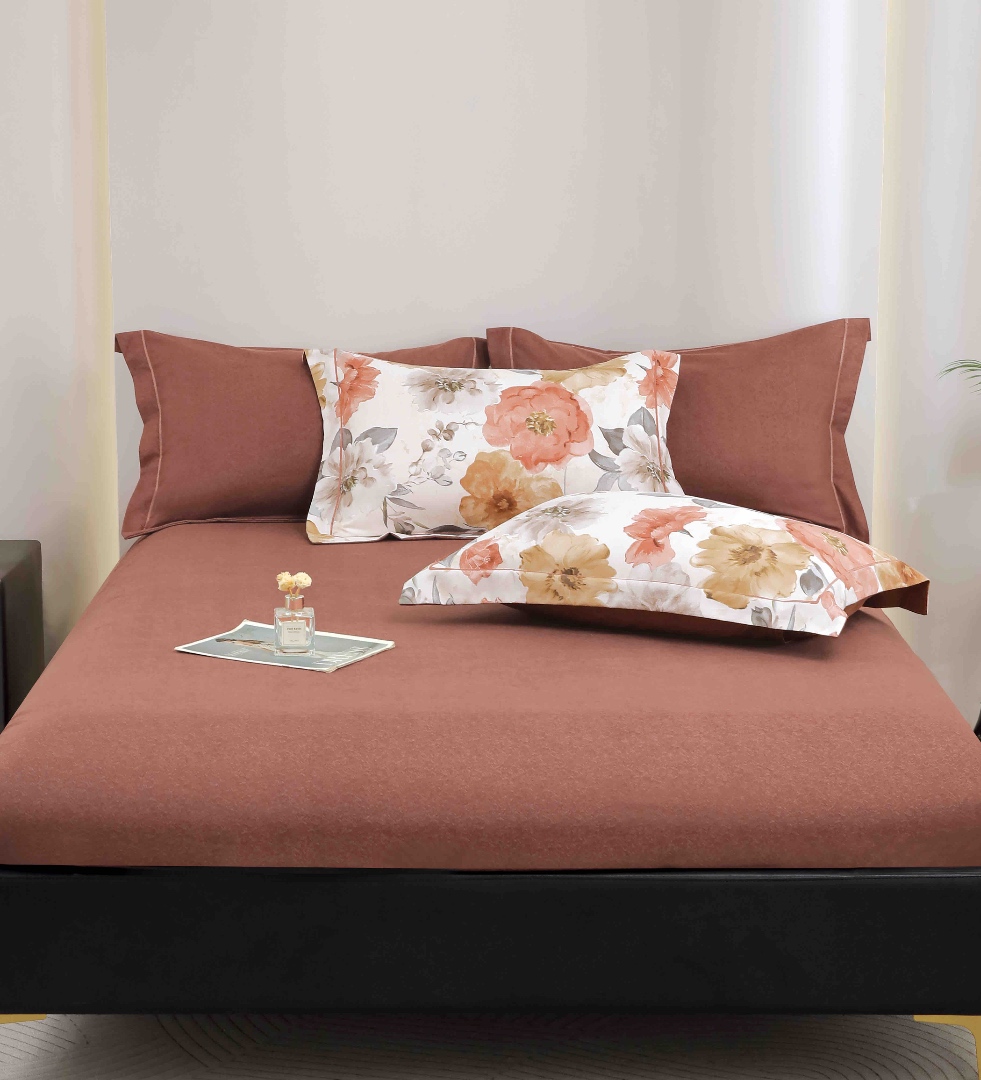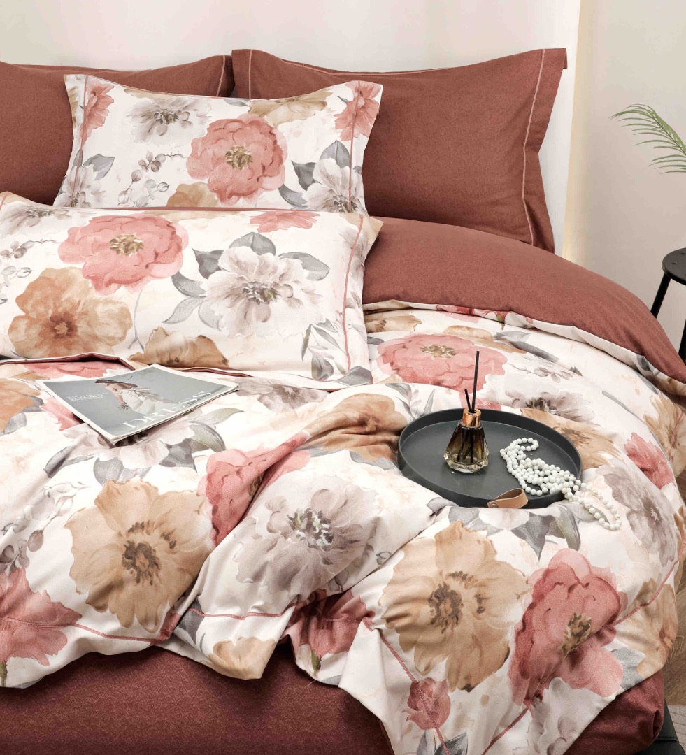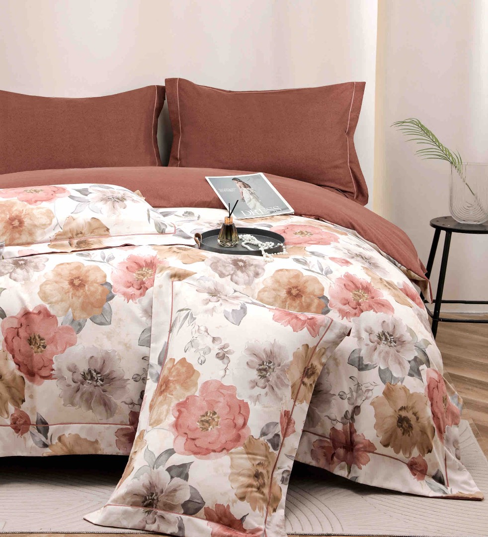 Lenjerie pat dublu, FINET DeLuxe, 6 piese, cu ELASTIC, Jojo Home, Cutie Eleganta, Alb, Maroniu, Flori