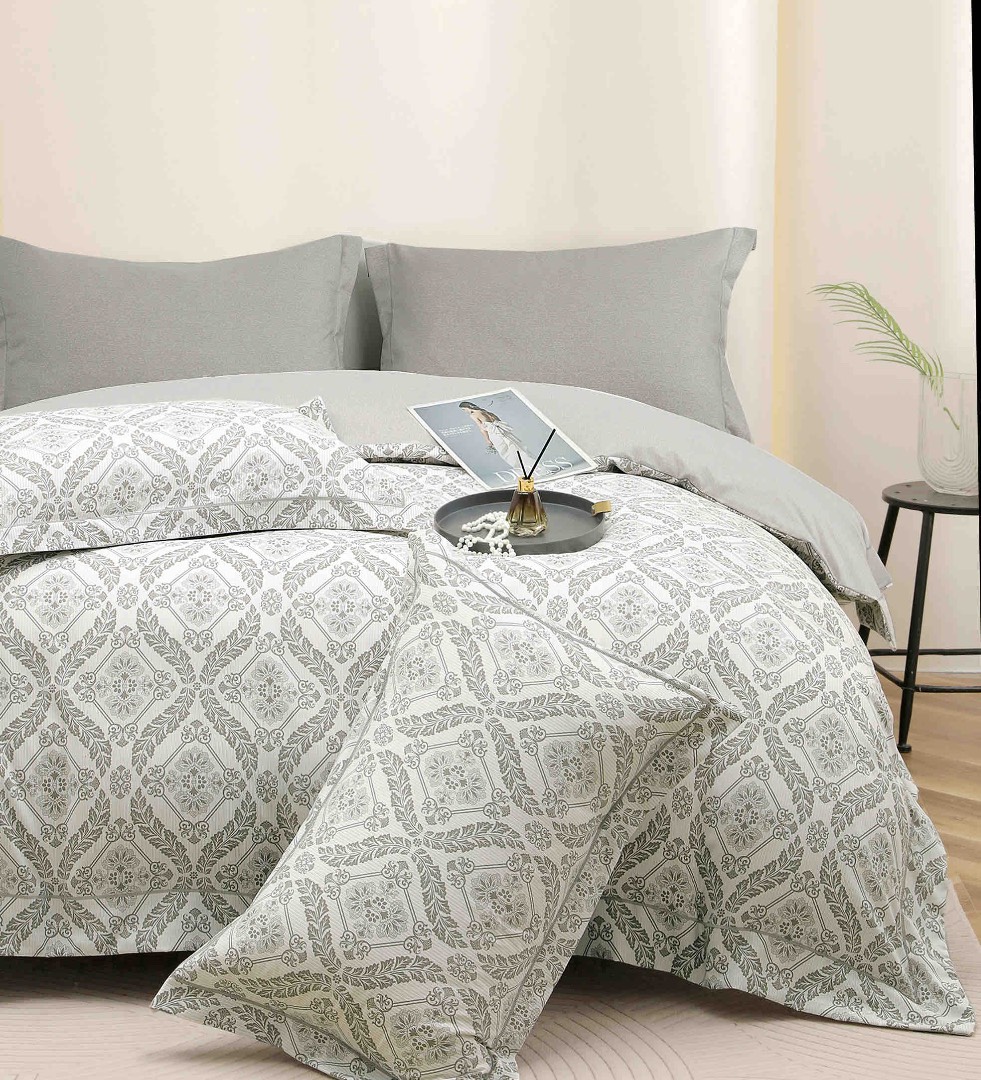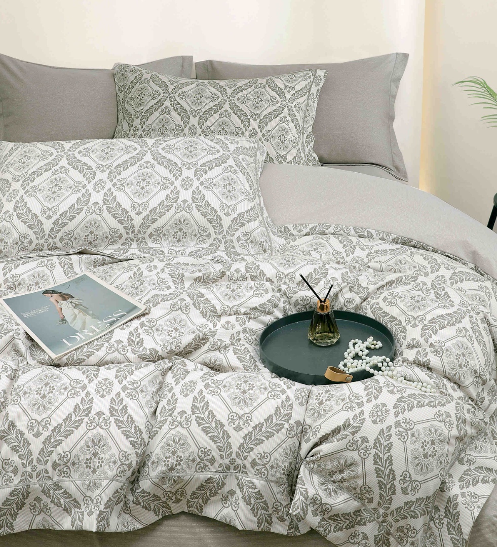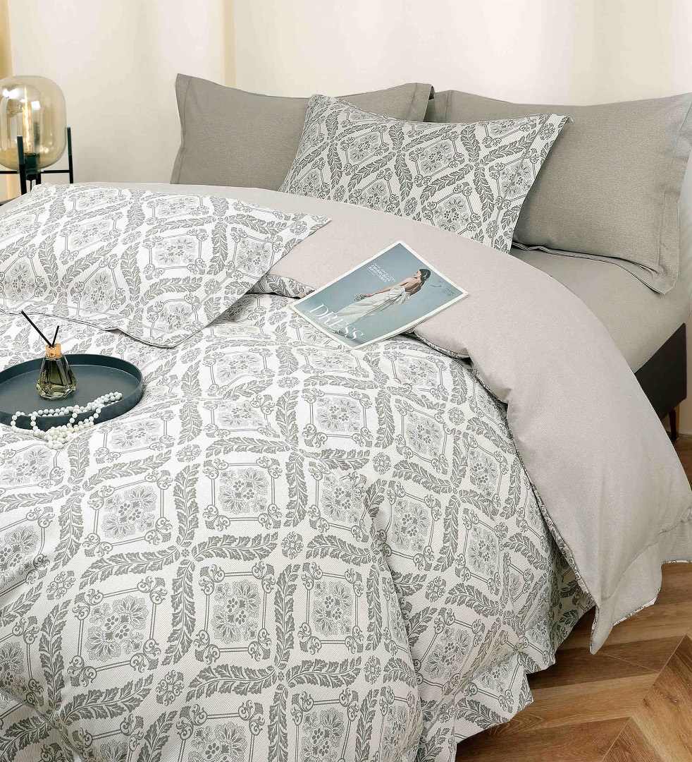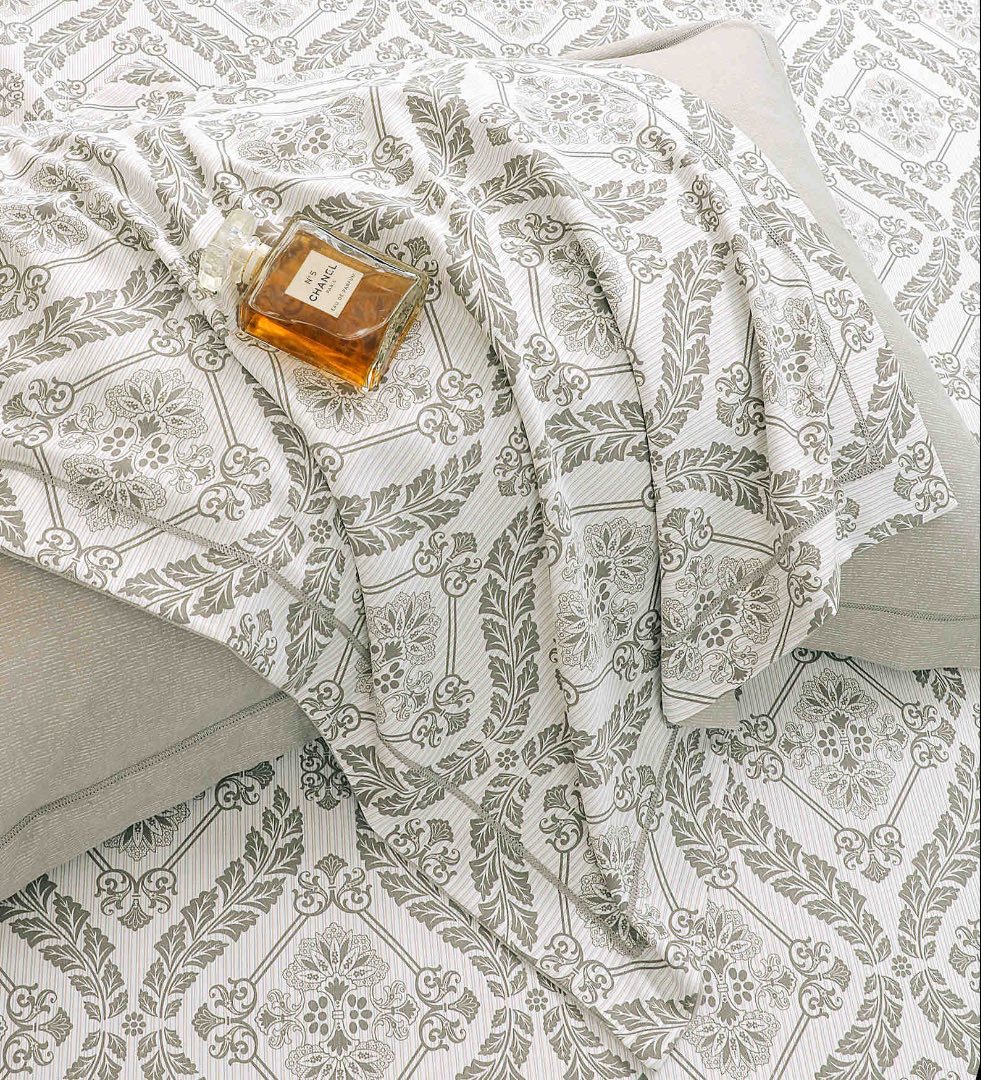Lenjerie pat dublu, FINET DeLuxe, 6 piese, cu ELASTIC, Jojo Home, Cutie Eleganta, Gri, Model Elegant