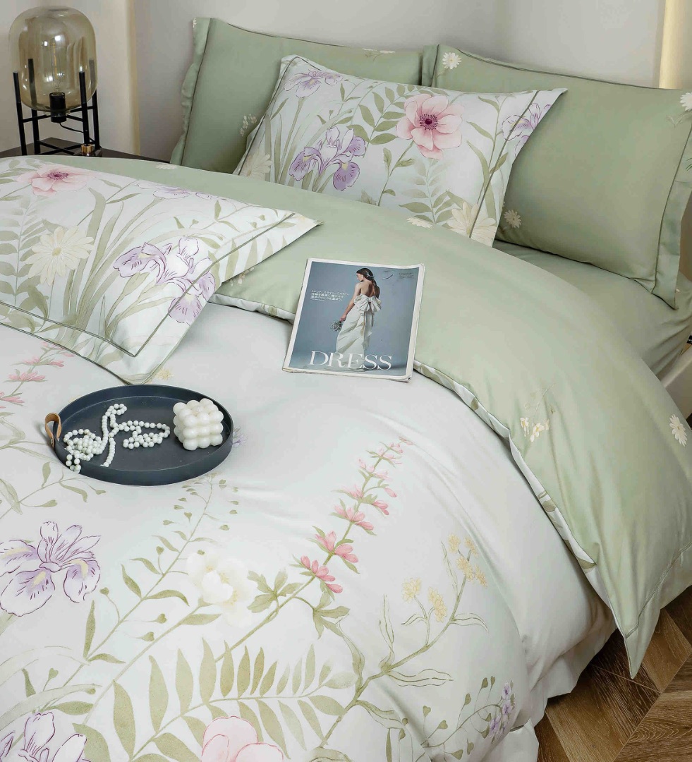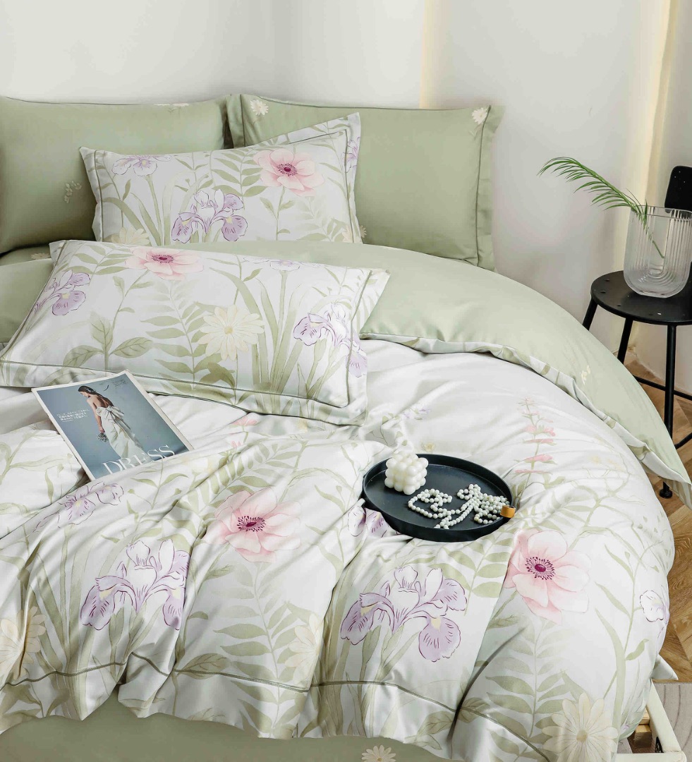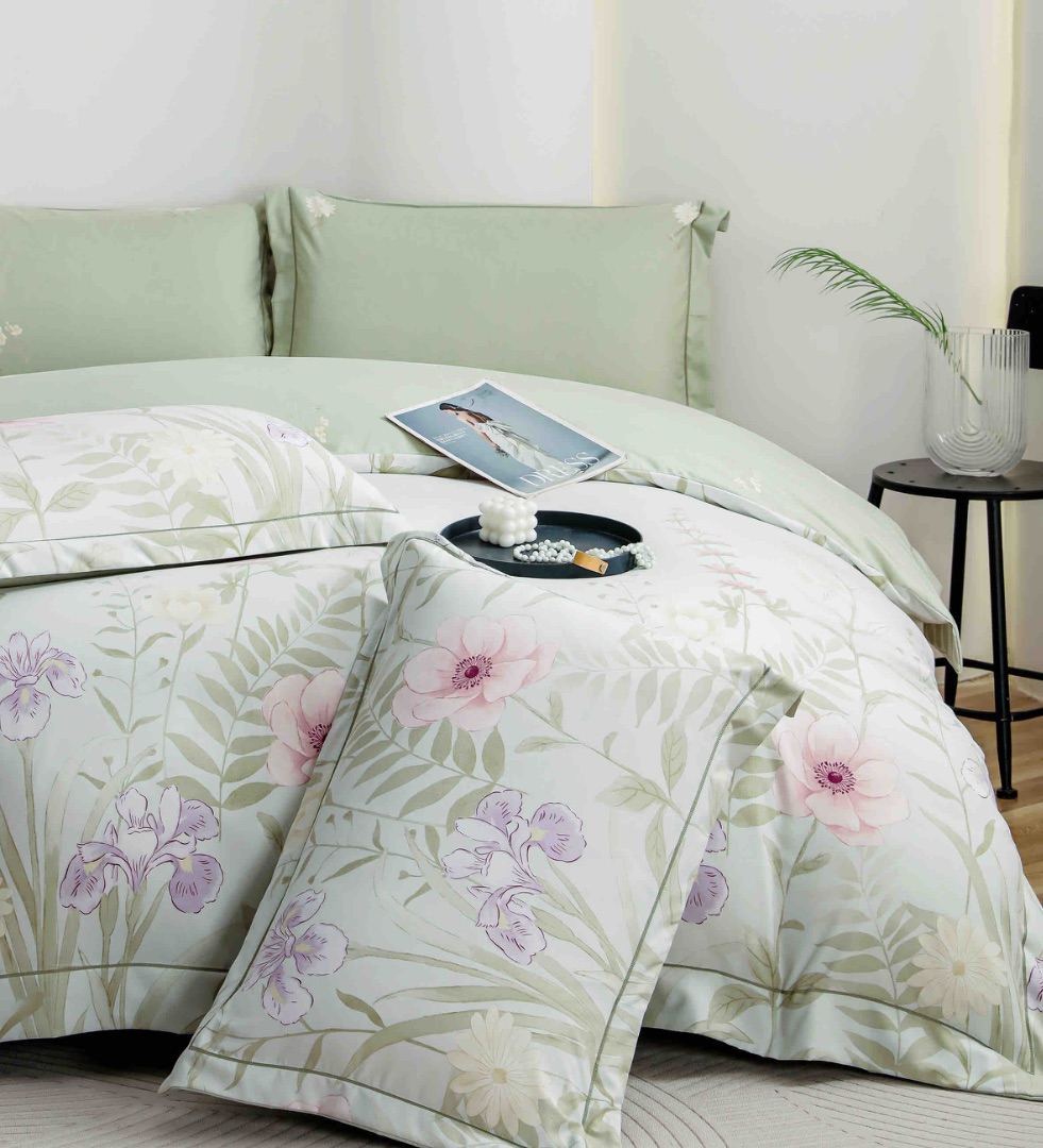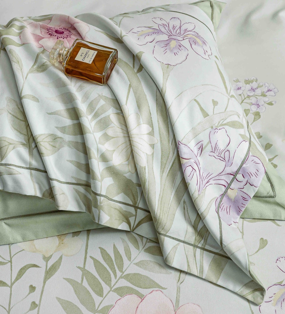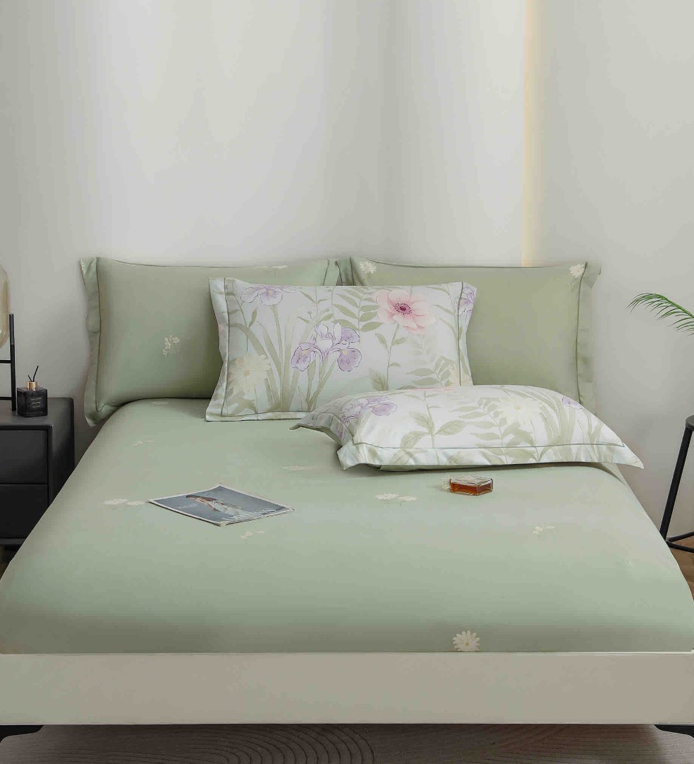 Lenjerie pat dublu, FINET DeLuxe, 6 piese, cu ELASTIC, Jojo Home, Cutie Eleganta, Vernil, Flori