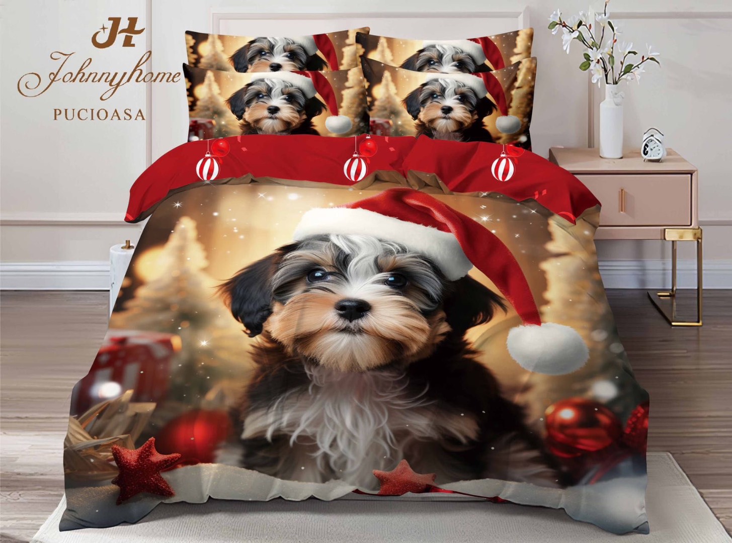 Lenjerie pat dublu, FINET, Digital Print, Craciun, Bej, Rosu, catel, bichon
