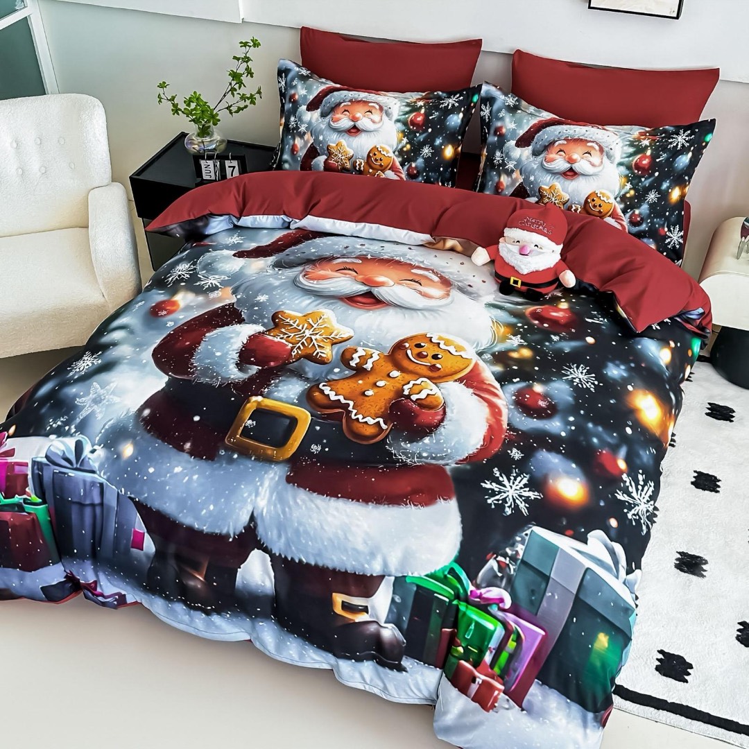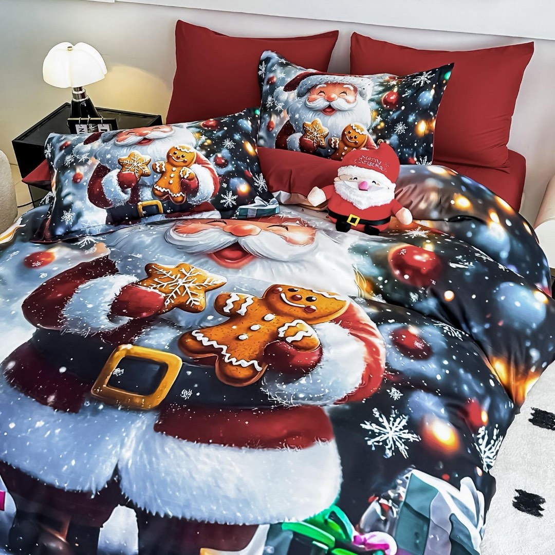 Lenjerie pat dublu, FINET, Imprimeu Digital 5D - Identic cu poza, Cu ELASTIC, 6 piese, Jojo Home, Alb, Rosu, Mos Craciun cu Turta Dulce