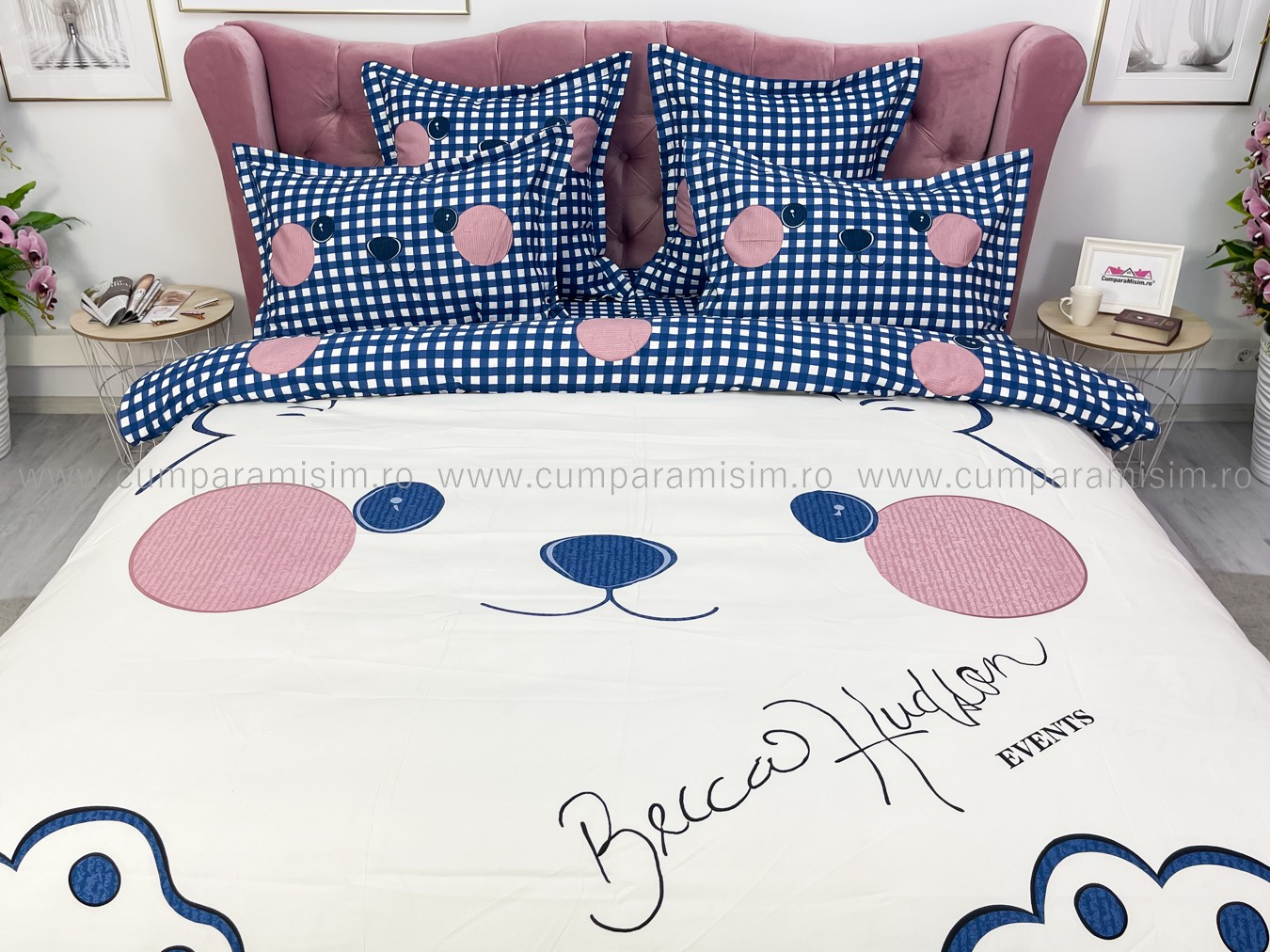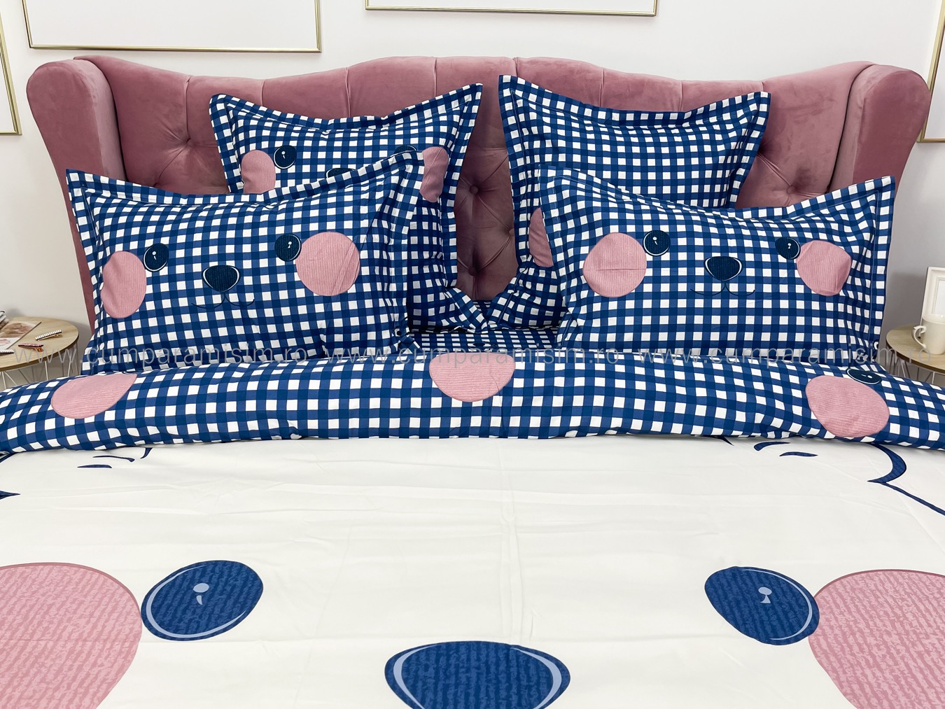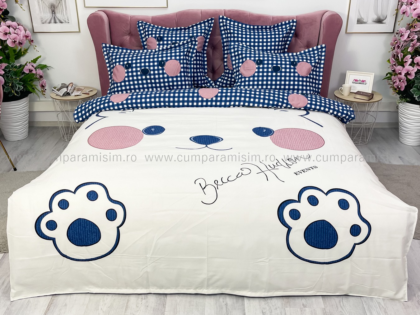 Lenjerie pat dublu, FINET, Imprimeu Digital - Identic cu poza, 6 piese, Jojo Home, Crem-Bleu, ursulet