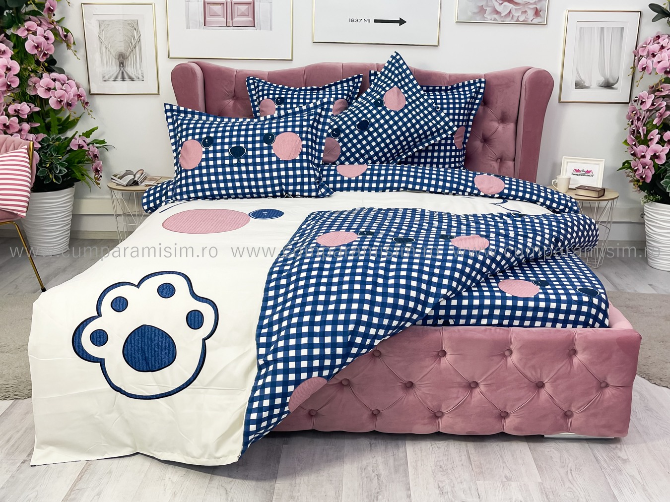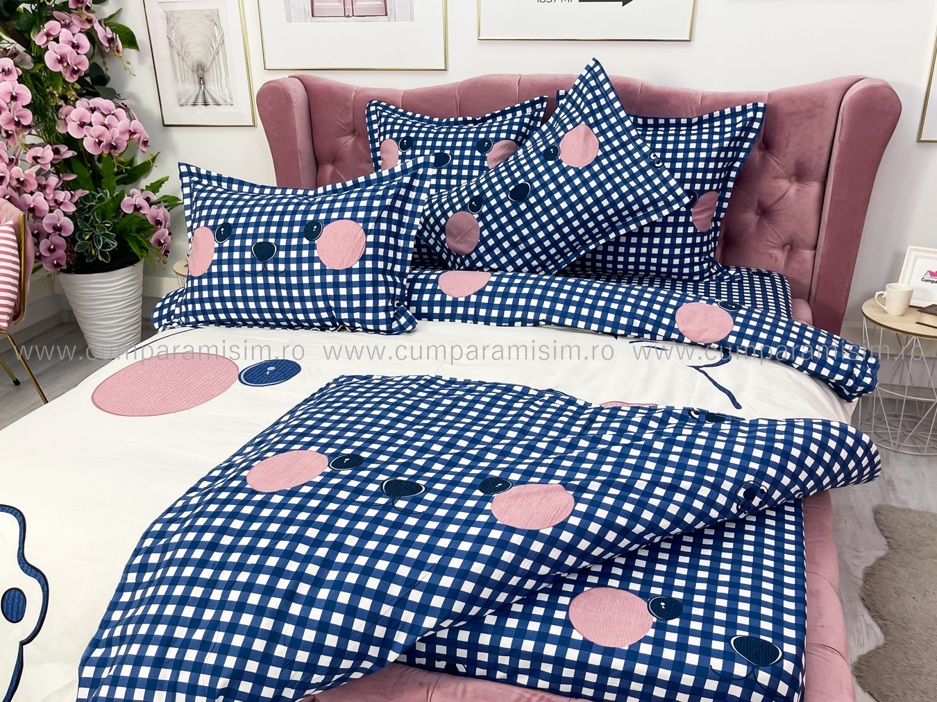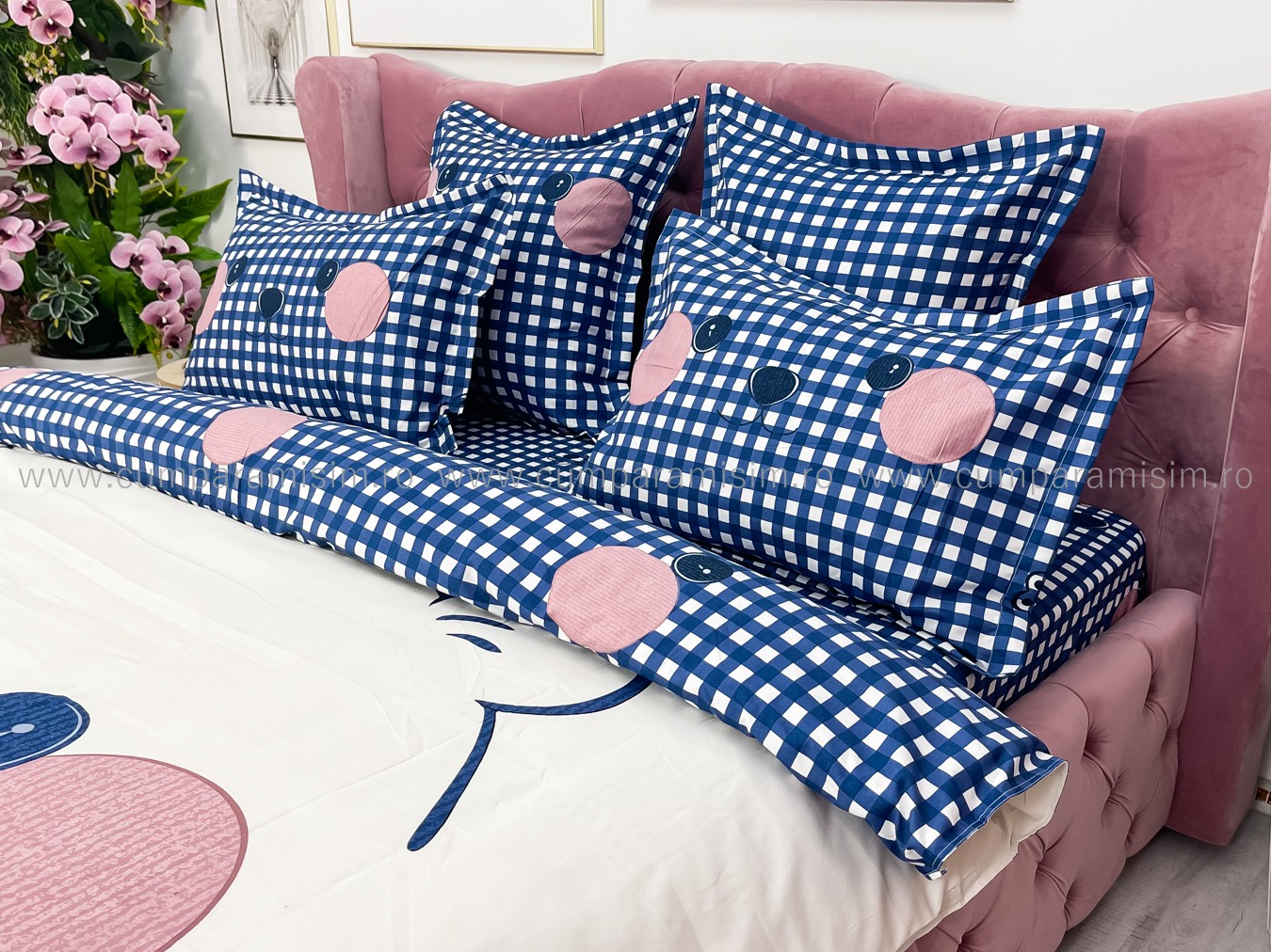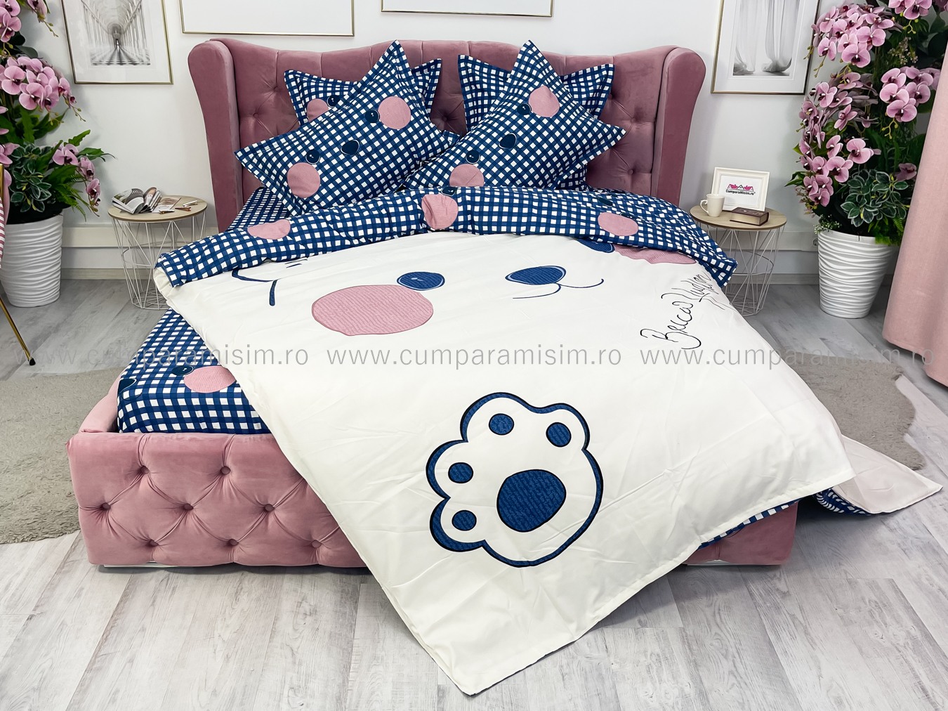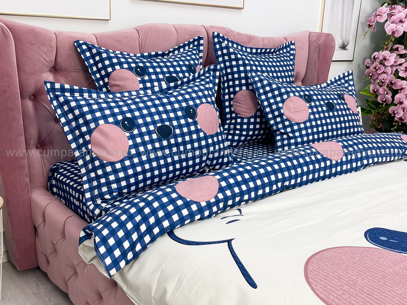 Lenjerie de Pat Dublu 6 Piese – Imprimeu Digital, 100% Bumbac Finet Premium     Adauga un plus de rafinament dormitorului tau cu aceasta lenjerie de pat dublu, cu imprimeu digital clar si vibrant, exact ca in poza. Fabricata din bumbac 100% Finet, este alegerea ideala pentru cei care isi doresc un produs estetic, durabil si usor de intretinut.   Avantajele imprimeului digital: Model identic cu cel din fotografie – fidelitate ridicata a culorilor si detaliilorCulori intense, rezistente