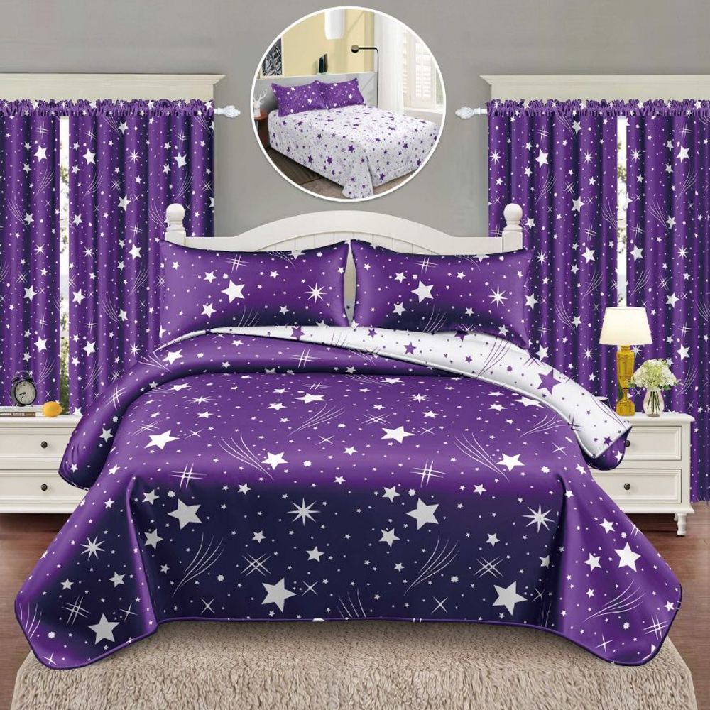 Lenjerie Pat Single, FINET, 6 piese, cu 2 DRAPERII INCLUSE, Alb, Mov, stele
