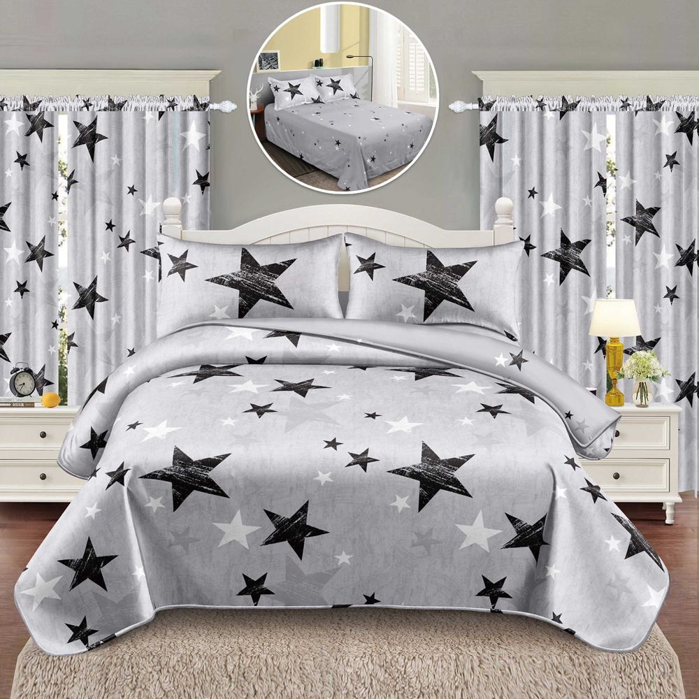 Lenjerie Pat Single, FINET, 6 piese, cu 2 DRAPERII INCLUSE, Gri, stelute
