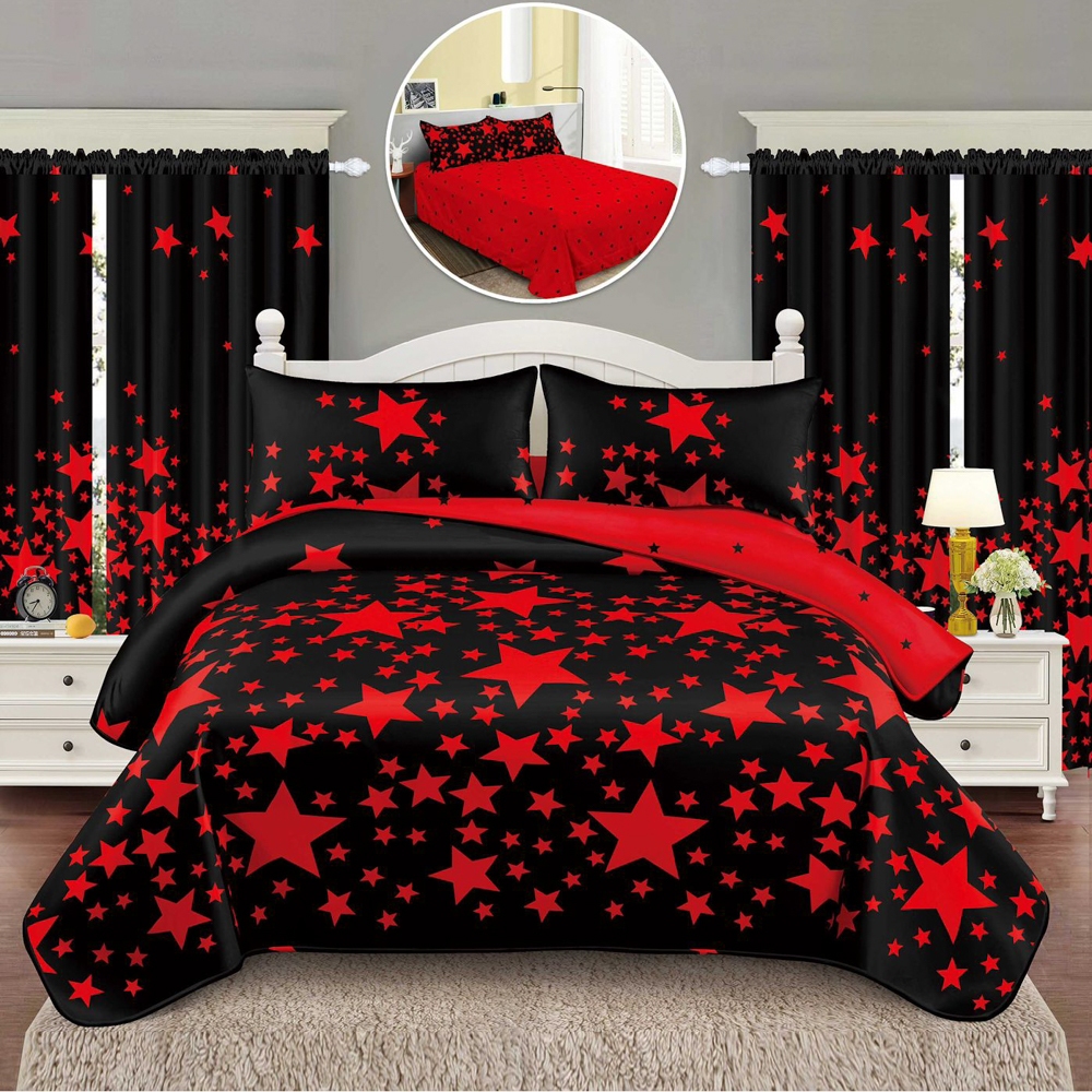 Lenjerie Pat Single, FINET, 6 piese, cu 2 DRAPERII INCLUSE, Rosu, Negru, stelute