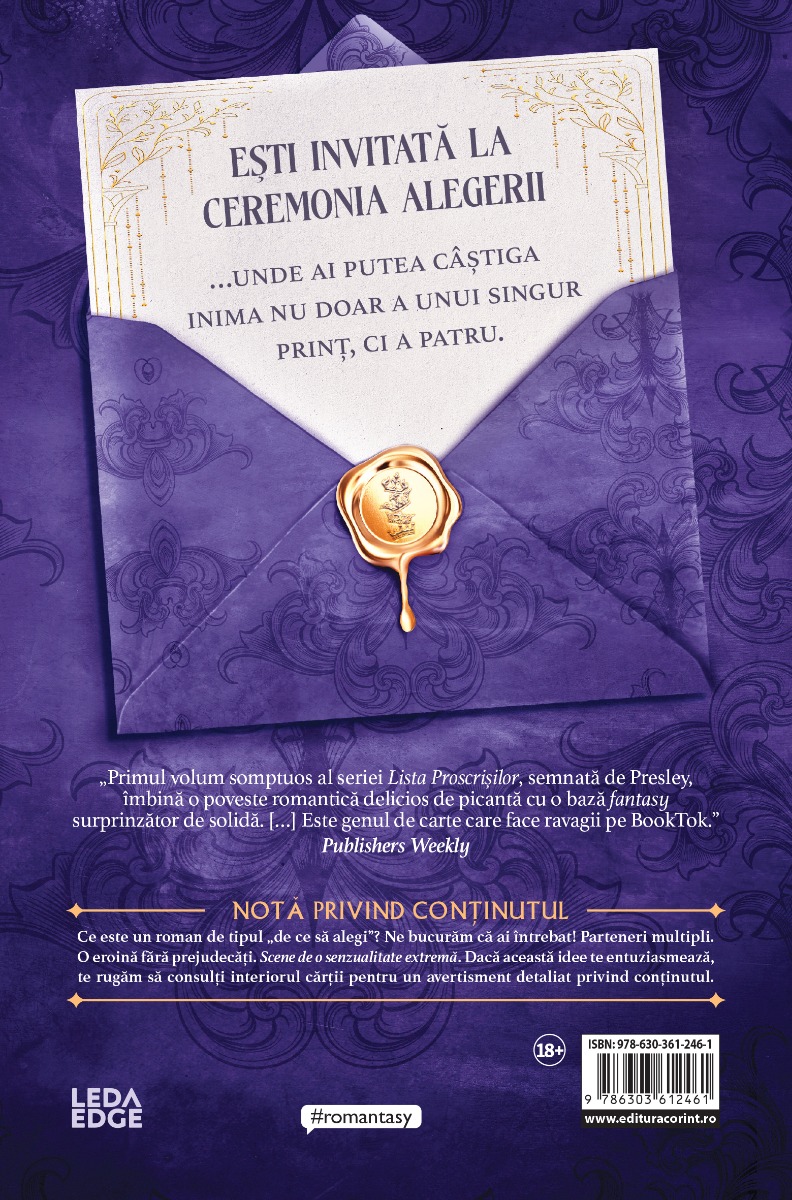 #html-body [data-pb-style=RKUON6P]{justify-content:flex-start;display:flex;flex-direction:column;background-position:left top;background-size:cover;background-repeat:no-repeat;background-attachment:scroll}CEI PATRU PRINȚI DIN LUMATHYST AU NEVOIE DE O PERECHE, IAR TOATE FETELE ÎŞI DORESC O ŞANSĂ… MAI PUȚIN EA. Amenințat de invadatori, regatul Lumathyst este în pragul haosului și nimeni nu îl poate opri. Dacă cei patru prinți-zei nemuritori nu își găsesc perechea sortită – pentru a proteja tronul –, Lumathyst se va prăbuși. Cinci femei au încercat. Și au eșuat. Iar în această seară, în orașul regal, prinții trebuie să își găsească Aleasa și să spere că ea va supraviețui transformării care o va face nemuritoare. Doar că Rylee Gray n-ar fi trebuit să fie aici. S-a strecurat înăuntru din propriile motive ascunse – iar acum, ei pretind că și-au găsit perechea perfectă. Pe ea. Desigur, prinții n-au nicio idee că tânăra ascunde un secret suficient de cumplit cât să-i condamne pe toți. Cei patru prinți nu au de ales. Vor folosi fiecare abilitate delicios de păcătoasă pe care o posedă pentru a o face pe Rylee să se îndrăgostească de toți… sau vor privi cum regatul lor se prăbușește. „Primul volum somptuos al seriei Lista Proscrișilor, semnată de Presley, îmbină o poveste romantică delicios de picantă cu o bază fantasy surprinzător de solidă. […] Este genul de carte care face ravagii pe BookTok.” Publishers Weekly „Presley oferă o poveste intensă, distractivă, senzuală și mistică în Lista Proscrișilor. Mi-a plăcut construcția lumii și faptul că am ajuns să cunosc toate personajele, precum și modul în care puterile lor le influențează personalitățile (sau invers).” Cantina Books Club „O femeie asaltată de patru prinți fermecători, înzestrați cu puteri magice, se bucură de toți în acest fantasy romantic dezlănțuit și plină de energie.” Kirkus Reviews „Pe lângă faptul că Lista Proscrișilor este scrisă într-un mod pe care îl pot compara doar cu fluxul uniform al apei peste stânci ascuțite, cartea este, de asemenea, incredibil de captivantă, emoționantă și inteligentă.” Nerd Daily