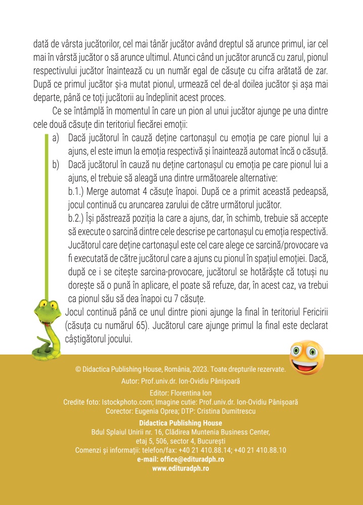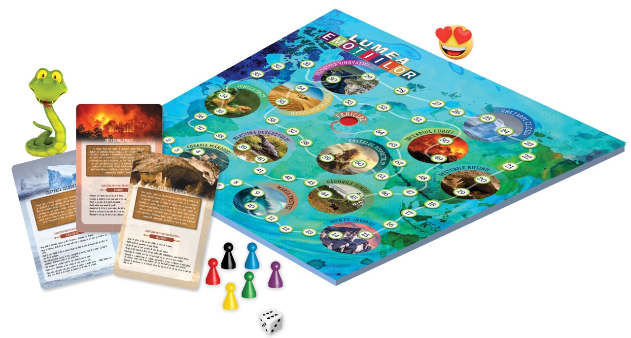 Cele 12 cartonașe-emoții conțin, fiecare, o descriere a emoției respective și câte 7 sarcini-provocări pentru fiecare emoție. Dacă ai noroc poți deveni proprietarul emoției (ceea ce îți oferă imunitate și posibilitatea de a da sarcini-provocări celorlalți jucători pe care îi „prinzi” în emoția ta). Crezi că poți depăși toate cele 12 emoții și să ajungi primul la Fericire? Jocul conține o tablă de joc, un zar, șase pioni și 12 cartonașe-emoții. Aceste cartonașe-emoții conțin, fiecare, o descriere a emoției respective și câte 7 sarcini-provocări, gândite să fie în acord cu aceasta. Caracteristici: Mărimi: 39*37 (cutie) Autori: Ion-Ovidiu Pânișoară Grupa de vârstă: 5 ani +