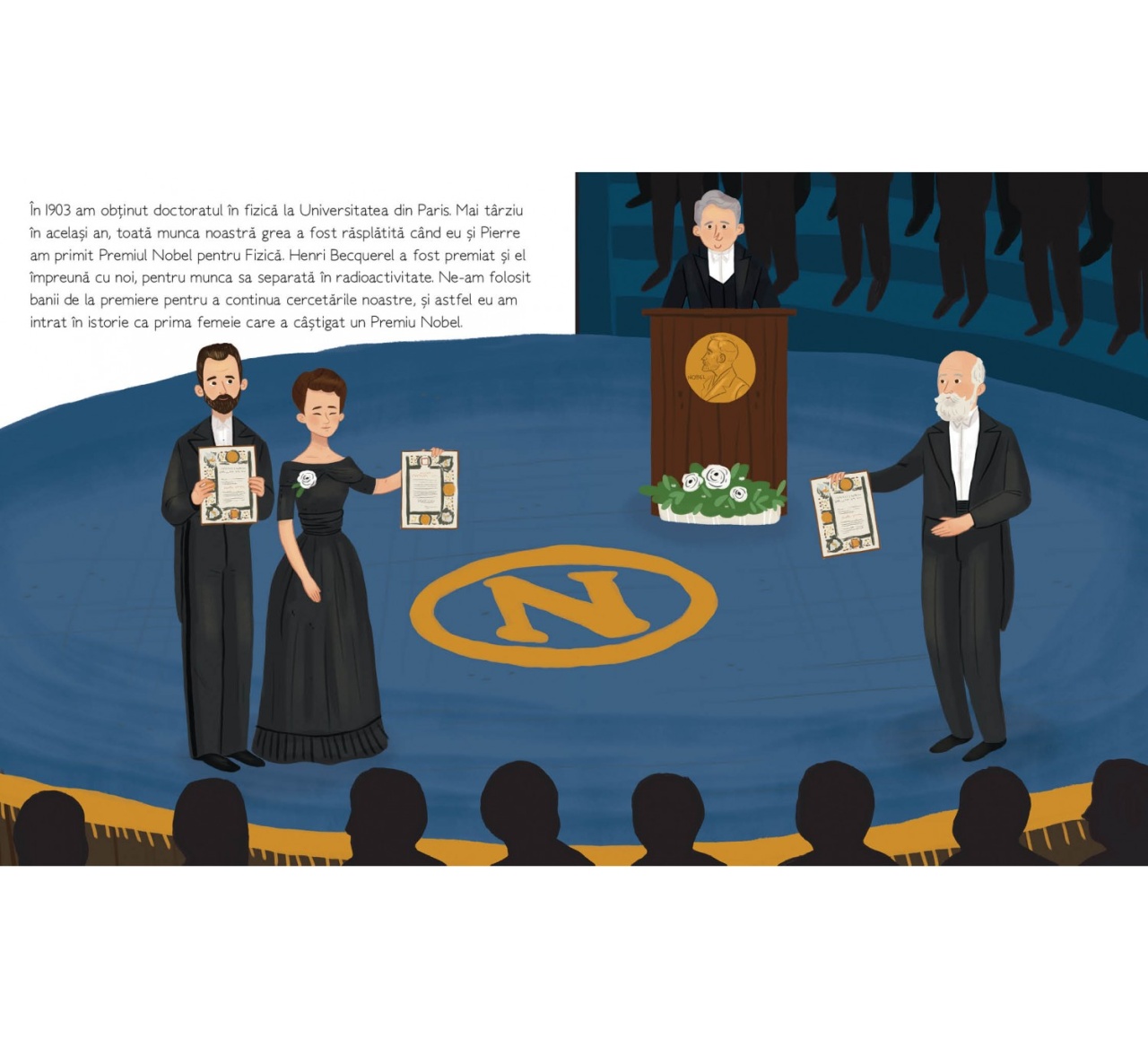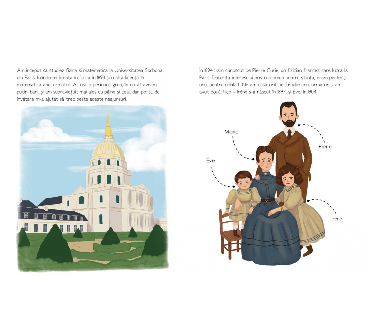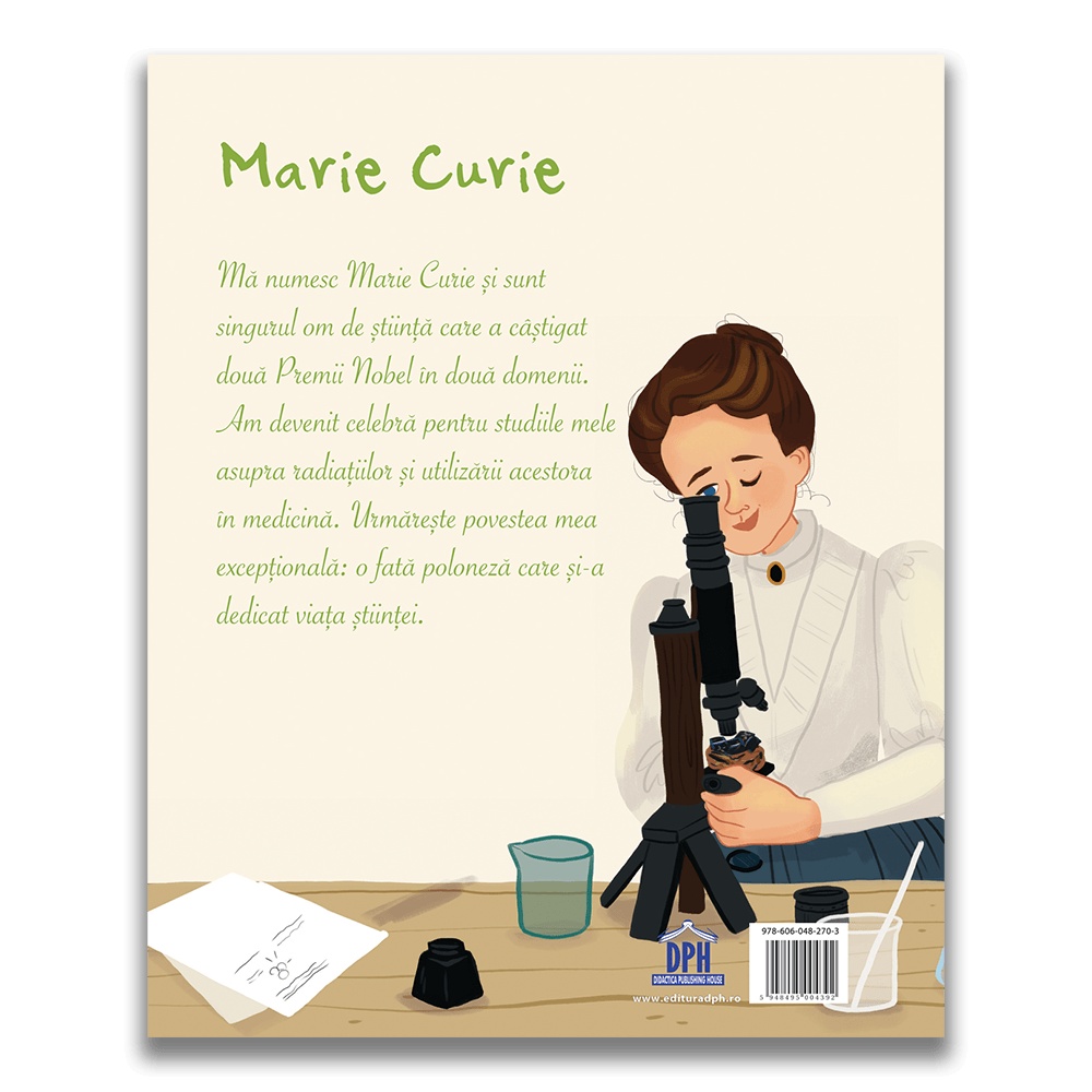 Faceți cunoștință cu omul de știință Marie Curie și aflați despre viața ei și cercetarea de pionierat în această minunată biografie ilustrată. Cartea Marie Curie se adresează tuturor copiilor cu vârsta peste 6 ani. Într-o perioadă în care femeile nu erau bine-venite în lumea științei, Marie Curie și-a pus amprenta asupra istoriei. A fost prima femeie care a devenit profesor de fizică în Sorbona, unde studiase, ba chiar a câștigat Premiul Nobel în două domenii științifice diferite. Cu această biografie fascinantă, copiii vor afla cum Marie Curie și soțul ei și-au înființat laboratorul și au descoperit atât poloniul, cât și radiul și de ce munca lor asupra radioactivității a fost atât de importantă. Ilustrații atrăgătoare, informații despre progresele și succesele ei și un index al evenimentelor majore dezvăluie modul în care Marie Curie și-a pus amprenta asupra umanității. O cronologie și un test simplu la sfârșitul cărții îi ajută pe copii să-și testeze înțelegerea și cunoștințele. DESPRE AUTORI: Jane Kent - este o scriitoare de cărți pentru copii. Ea a lucrat la orice, de la cărți de bord de învățare timpurie și biografii educaționale ale unor mari figuri istorice până la titluri de poveste și activități pentru mărci precum Disney, Pixar, Marvel și Nickelodeon. Isabel Muñoz – este de profesie fotograf și locuiește la Madrid. A crescut în regiunea Catalonia din Spania, iar, când avea 20 de ani, s-a mutat la Madrid și a început să studieze fotografia la Photocentro. Este absolventă a Universității din Madrid, unde a studiat arte plastice. De când era copil, a fost strâns legată de desen: avea întotdeauna după ea un caiet de schițe, fiindcă nu dorea ca inspirația să o găsească nepregătită. Este un fan al poveștilor pentru copii și iubește să se oprească la micile detalii care nu sunt vizibile cu ochiul liber. Specificații Vârstă: 6+ ani Pagini: 40+8 Mărimi: 19 x 23 cm Copertă: Cartonată