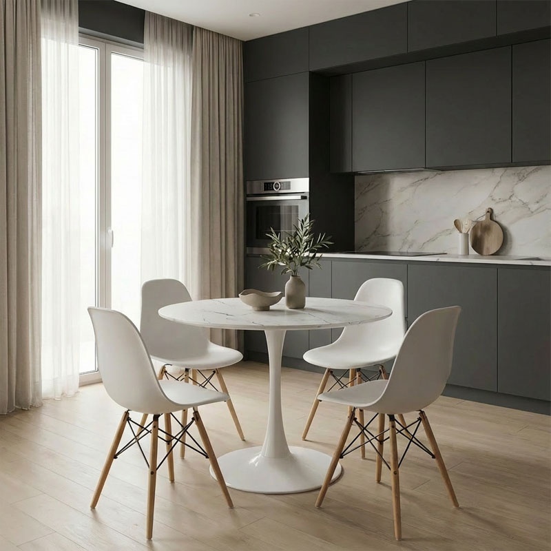 Masă Balou, alb, 80x80x73 cm - Eleganță și Funcționalitate pentru Casa Ta Transformă-ți spațiul de locuit cu masa Balou, un element de mobilier care îmbină stilul atemporal cu funcționalitatea de zi cu zi. Această masă cu efect de marmură este alegerea perfectă pentru cei care doresc să aducă un plus de rafinament și durabilitate în locuința lor. Caracteristici cheie Materiale de Calitate: Realizată din MDF de înaltă calitate, cu un finisaj de furnir din lemn cu efect de marmură, oferind atât durabilitate, cât și sofisticare. Design Elegant: Disponibilă în alb cu un finisaj ce imită marmura, adaugă un plus de stil și eleganță oricărui spațiu. Construcție Robustă: Susținută de o bază metalică de înaltă rezistență, asigurând stabilitate și durabilitate pe termen lung. Dimensiuni Produs Lungime: 80 cm Lățime: 80 cm Înălțime: 73 cm Diametru bază: 49 cm Informații Suplimentare Masa Balou este livrată neasamblată, în ambalajul original, împreună cu un ghid detaliat de asamblare. Te rugăm să reții că nuanța culorii poate varia ușor față de reprezentarea fotografică, din cauza setărilor ecranului. Această masă stilată și funcțională aduce un aer de eleganță și lux în orice interior modern sau clasic, fiind ideală atât pentru utilizarea zilnică, cât și pentru ocazii speciale.