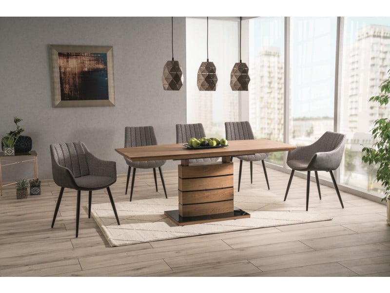 Masa Extensibila Leonardo – l90 x h76 x L160-220 cm Masa Extensibila Leonardo are un stil modern, un produs ideal pentru o sufragerie moderna. 2.377,29 Dimensiuni: Latime: 80 cm Lungime: 140-180 cm Inaltime: 76 cm Detalii tehnice: Cadrul este realizat din MDF si sticla Blatul este realizat din MDF Culoare: Stejar / Negru Asamblare: Produsul nu este montat. Asamblarea este rapida si usoara.