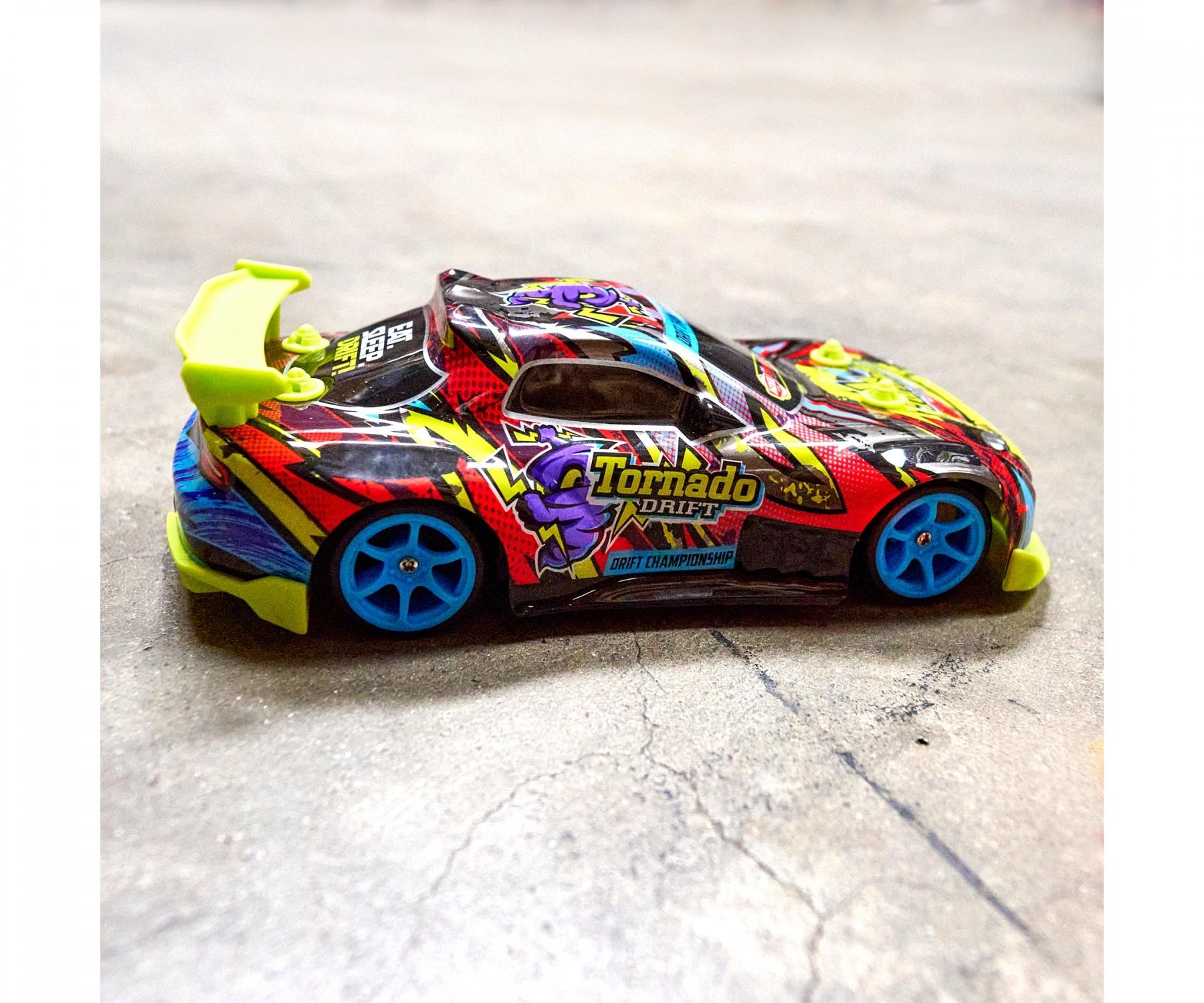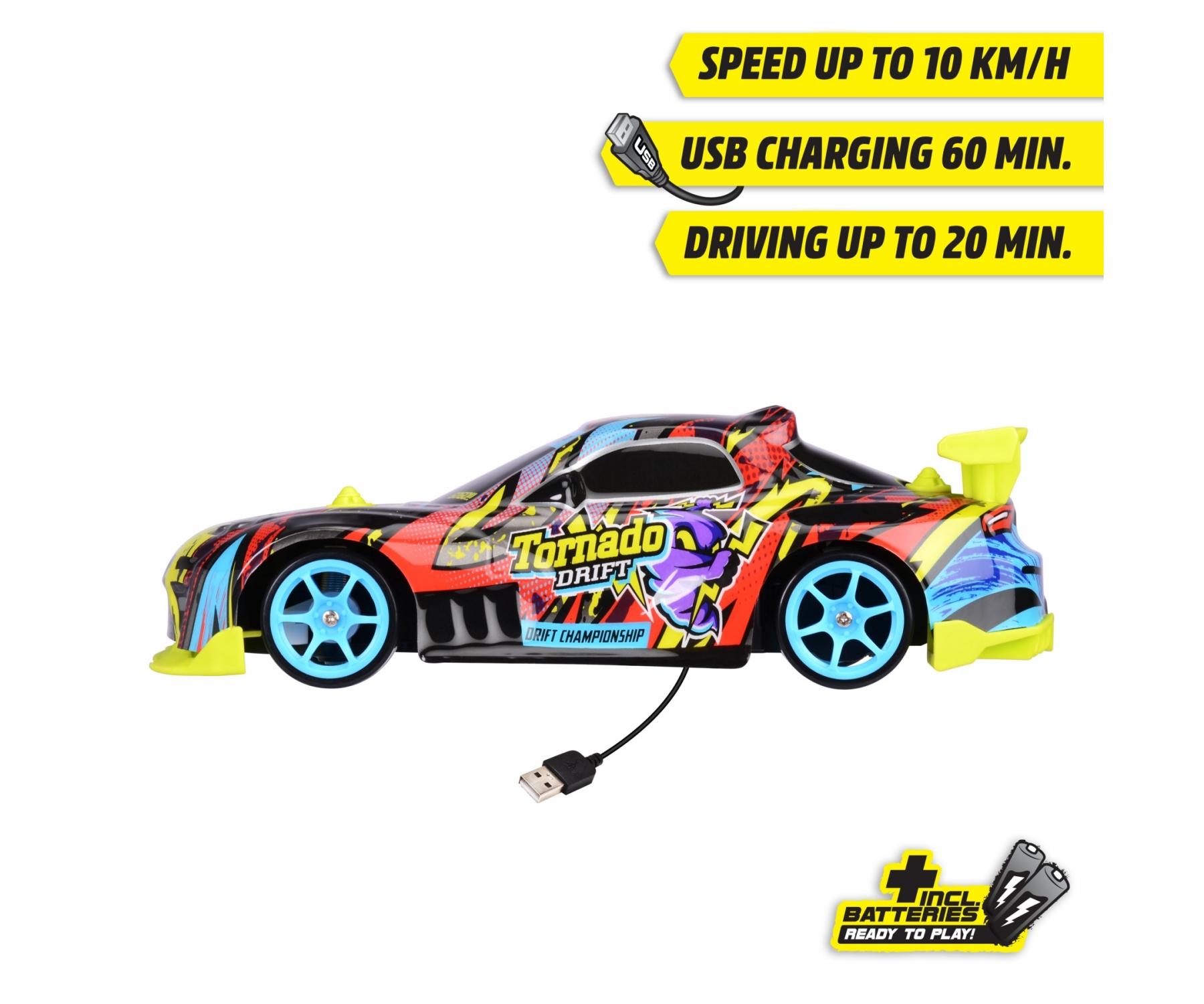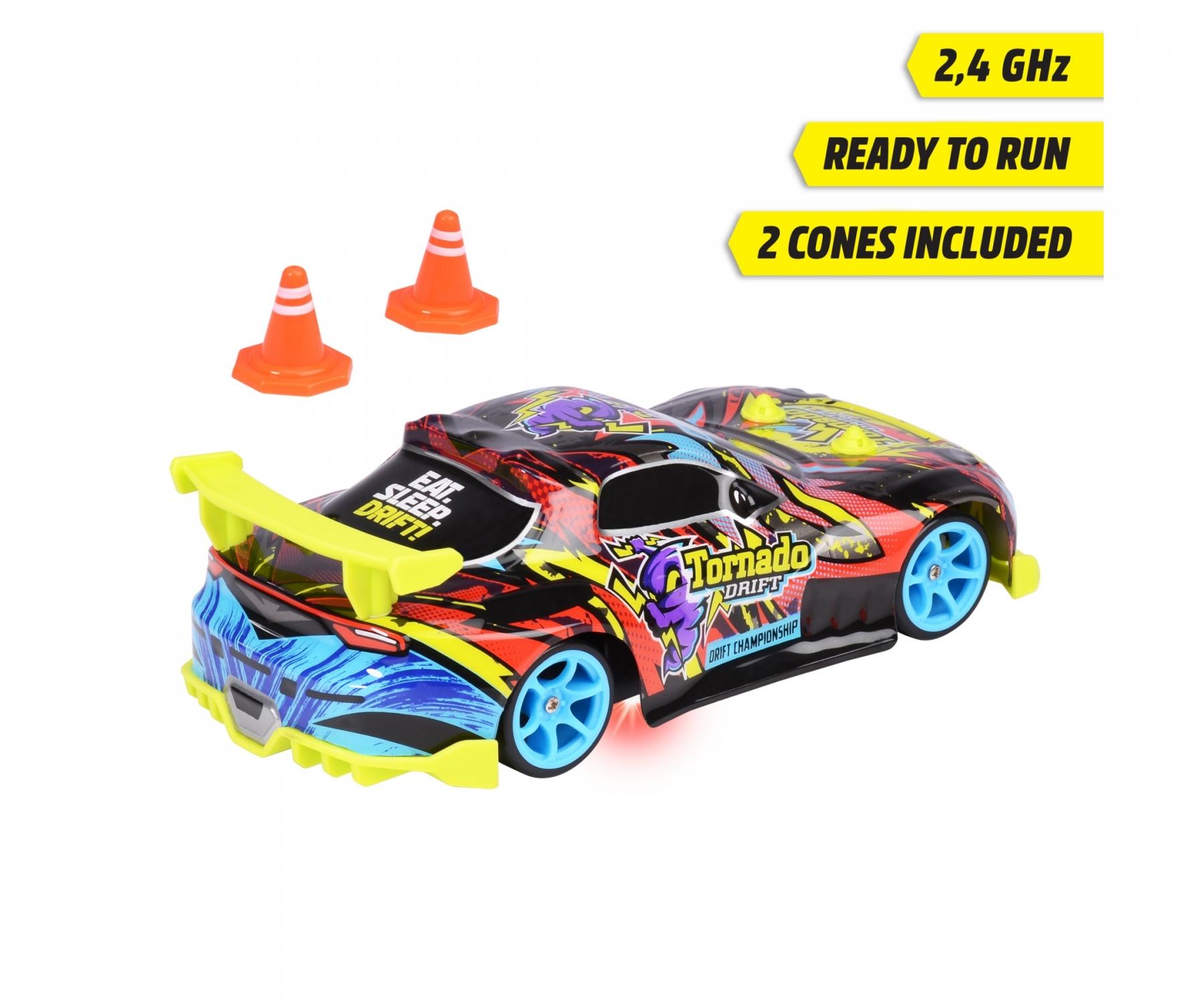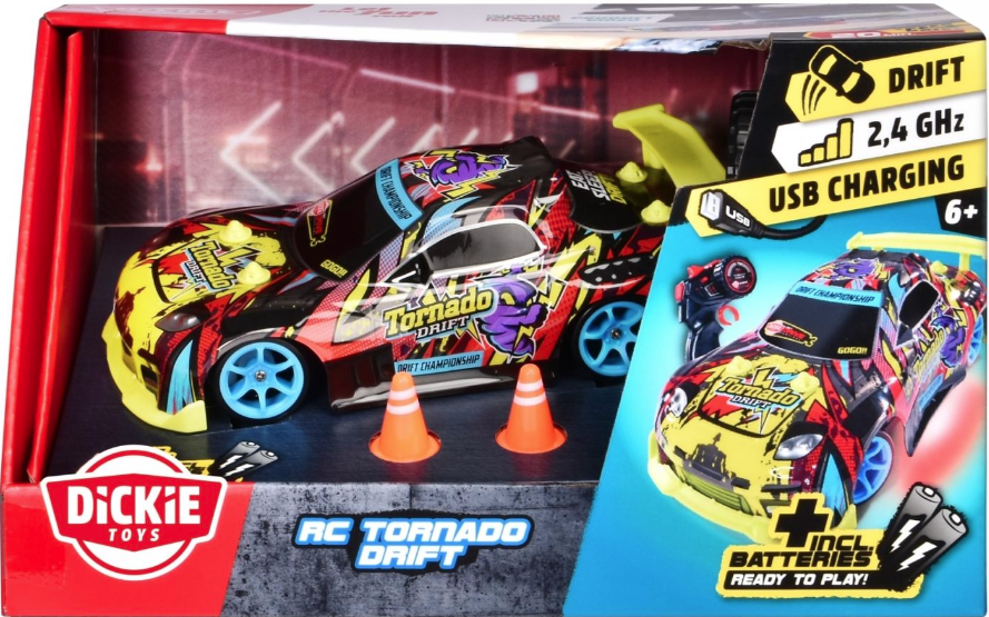 Masina de drift pentru copii - Curse pline de actiune si manevre rapide de drift: Aceasta masina RC Tornado cu telecomanda, cu tractiune integrala puternica si functie turbo, este garantata a fi vedeta spectacolului!Conceputa pentru copii cu varsta de 6 ani si peste, aceasta masina de curse de jucarie cu telecomanda este potrivita pentru utilizare in interior si in exterior. Telecomanda poate fi utilizata pentru a directiona vehiculul in toate directiile si a efectua manevre de drift cu o viteza de pana la 10 km/h.Telecomanda cu 2 canale (2,4 GHz pentru controlul simultan a pana la 16 vehicule), functie de incarcare USB, timp de incarcare: aprox. 60 de minute, timp de condus: aprox. 20 de minute, mod repaus, include baterii si baterie reincarcabila pentru vehiculTractiune integrala (4WD)Include 2 baterii AA de 1,5 V pentru telecomanda, 1 baterie reincarcabila Li-Fe de 3,2 V si 320 mAh in vehicul, 2 conuri