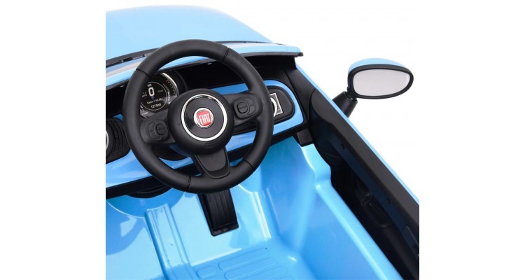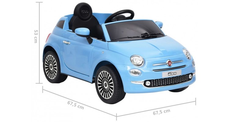 Culoare: Albastru Material: Plastic Dimensiuni: 113 x 67,5 x 53 cm (L x l x i) Greutate maxima suportata: 30 kg Viteza: 2-3 km/h Motor: 30 W Varsta recomandata: 3 - 6 ani Produs licentiat oficial de Fiat Cu telecomanda Include lumini frontale cu LED-uri si centura de siguranta Cu muzica si conexiune USB/SD Baterie necesara: 2 x baterie AA (nu sunt incluse) Asamblare necesara: Da Avertisment: Aceasta jucarie nu are frane. Avertisment: Bateriile trebuie manipulate de catre adulti. Necesita asamblarea de catre adulti. Avertisment: Este strict interzisa utilizarea pe partii sau la piscine si in zonele in care exista apa. Avertisment: Recomandat pentru 1 utilizator. Avertisment: Trebuie purtati pantofi in timpul utilizarii. AVERTISMENT: Contraindicat copiilor mai mici de 36 de luni. AVERTISMENT: Numai pentru uz domestic. AVERTISMENT: A se folosi sub directa supraveghere a unei persoane adulte. AVERTISMENT: A se utiliza cu echipament de protectie. A nu se utiliza in trafic. Aceasta masina electrica Fiat super cool, cu design emblematic, este o jucarie fantastica care va oferi copiilor dvs. o experienta exceptionala la plimbare. Este autorizata oficial de Fiat. Masina pentru plimbare este dotata cu un volan, un scaun jos, o centura de siguranta si un spatar proiectat ergonomic, care faciliteaza urcarea si coborarea. Aceasta masina pentru copii poate fi controlata prin intermediul unei telecomenzi de 2,4 GHz. Asadar, masina accelereaza incet si lin. In plus, masina electrica Fiat 500 este echipata cu un afisaj cu muzica, USB si cititor de carduri SD, oferind o experienta excelenta. Are, de asemenea, iluminare pe fata si pe spate.