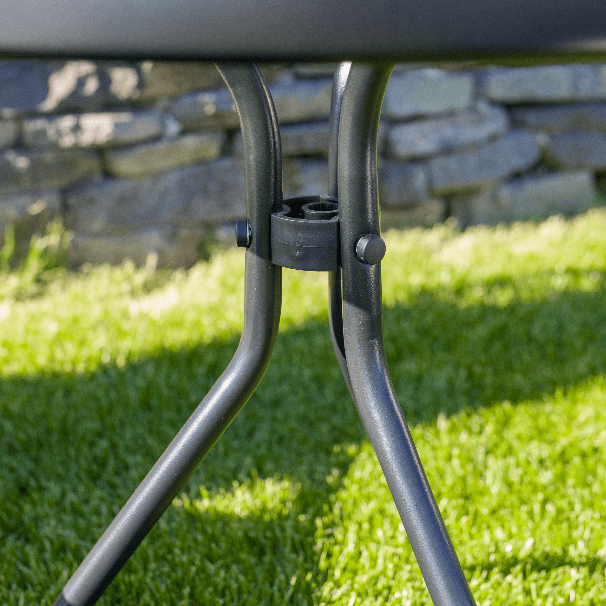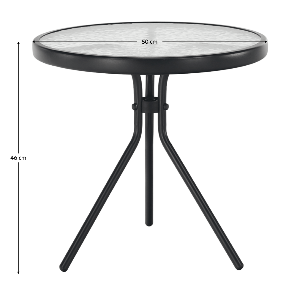 Masuta auxiliara potrivita pentru setul de gradina: Material: sticla/otel calitCuloare: transparenta/negruDimensiuni (diametrul x H): 50x46 cmStructura din otelSticla securizataStabilitatea este creata de trei picioareStil modernGradinaPotrivit pentru terasa, loggia, gradina