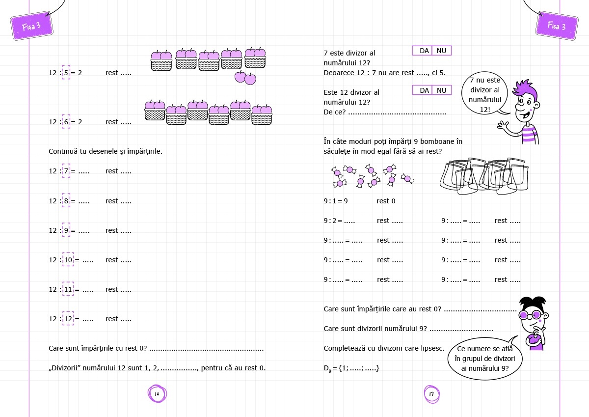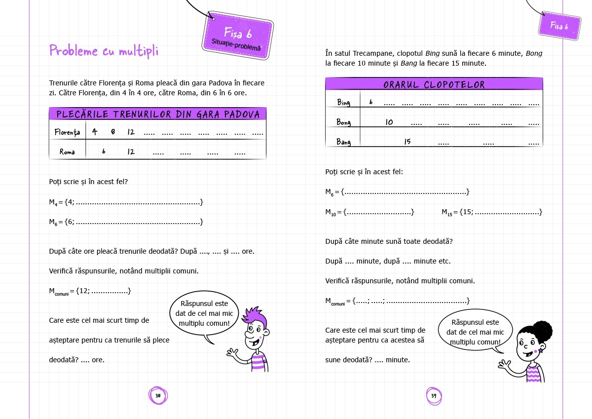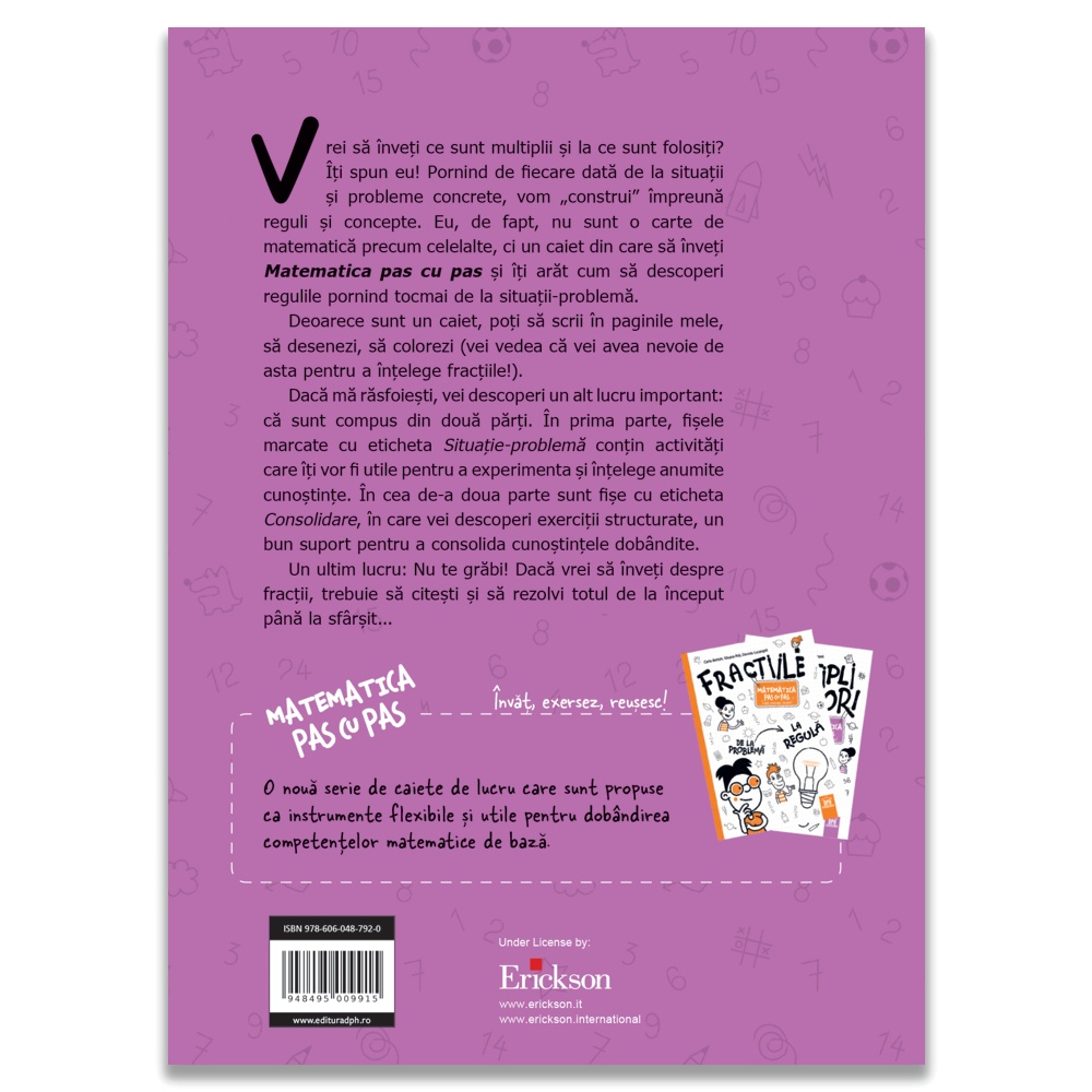 Titlul Multipli și Divizori este un material educativ interactiv destinat copiilor din ciclul primar, care facilitează înțelegerea conceptelor de multipli și divizori printr-o abordare intuitivă și practică. Pornind de la situații-problemă inspirate din viața de zi cu zi, copiii sunt ghidați pas cu pas să descopere regulile matematice, să înțeleagă metodele și să aplice conceptele în mod logic și creativ. Cartea este structurată în două părți: Prima parte oferă activități introductive, marcate ca Situații-problemă, pentru a construi cunoștințele de bază. A doua parte propune fișe de consolidare, concepute pentru a întări învățarea și a dezvolta competențele matematice. Caracteristici: Autor: Carla Bertolli, Silvana Poli, Daniela Lucangeli Pagini: 112 Mărimi: 20,5 x 29 Copertă: Necartonată Vârstă: 8 ani +