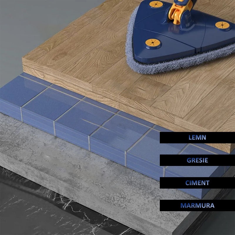Mop triunghiular, cu stoarcere si rezerva extra, pentru podele, geamuri sau alte suprafete, maner telescopic, albastru Mop multifunctional pentru suprafete uscate si ude, cap triunghiular rotativ 360°, stergator pentru geamuri, podele, pereti, mobila, laveta din microfibra, maner telescopic, albastru Mopul este potrivit pentru a curata cu usurinta podeaua, tavanul, peretii, faianta, mobila, geamurile etc. datorita capului triunghiular rotativ care patrunde in spatiile inguste, datorita manerului ajustabil si lavetei cu microfibre care are o putere mare de absorbtie. Se poate utiliza pe suprafete uscate, pentru a sterge praful sau pe suprafete umede pentru a le spala. Este potrivit pentru a sterge diverse suprafete cum ar fi: lemn, faianta, gresie, geam, marmura, ciment etc., fara a le zgaria. Puteti pune solutiile de curatat prin orificiile galbene de pe capul mopului, fara a fi nevoie sa folositi si galeata separat. Sistemul de stoarcere integrat va permite sa controlati nivelul de umiditate al lavetei, astfel incat sa puteti curata in profunzime fara a lasa urme de apa sau exces de umiditate pe suprafete. Laveta inclusa este confectionata din microfibra de inalta calitate, fiind astfel foarte absorbanta si capabila sa indeparteze murdaria si petele cu usurinta. Este detasabila si lavabila, economisand astfel bani pe termen lung. Manerul telescopic si capul rotativ (360°) faciliteaza curatenia si va permite sa accesati cu usurinta zonele inguste, colturile, zonele la inaltime sau cele de sub mobila etc. fara a depune efort prea mare. Lungime totala: 118 cmDiametru cap triunghiular: 26 cm