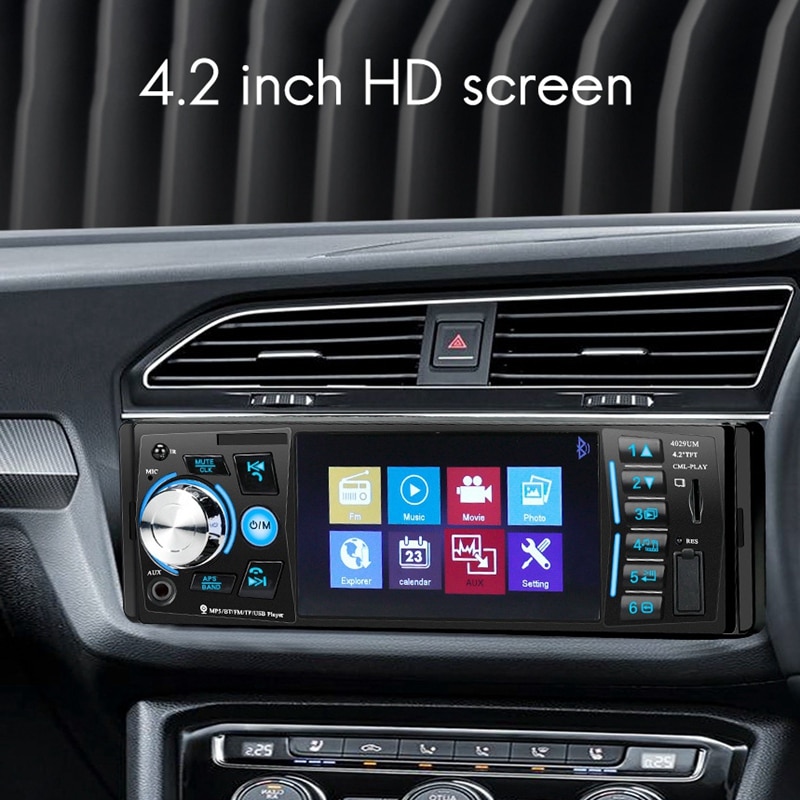 MP5 Player auto Bluetooth 4029UM, 4x60W, MP3, USB, AUX, FM Radio Bluetooth Auto, util pentru tine, avand functie hands-free pentru preluarea apelurilor, streaming wireless pentru muzica. Player-ul MP5 este dotat cu functia Bluetooth ce va permite efectuarea / preluarea apelurilor de pe telefon sau redarea fisierelor audio prin sistemul audio al autovehiculului. Cu ajutorul portului USB de iesire se poate incarca telefonul mobil sau alt dispozitiv USB. Aveti posibilitati multiple de a reda fisierele video, audio sau foto preferate. Se poate alege ce culoare doriti pentru iluminare, din meniu! Caracteristici: Ecran TFT de 4.2 inch Functie Bluetooth Microfon incorporat Ceas digital Rezolutie: 800 x 480 Accepta apeluri hands-free Redati filme Suport format video: RMVB / RM / FLV / 3GP / MPEG / DIVX / XVID / DAT / VOB / AVI / MP4 Suport format audio: MP3 / WMA / OGG / APE / AAC / FLAC / WAV Format imagine suport: JPG Material: Metal + plastic Dimensiuni partea din spate: 17.8 x 5 cm Lungime: 13.5 cm Dimensiuni parte fata cu ecran: 18.8 x 5.8 cm Continutul pachetului: 1 x player MP5 al vehiculului 1 x telecomanda 1 x kit cablu difuzor auto