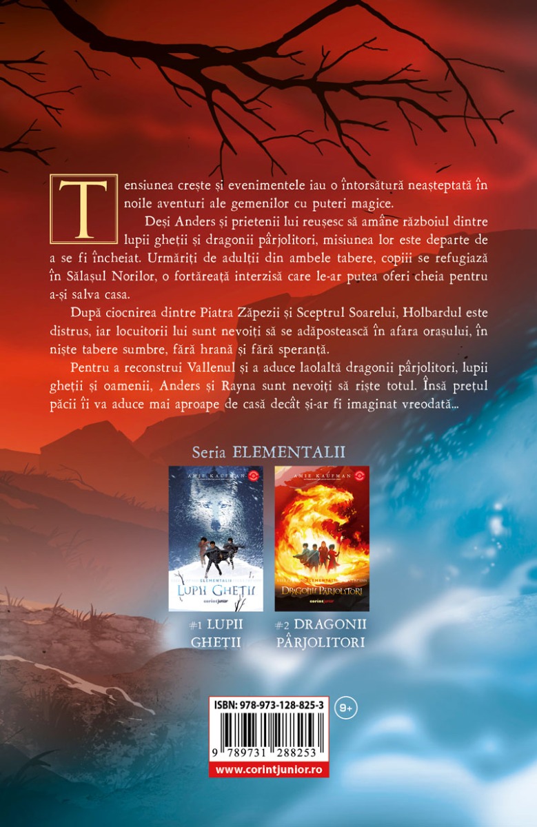 Tensiunea crește și evenimentele iau o întorsătură neașteptată în noile aventuri ale gemenilor cu puteri magice. Deși Anders și prietenii lui reușesc să amâne războiul dintre lupii gheții și dragonii pârjolitori, misiunea lor este departe de a se fi încheiat. Urmăriți de adulții din ambele tabere, copiii se refugiază în Sălașul Norilor, o fortăreață interzisă care le-ar putea oferi cheia pentru a-și salva casa. După ciocnirea dintre Piatra Zăpezii și Sceptrul Soarelui, Holbardul este distrus, iar locuitorii lui sunt nevoiți să se adăpostească în afara orașului, în niște tabere sumbre, fără hrană și fără speranță. Pentru a reconstrui Vallenul și a aduce laolaltă dragonii pârjolitori, lupii gheții și oamenii, Anders și Rayna sunt nevoiți să riște totul. Însă prețul păcii îi va aduce mai aproape de casă decât și-ar fi imaginat vreodată… „Unic și absolut fermecător; o cursă în ritm alert, fantastică, de la început până la sfârșit.” GREGORY FUNARO, autorul romanului Alistair Grim’s Odditorium „O poveste plină de bestii epopeice și de eroi cuceritori, care te va face să nu lași cartea din mână până târziu în noapte. Dacă ți-ai dorit vreodată să pornești într-o aventură, citește acest roman!” nMARIE LU, autoarea seriilor WARCROSS și TINERELE ELITE