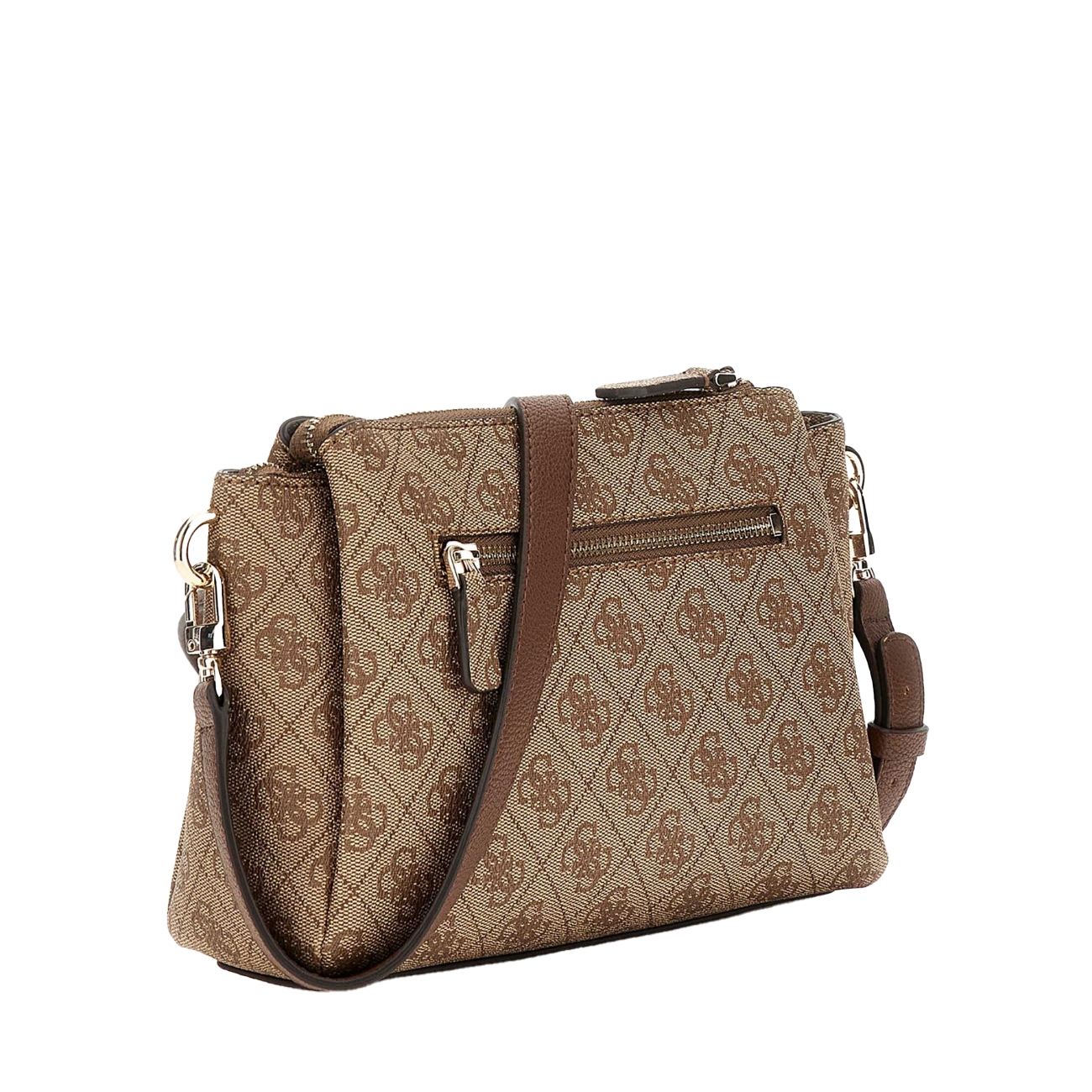 Geanta crossover Guess este confecționată din poliuretan 100% și se remarcă prin imprimeul său monogramat cu logo-ul în relief, specific brandului. Designul compact, dar bine compartimentat, include două buzunare principale cu închidere cu fermoar, fiind ideal pentru organizarea eficientă a obiectelor esențiale de zi cu zi.