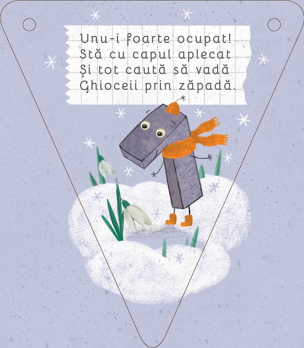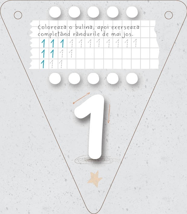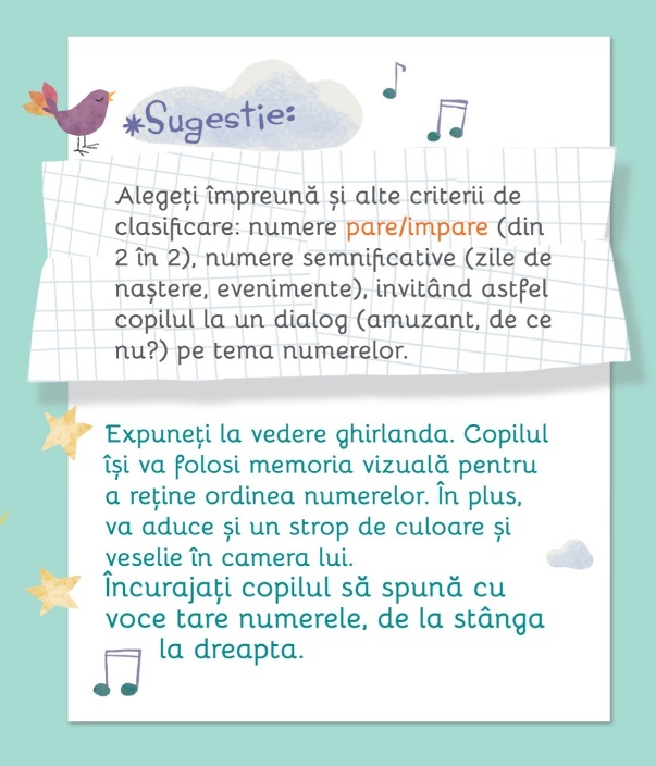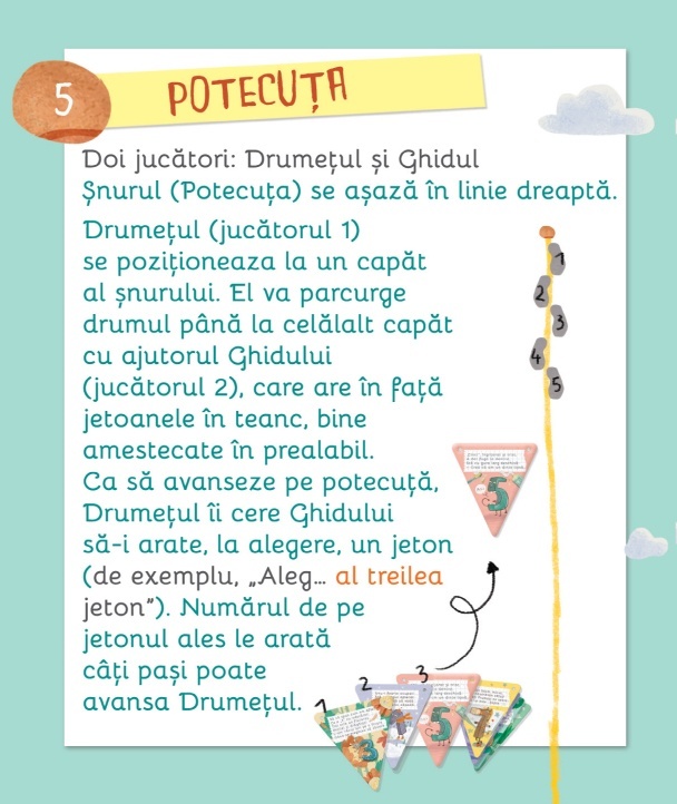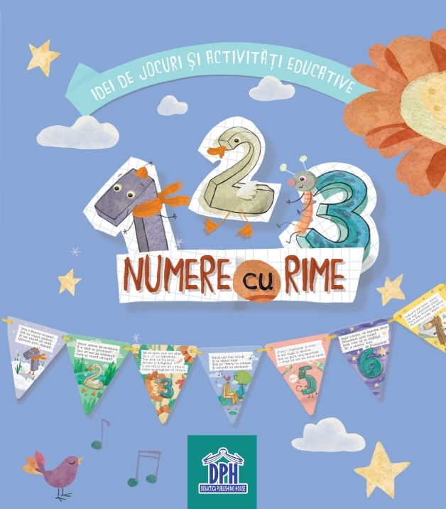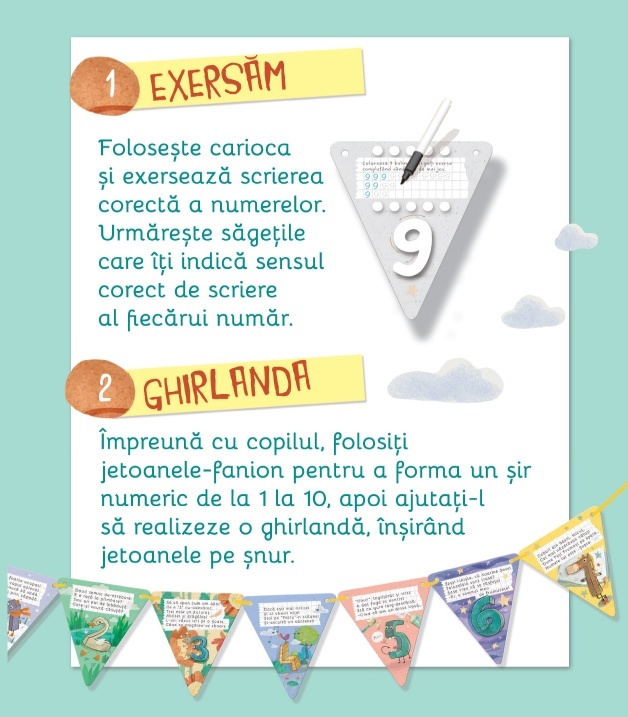 Idei de jocuri și activități educative: carduri – fanion cu numere illustrate și rime Pachetul conține: - 10 carduri – fanion cu numere de la 1 la 10 - Șnur pentru ghirlandă (2,5 m) - Cariocă - Broșură Caracteristici: Mărimi: - 10 jetoane (fanion) fata-verso – 10.5 x 12 cm finit; – o brosura (a cate 6 jetoane fata verso – stil armonica) – 63 x 12 cm finit – cutie: fata – 11.75 x 17.5 cm, grosime – 3 cm. Autor: Lavinia Trifan