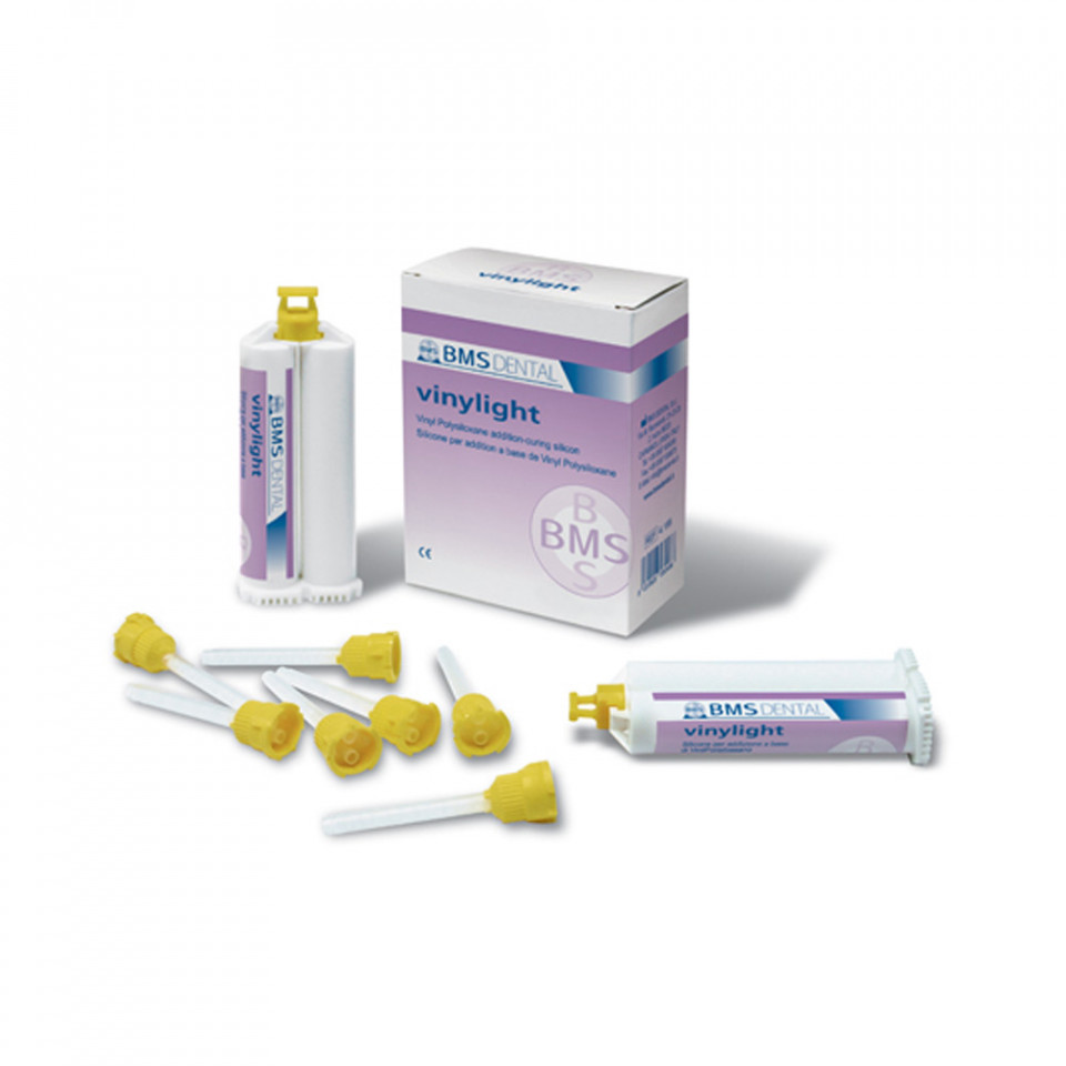 VINYLBEST Silicon de aditie polivinilsiloxan. VINYLBEST Putty Soft este un material standard de prima amprenta, chitos din gama VINYL putty. Consistentele compatibile ale bazei si catalizatorului asigura o malaxare rapida si facila. Material siliconic de adaos cu 2 niveluri de consistente si elasticitati. Indicatii - Pentru tehnica de corectie a amprentei. Avantaje: Reproducerea precisa a celor mai fine detalii; Tolerant la umiditate; Capacitate ridicata la revenire; Elasticitate optimizata; Duritate finala permanenta foarte mare. Prezentare - 300 ml baza, 300 ml catalizator. VINYLIGHT Avand la baza o formula avansata a vinilpolisiloxanilor, noul VINYLIGHT va da posibilitatea realizarii unei amprentari precise de prima data, fara compromisuri si implicit, de a obtine restaurari indirecte cu inchidere marginala perfecta. Realizat atat pentru tehnica de amprentare in doi timpi (tehnica de spalare) cat si pentru cea intr-un singur timp (monofazica) in dublu amestec, disponibil intr-o gama larga de vascozitati – de la chitos la fluid – VINYLIGHT este un material potrivit pentru orice tip de amprenta. Materialul de consistenta chitoasã VINYLIGHT este disponibil atat in cartuse pentru malaxare si dozare automata cu ajutorul echipamentului cat si in varianta de amestecare manuala. Materialele fluide – disponibile in doua variante: cu priza normala si cu priza rapida – se amesteca si dozeaza cu ajutorul dispenserului . Ideal atat pentru medicii dentisti cat si pentru tehnicienii dentari Materialele de amprenta polivinilsiloxan VINYL sunt excelente pentru obtinerea amprentelor de mare fidelitate si a restaurarilor indirecte corecte, cu adaptare marginala perfecta – beneficii majore pentru medicii dentisti, tehnicienii dentari si pacienti. PREZENTARE - 2 x 50 ml cartuse, 12 virfuri mixatoare.