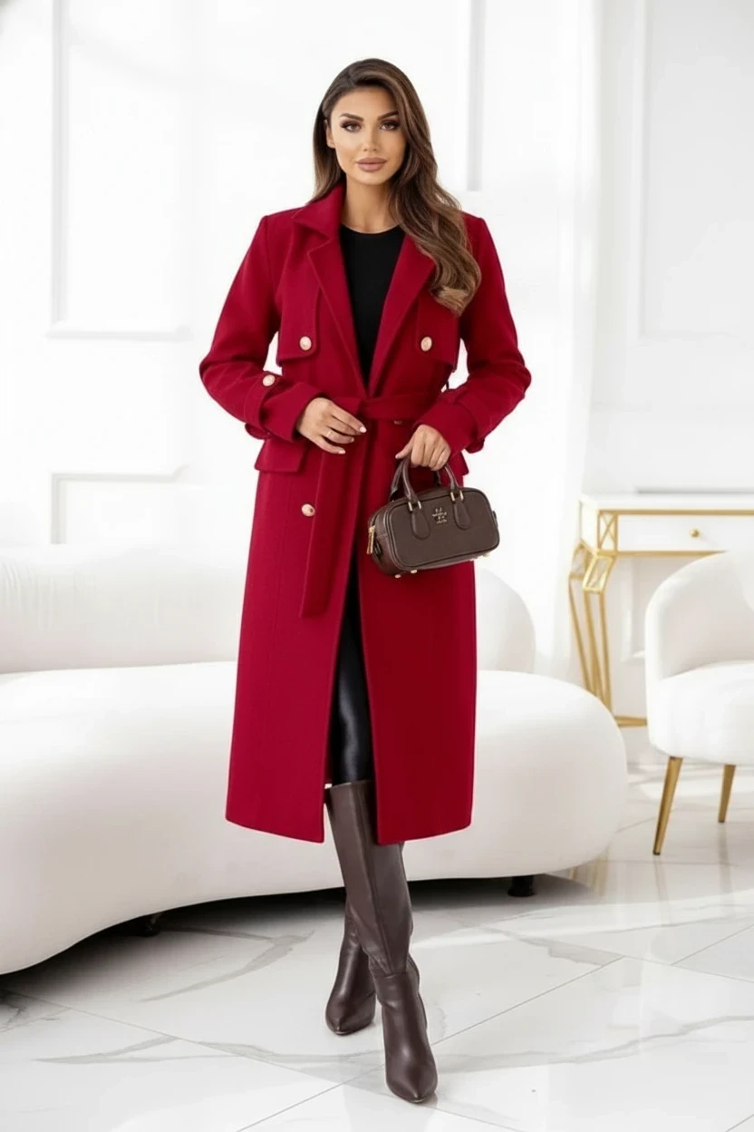 Palton rosu elegant cu cordon si nasturi aurii, o piesa statement care aduce un plus de stil si energie tinutelor de sezon rece. Confectionat dintr-un material gros si placut la atingere, paltonul ofera confort termic excelent, mentinand in acelasi timp o
