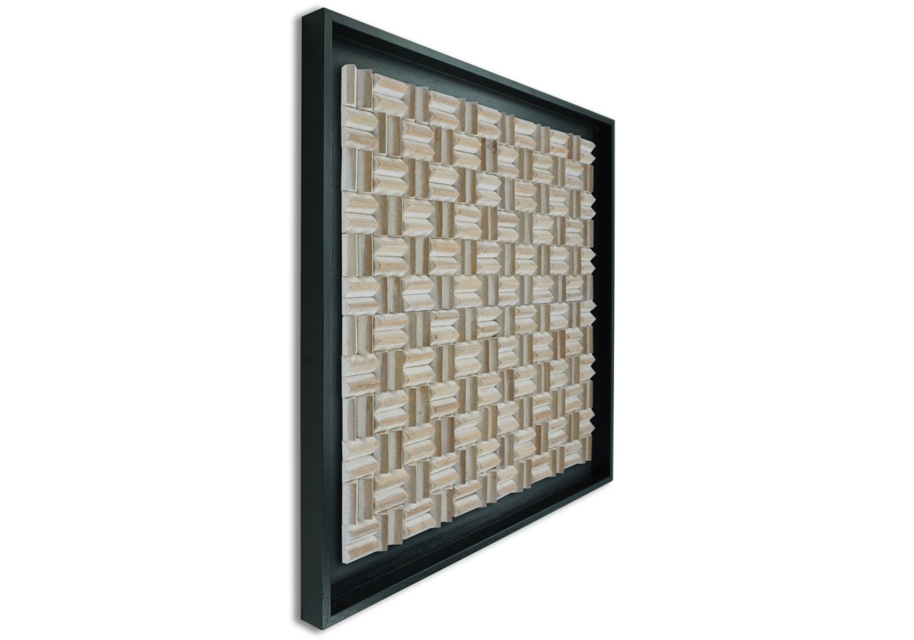 La Nature at Home găsești o colecție unică de obiecte decorative de perete. Decorațiunile noastre 3D sunt realizate din materiale naturale reciclate, înrămate în cadre albe sau negre de 55 x 55 cm sau 100x100 cm. Modelele din lemn sunt compuse din fâșii subțiri de lemn ce creează un amestec armonios de nuanțe albe și tonuri naturale. Fiecare bucată de lemn de tec are o lungime de 420 mm, cu lățime și grosime variabile, ceea ce oferă unicitate fiecărui panou. Panoul este montat într-o ramă albă sau neagra cudimensiuni de 55 x 55 cm sau 100x100 cm, cu margini înălțate pentru un efect tridimensional accentuat. Produsul vine însoțit de un sistem practic de agățare, gata de montat pe peretele tău.